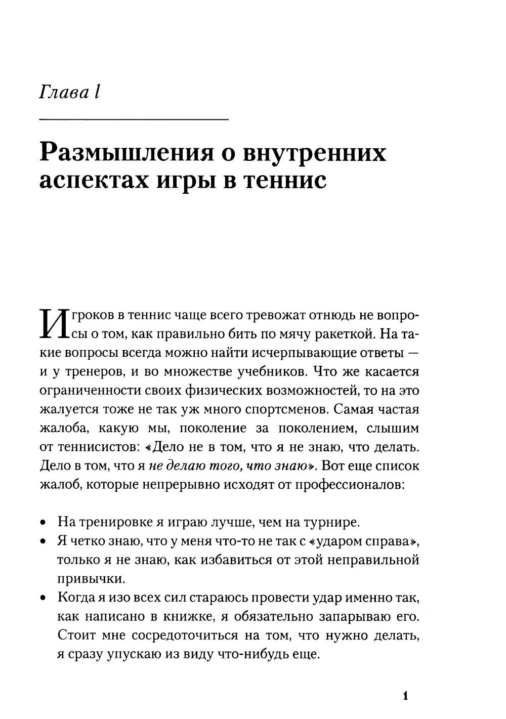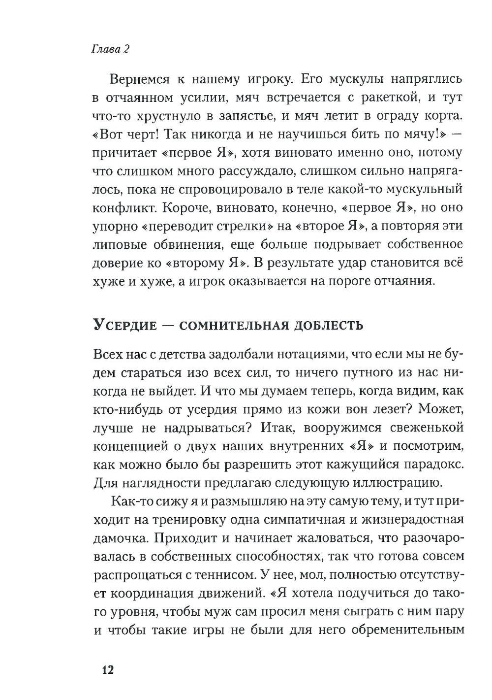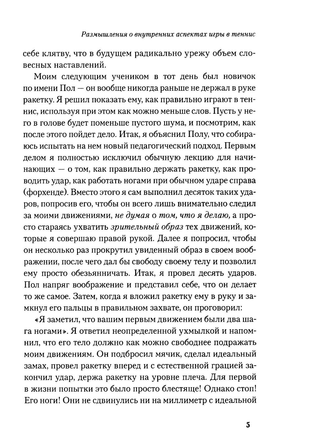 Любая игра состоит из двух элементов - «внешней игры» и «внутренней игры». «Внешнюю игру» ведут с внешним противником, в ходе ее преодолевают внешние препятствия и достигают определенных внешних целей. «Внутренняя игра» происходит в сознании игрока, в ней преодолевают такие препятствия, как неспособность сосредоточиться, нервозность, неуверенность в себе и самоосуждение. Тимоти У. Гэллуэй утверждает: вы не добьетесь ни в какой игре ни совершенства, ни радости, если не обратите должного внимания на неприметные хитрости «внутренней игры», цель которой - раскрытие и реализация потенциала, кроющегося внутри вашего тела. В этой книге он рассказывает о возможностях «внутренней игры» на примере игры в теннис.| Издательство | Олимп-Бизнес |