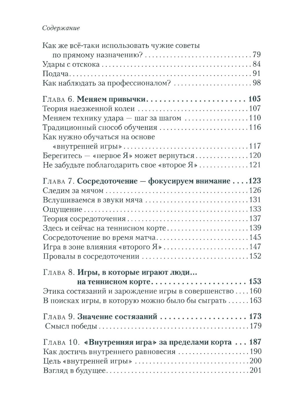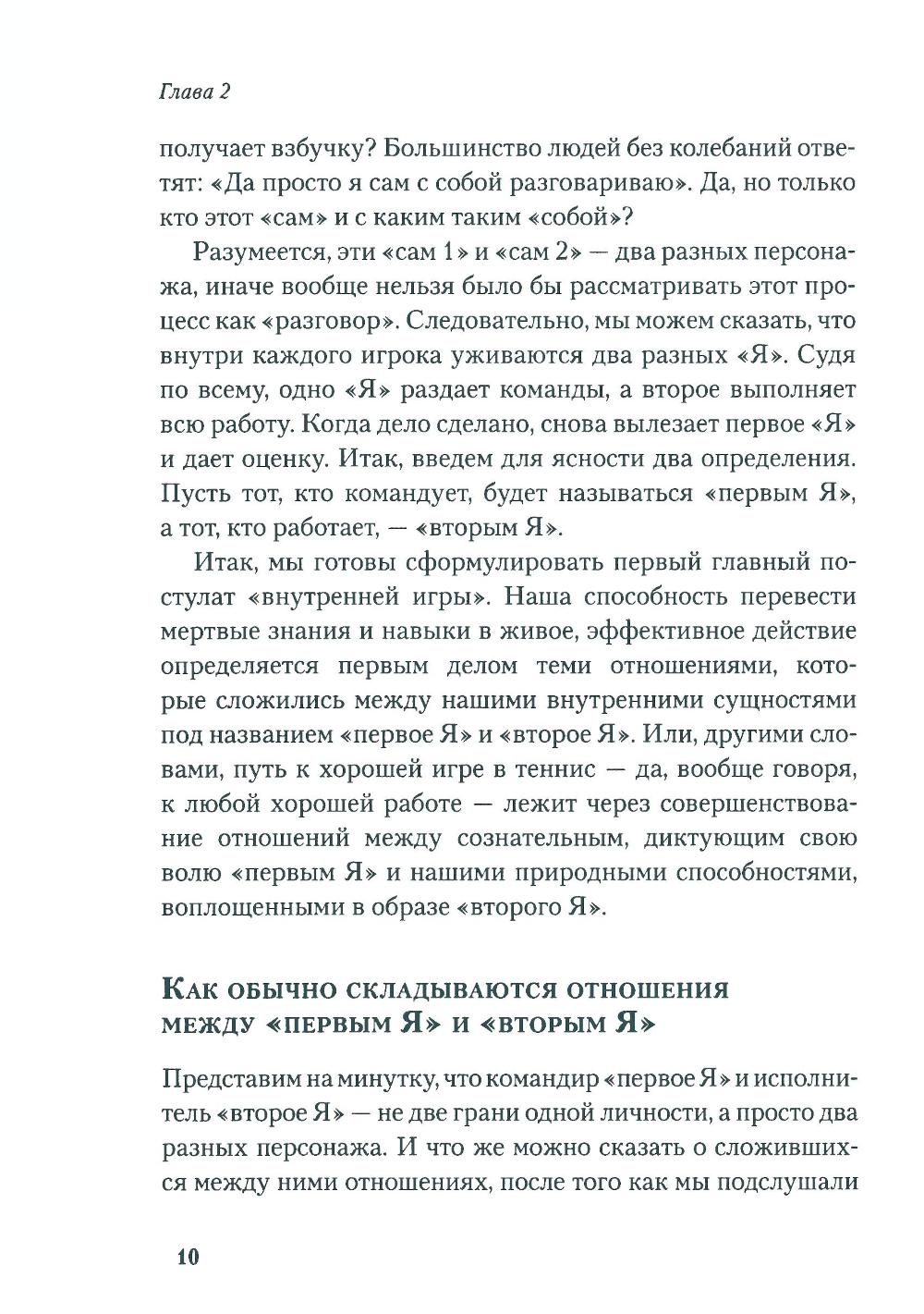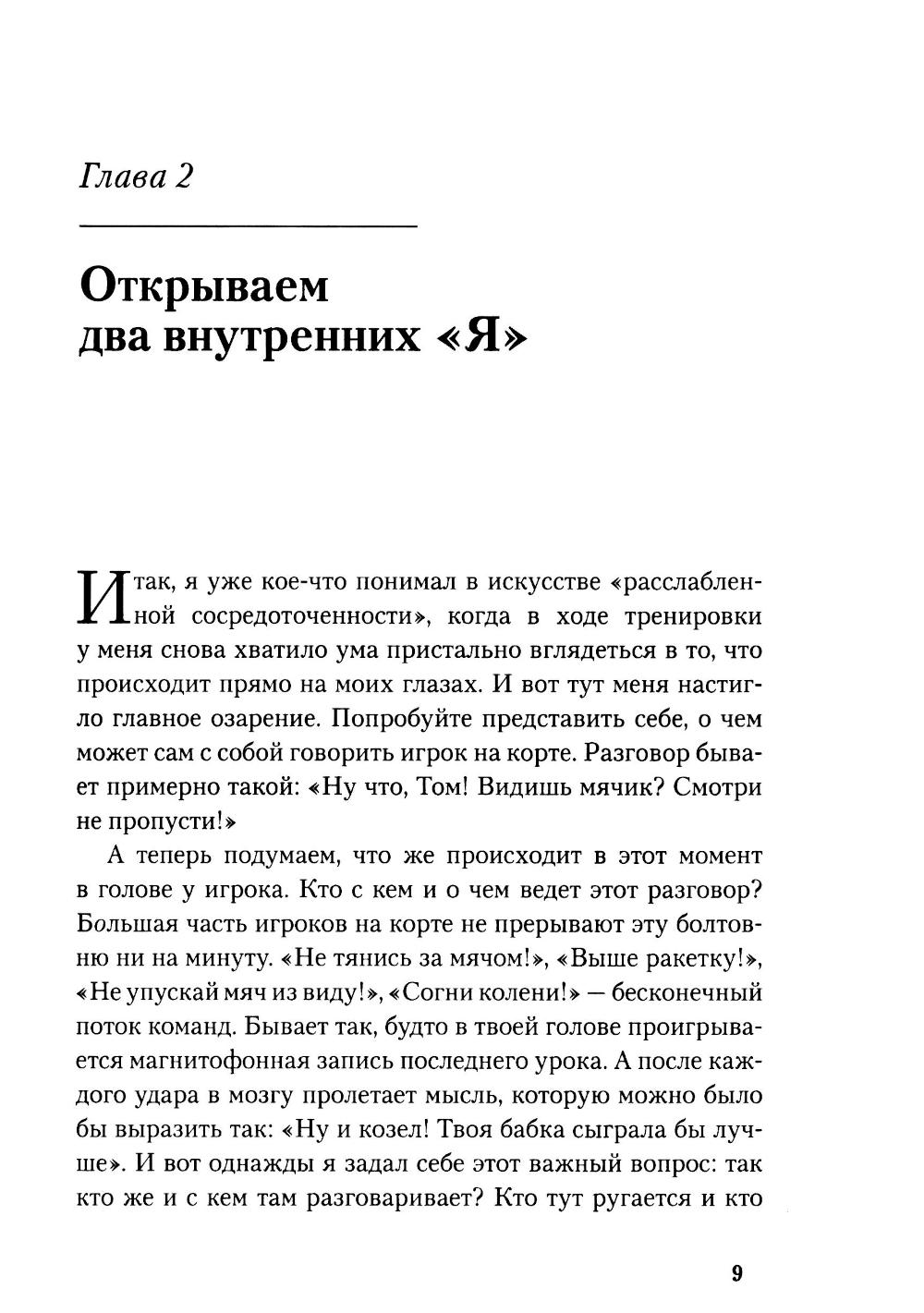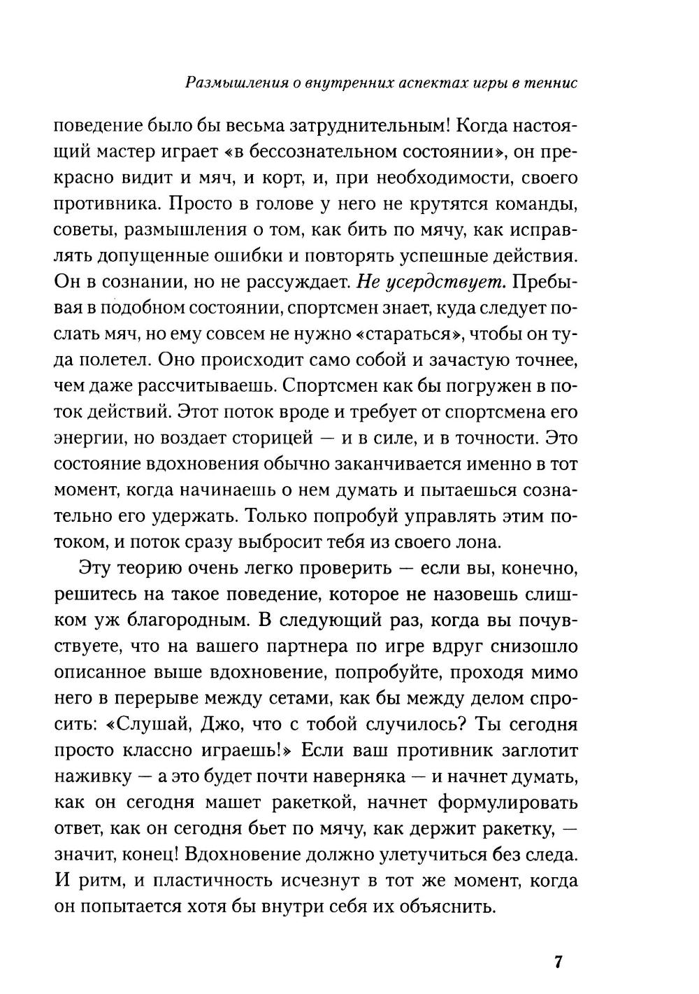 Любая игра состоит из двух элементов - «внешней игры» и «внутренней игры». «Внешнюю игру» ведут с внешним противником, в ходе ее преодолевают внешние препятствия и достигают определенных внешних целей. «Внутренняя игра» происходит в сознании игрока, в ней преодолевают такие препятствия, как неспособность сосредоточиться, нервозность, неуверенность в себе и самоосуждение. Тимоти У. Гэллуэй утверждает: вы не добьетесь ни в какой игре ни совершенства, ни радости, если не обратите должного внимания на неприметные хитрости «внутренней игры», цель которой - раскрытие и реализация потенциала, кроющегося внутри вашего тела. В этой книге он рассказывает о возможностях «внутренней игры» на примере игры в теннис.| Издательство | Олимп-Бизнес |