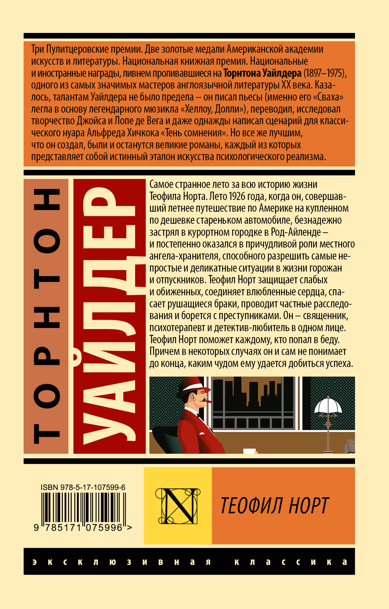 - От автора романов «Мартовские иды» и «Мост короля Людовика Святого». - Писатель, драматург и сценарист Торнтон Уайлдер - трехкратный обладатель Пулитцеровской премии и один из самых значимых американских авторов середины XX века. - Последний роман Торнтона Уайлдера. - В 1988 году роман «Теофил Норт» был экранизирован, главную роль сыграл американский актер Энтони Эдвардс. - Издание в серии «Эксклюзивная классика» - в удобном карманном формате и узнаваемом оформлении.| Издательство | Издательство "АСТ" |
