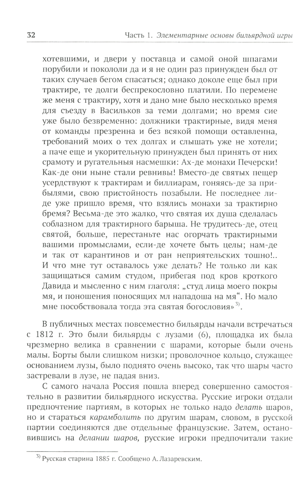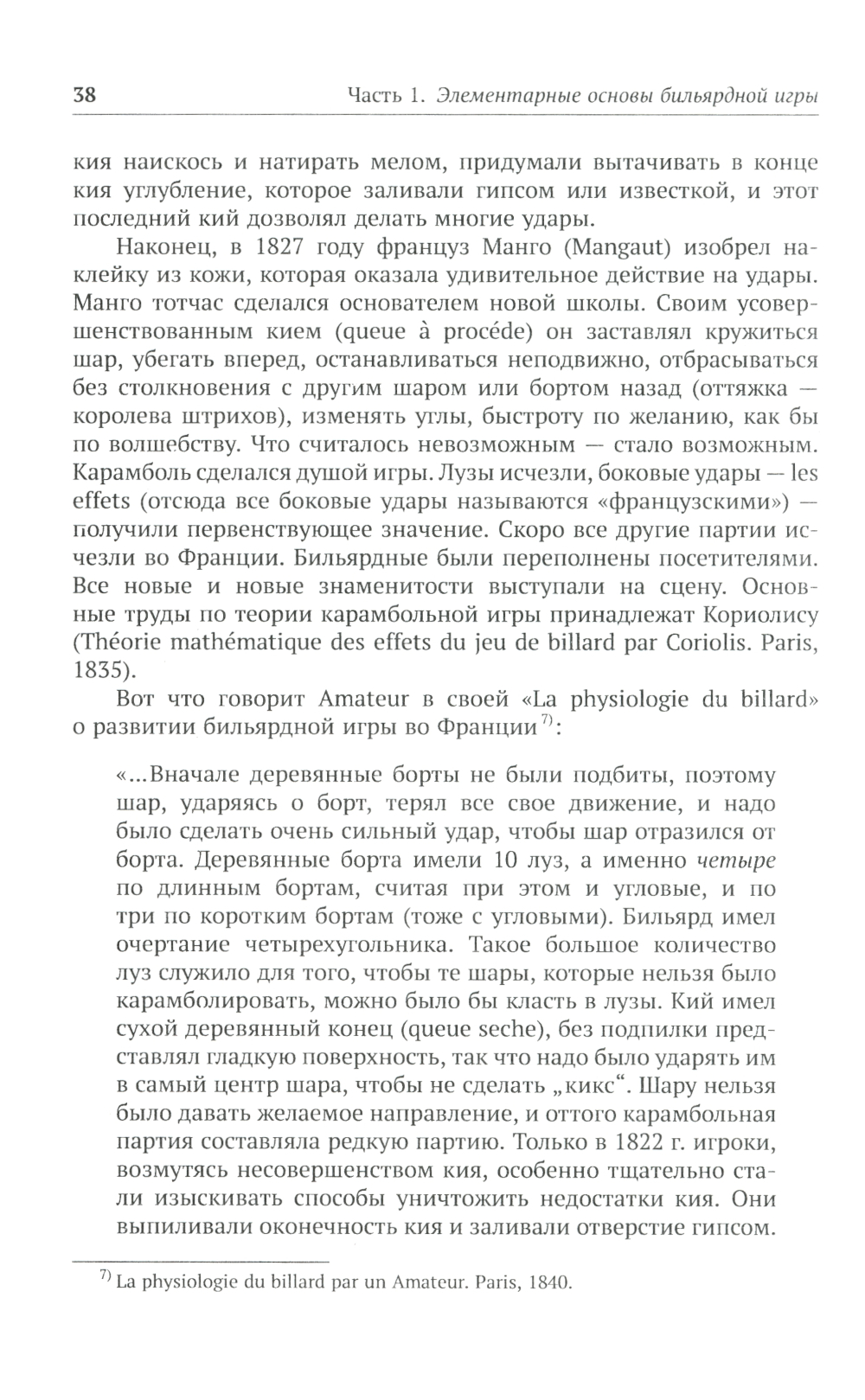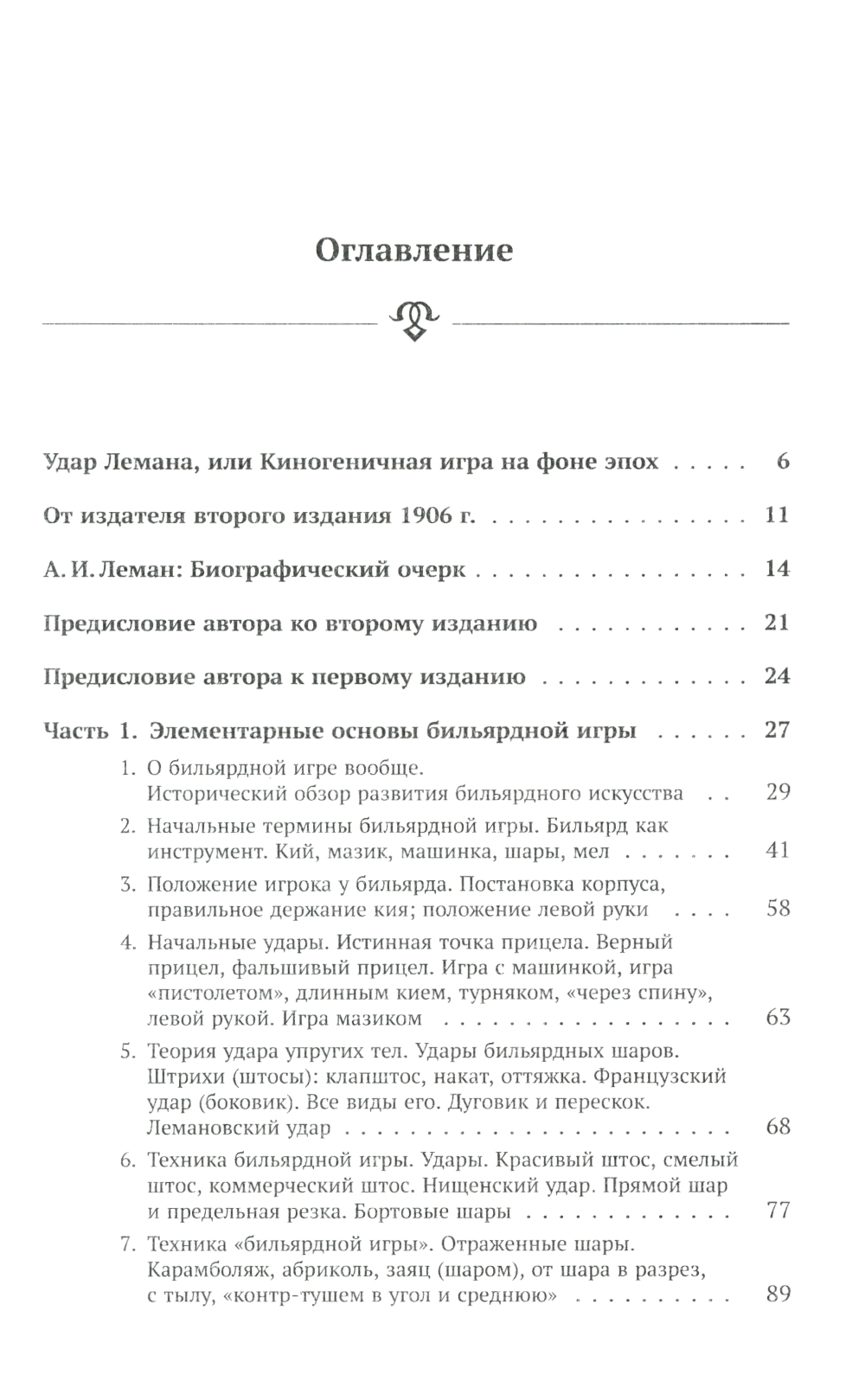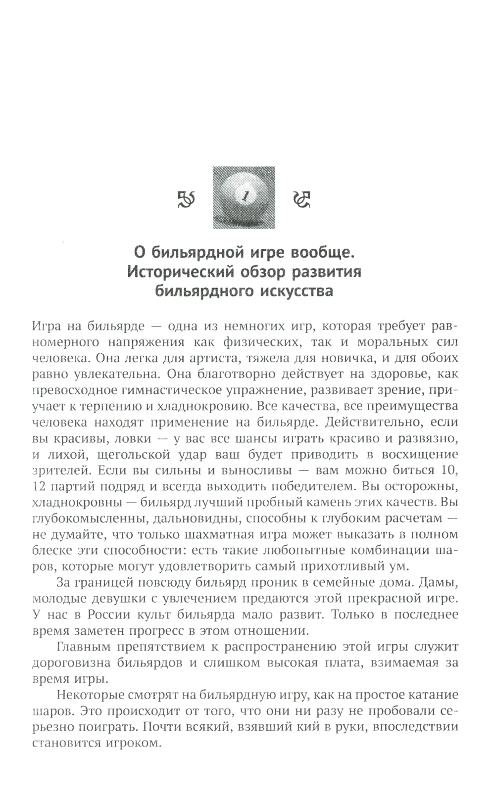 Перед читателями - выдающийся труд, ставший классическим учебником по бильярдному спорту и, в более широком смысле, искусству игры в бильярд. И хотя он был создан во второй половине XIX века, по широте охвата материала, яркому языку и строгому стилю изложения он и в наше время может считаться непревзойденным руководством. Автор книги, писатель и игрок в бильярд Анатолий Иванович Леман шаг за шагом, страница за страницей раскрывает технику бильярдной игры, объясняет удар за ударом, приводит массу примеров, не затрудняясь при объяснении самых сложных положений. Большой интерес для знатоков и любителей представляют составленные автором бильярдные задачи с приложенными к ним решениями. Книга рекомендуется всем интересующимся игрой в бильярд, в том числе профессионалам бильярдного спорта и тем, кто только начинает свой путь в этой замечательной игре.| Издательство | ЛЕНАНД |