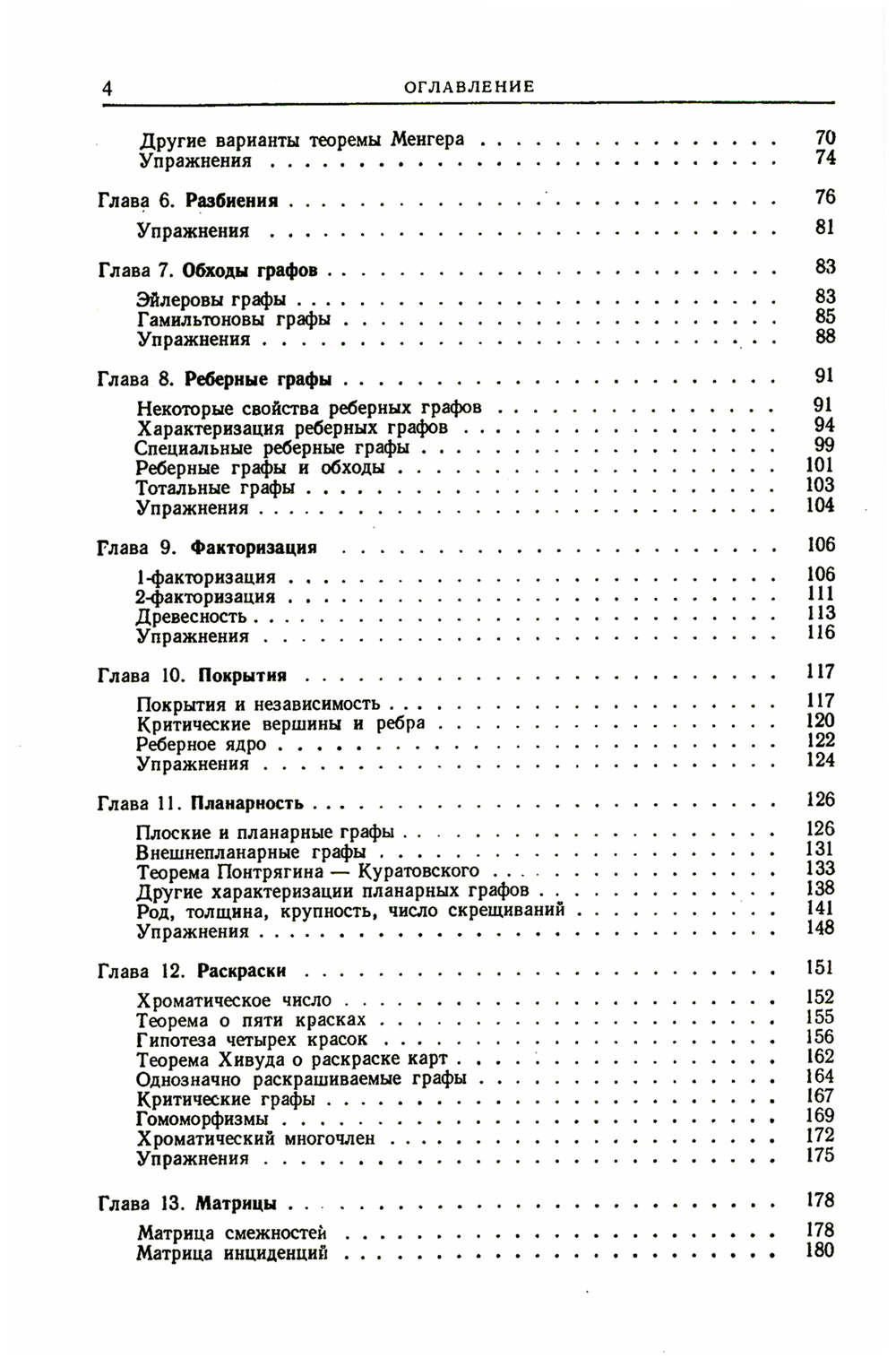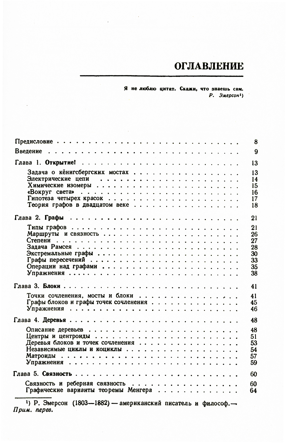 В последнее время теория графов привлекает все более пристальное внимание специалистов различных областей знания. Наряду с традиционными применениями ее в таких науках, как физика, электротехника, химия, она проникла и в науки, считавшиеся раньше далекими от нее, - экономику, социологию, лингвистику и др. Давно известны тесные контакты теории графов с топологией, теорией групп и теорией вероятностей. Особенно важная взаимосвязь существует между теорией графов и теоретической кибернетикой (особенно теорией автоматов, исследованием операций, теорией кодирования, теорией игр). Широко используется теория графов при решении различных задач на вычислительных машинах. Предлагаемая книга написана видным специалистом по дискретной математике. Несмотря на небольшой объем и конспективный характер изложения, книга, в свое время достаточно полно осветившая состояние теории графов, и в настоящий момент не утратила актуальности. Она, безусловно, будет полезна студентам университетов и технических вузов и, несомненно, заинтересует широкие круги научных работников, занимающихся приложениями дискретной математики.