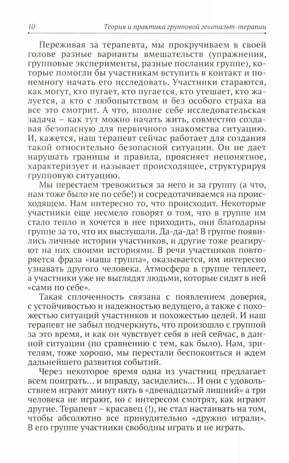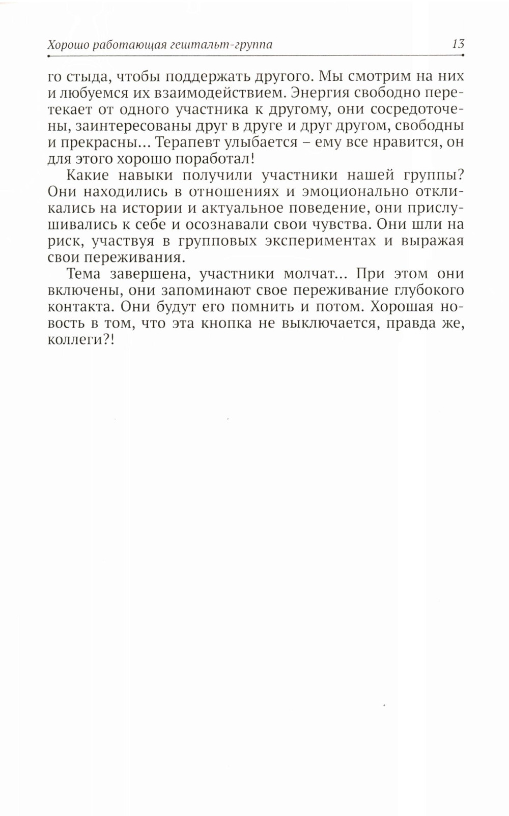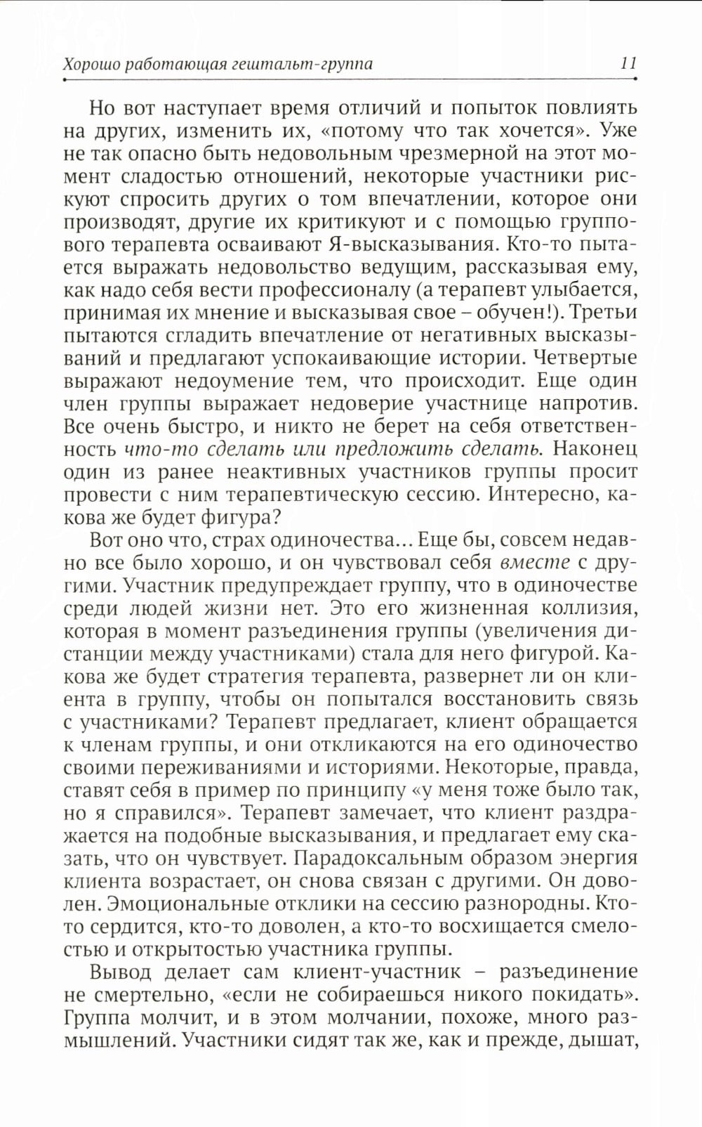 Из перспективы теории поля группа рассматривается как фасилитирующая среда, обеспечивающая возможность роста для каждого индивидуума [9, 10]. История жизни группы обеспечивает «фон», на котором возникают и осмысливаются групповые события, периодически становящиеся «фигурой». Чаще всего это особенности поведения участников группы. Групповые сессии, особенно в продолжающейся достаточно длительное время группе, не являются изолированными, и история группы нередко является частью ее жизни «здесь и сейчас». Групповые гештальты возникают как ответ группы на изменяющиеся условия поля внутри и вне групповых границ. Такие паттерны связаны с особенностями групповой ситуации, внешними условиями, особенностями большинства членов группы (превалирующие хронизированные механизмы регуляции границ) и т.п. Занимая феноменологическую позицию, групповой терапевт следит за развитием группы. Однако в этой модели, в отличие от стадийной, он не фокусируется на том, проходит ли группа «положенные» стадии развития. С позиции теории поля группа не обязательно двигается к сплоченности, иное движение будет в той же степени пригодным для работы осознавания. Такая позиция уменьшает соблазн подталкивать групповой процесс (или интерпретировать происходящее) в «правильном» для терапевта направлении.| Издательство | БахраХ-М |