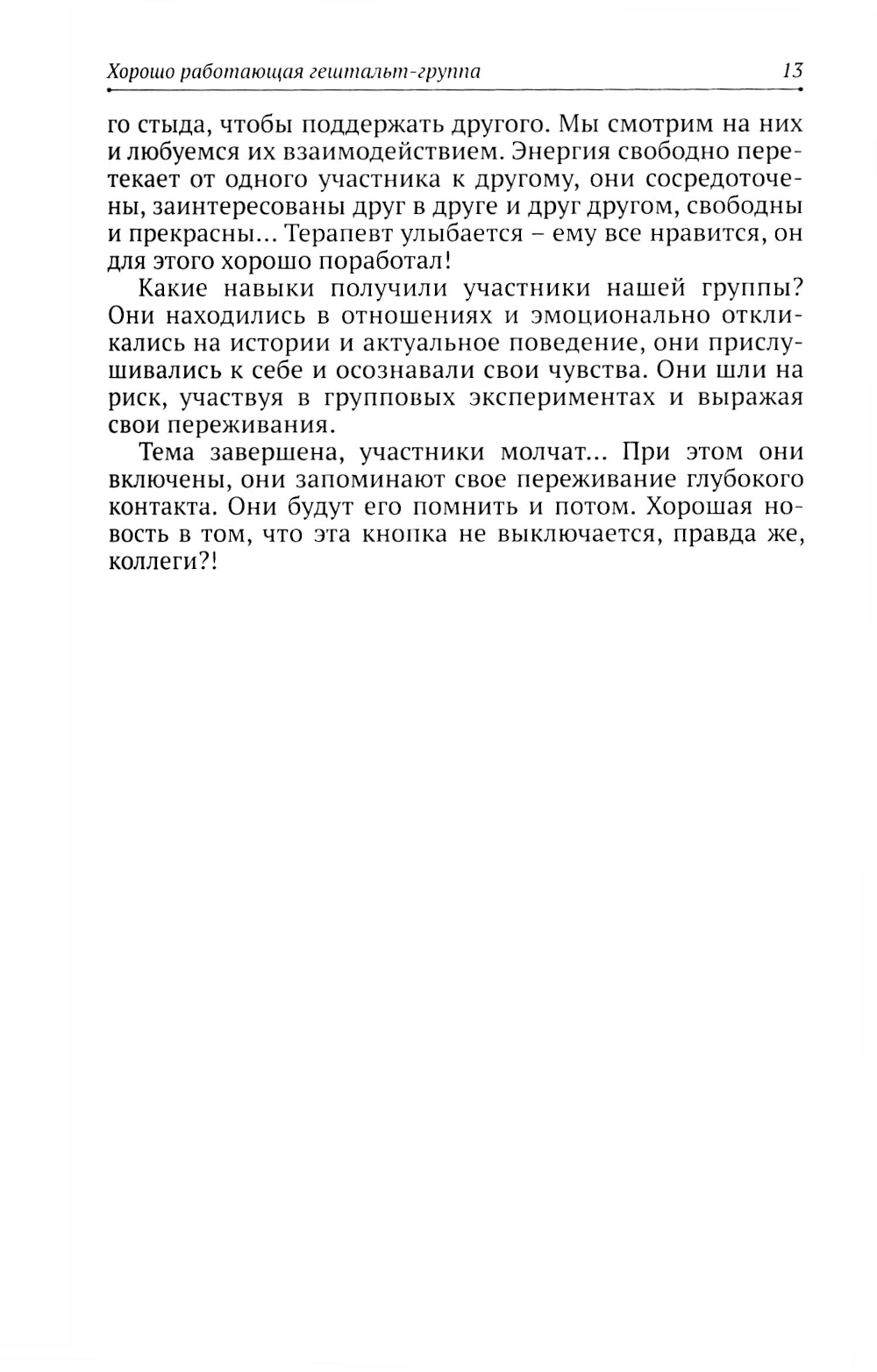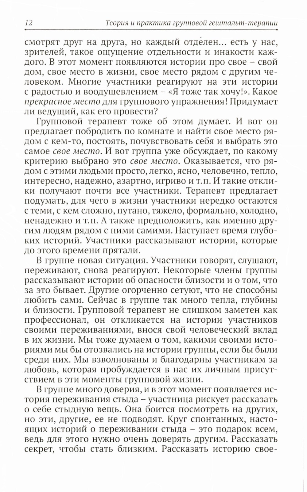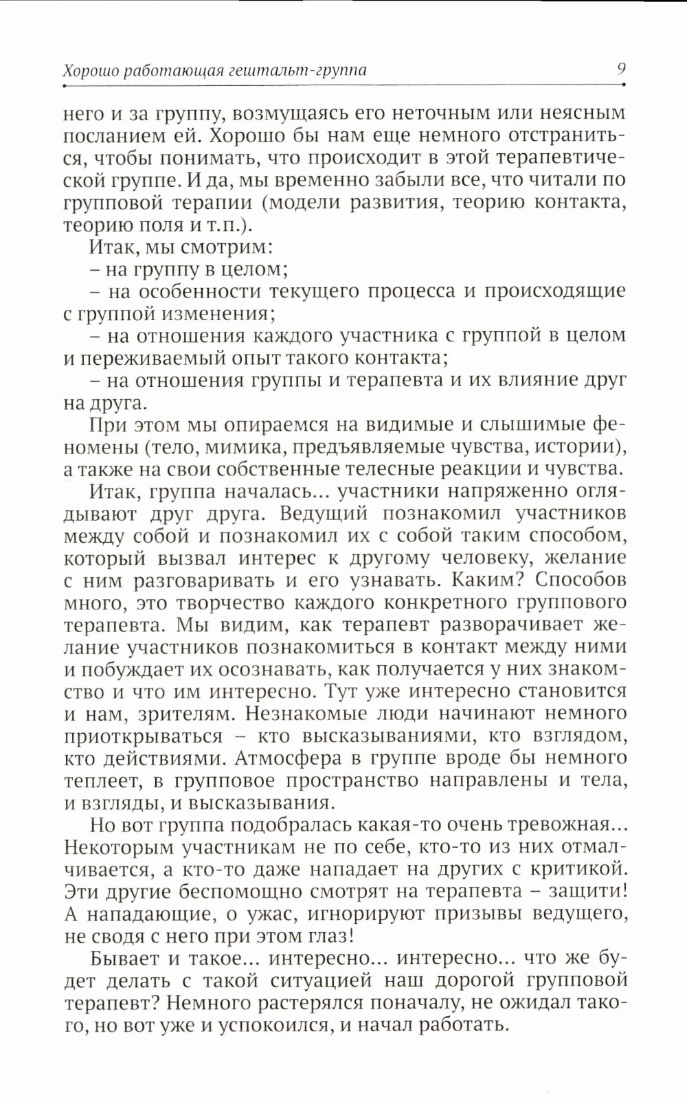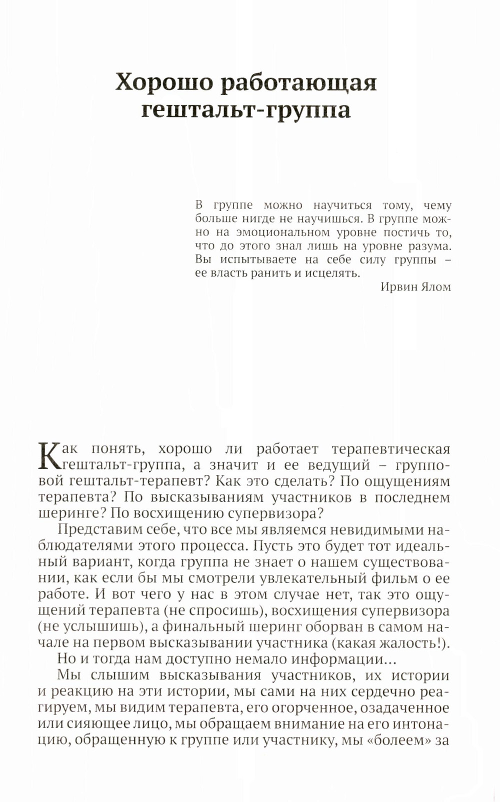 Из перспективы теории поля группа рассматривается как фасилитирующая среда, обеспечивающая возможность роста для каждого индивидуума [9, 10]. История жизни группы обеспечивает «фон», на котором возникают и осмысливаются групповые события, периодически становящиеся «фигурой». Чаще всего это особенности поведения участников группы. Групповые сессии, особенно в продолжающейся достаточно длительное время группе, не являются изолированными, и история группы нередко является частью ее жизни «здесь и сейчас». Групповые гештальты возникают как ответ группы на изменяющиеся условия поля внутри и вне групповых границ. Такие паттерны связаны с особенностями групповой ситуации, внешними условиями, особенностями большинства членов группы (превалирующие хронизированные механизмы регуляции границ) и т.п. Занимая феноменологическую позицию, групповой терапевт следит за развитием группы. Однако в этой модели, в отличие от стадийной, он не фокусируется на том, проходит ли группа «положенные» стадии развития. С позиции теории поля группа не обязательно двигается к сплоченности, иное движение будет в той же степени пригодным для работы осознавания. Такая позиция уменьшает соблазн подталкивать групповой процесс (или интерпретировать происходящее) в «правильном» для терапевта направлении.| Издательство | БахраХ-М |
