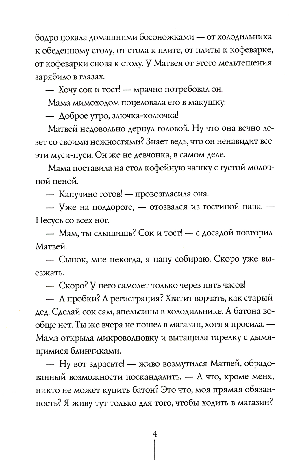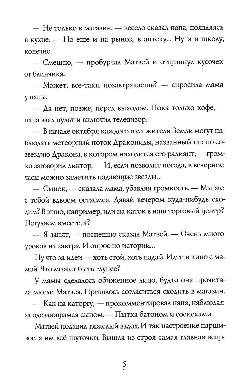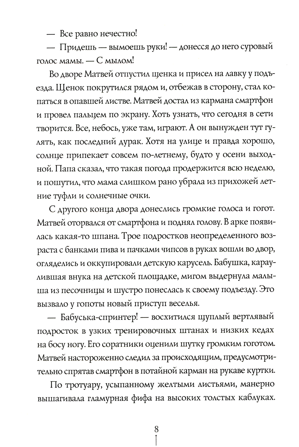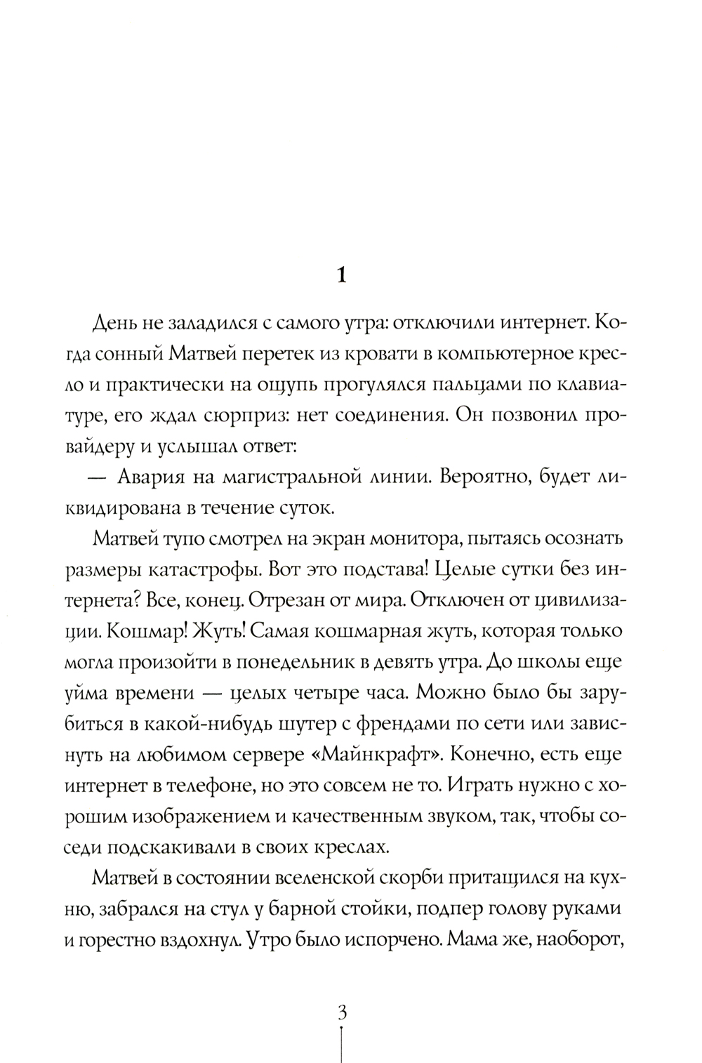 «Назад в будущее», говорите? «Назад в свою вероятность» - задача куда сложнее! И решать ее Матвею предстоит в одиночку - ведь все началось поздним вечером, когда он на минуту вышел из дома и наткнулся на местных хулиганов… Тот понедельник вообще не заладился: утром отключили интернет, в школе оставили после уроков, а потом мама огорошила ужасной новостью - с ними теперь будет жить чужая девчонка! Как мог закончиться такой день? Бегством от трех бандитов, мечтающих отобрать у Матвея телефон; поездкой в полупустом автобусе на окраину города; отчаянной попыткой спрятаться в заброшенной бетонной трубе. И попаданием в альтернативную вселенную, где никакого Матвея Добровольского не существует, а вместо него - девчонка по имени Милослава!