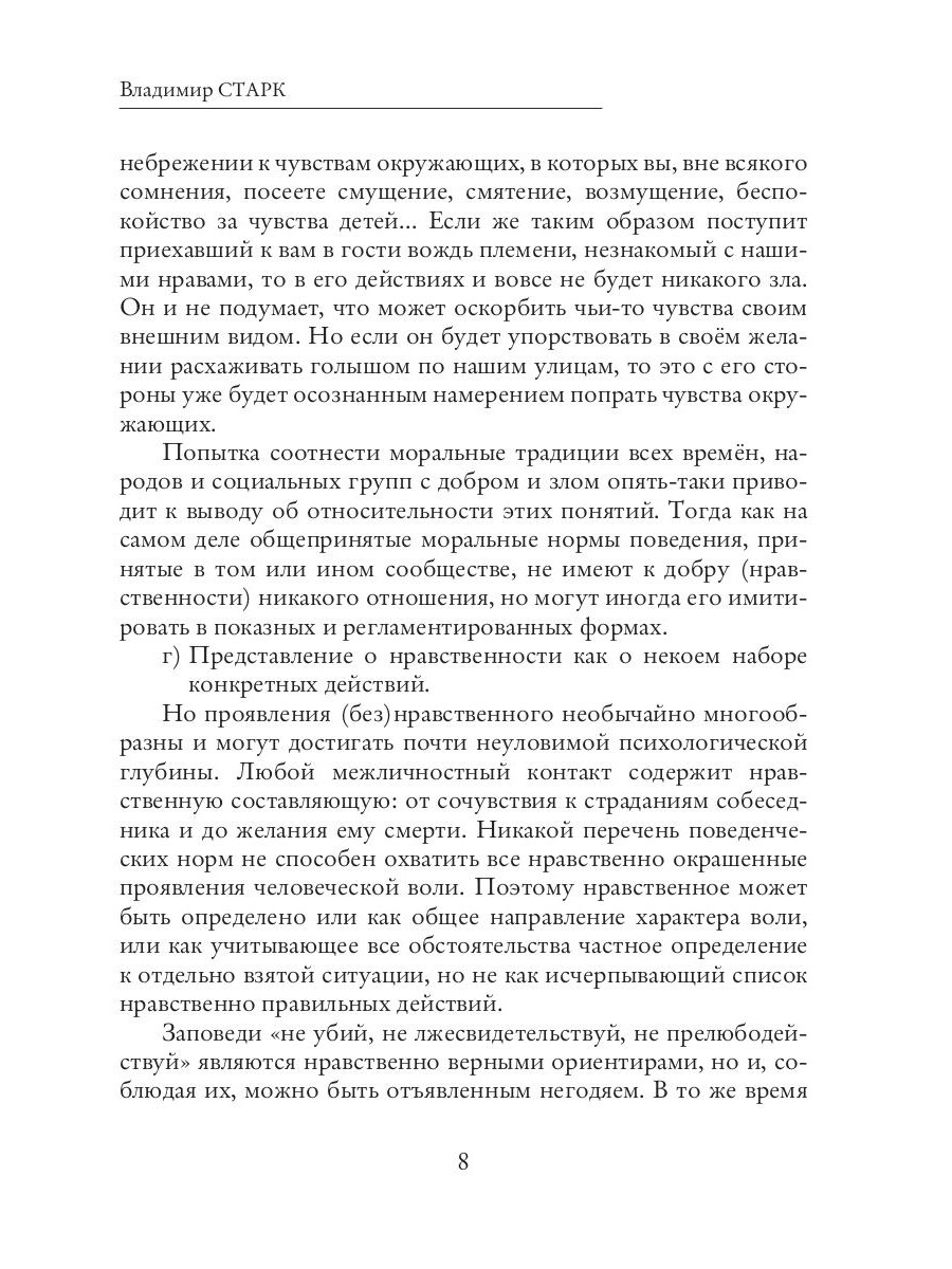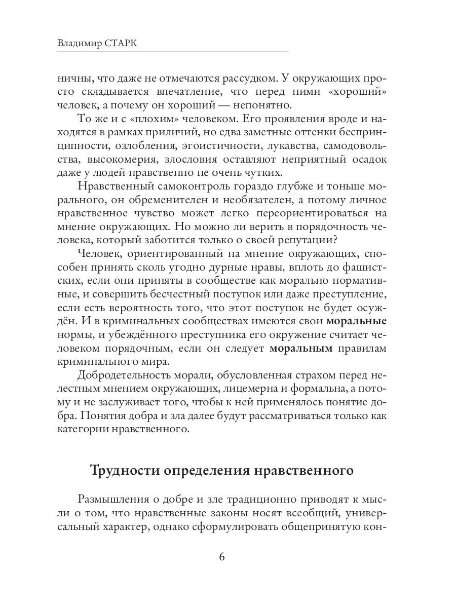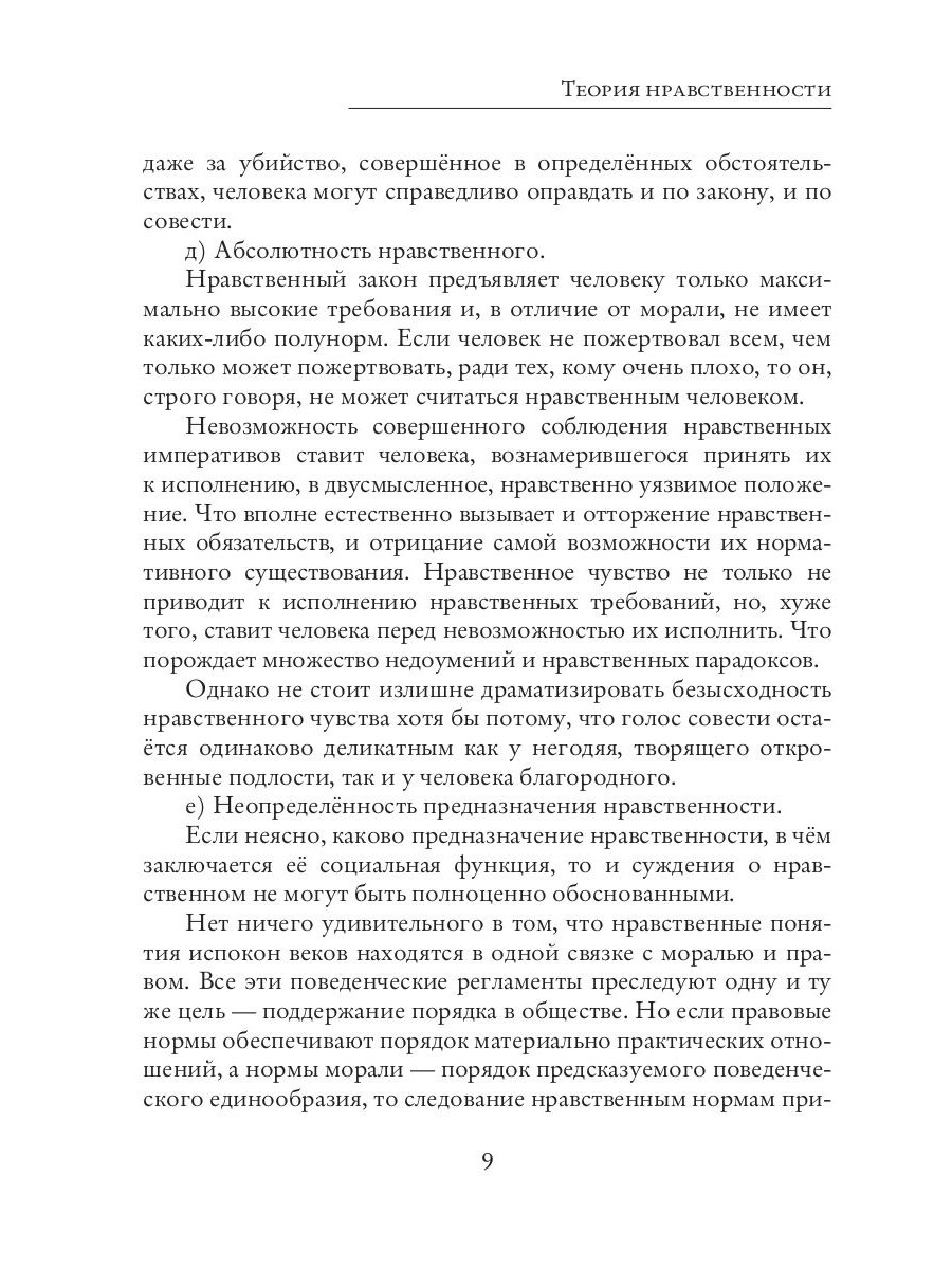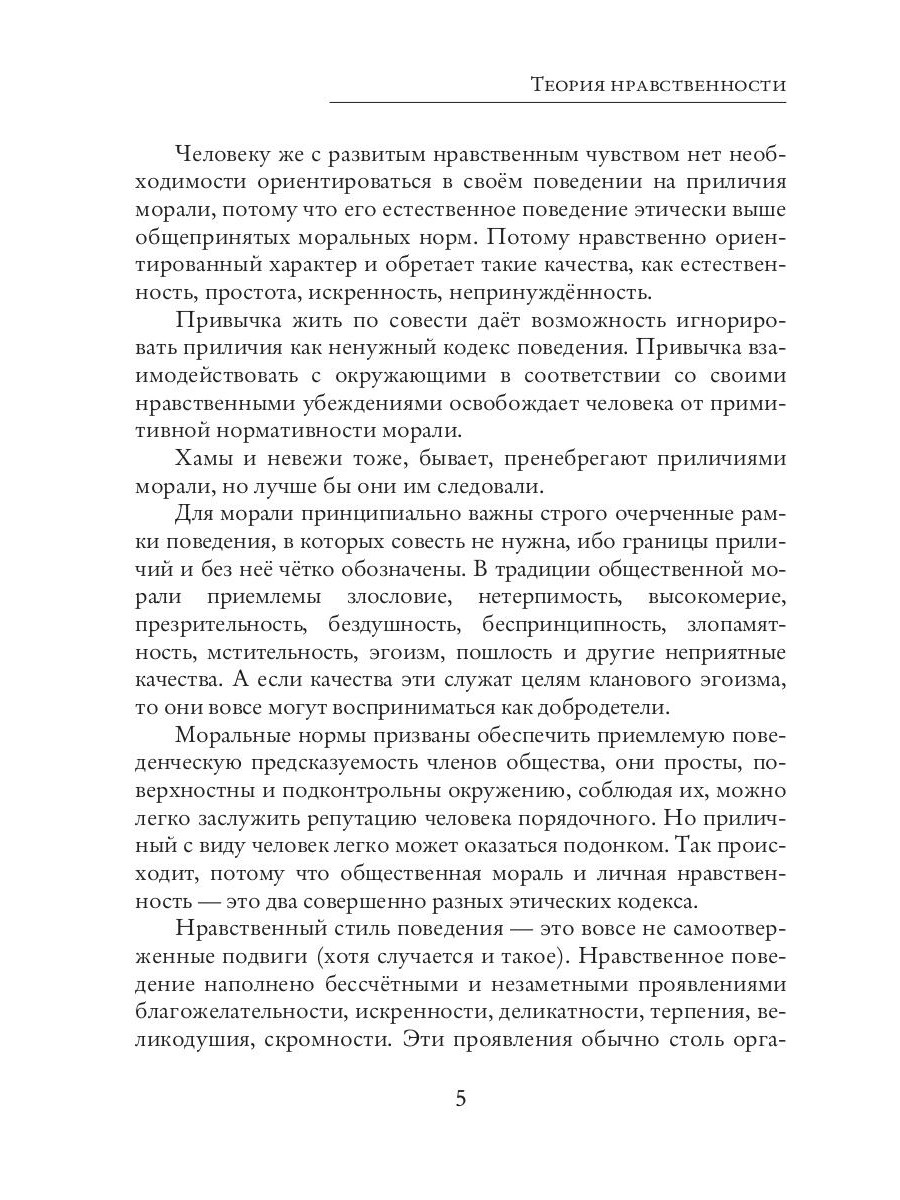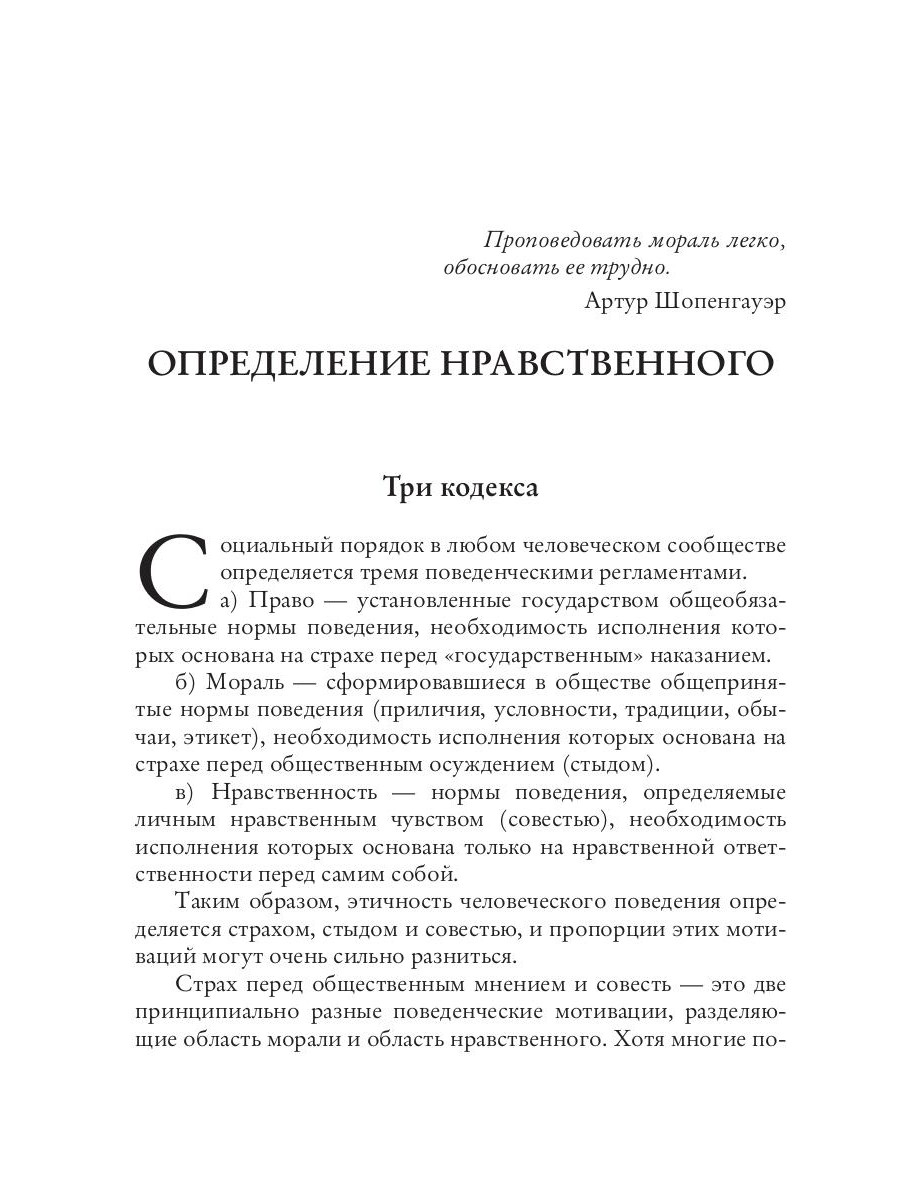 Социальный порядок в любом человеческом сообществе определяется тремя поведенческими регламентами: а) Право - установленные государством общеобязательные нормы поведения, необходимость исполнения которых основана на страхе перед «государственным» наказанием; б) Мораль - сформировавшиеся в обществе общепринятые нормы поведения (приличия, условности, традиции, обычаи, этикет), необходимость исполнения которых основана на страхе перед общественным осуждением (стыдом); в) Нравственность - нормы поведения, определяемые личным нравственным чувством (совестью), необходимость исполнения которых основана только на нравственной ответственности перед самим собой. Таким образом, этичность человеческого поведения определяется страхом, стыдом и совестью, и пропорции этих мотиваций могут очень сильно разниться.| Издательство | Рипол Классик |