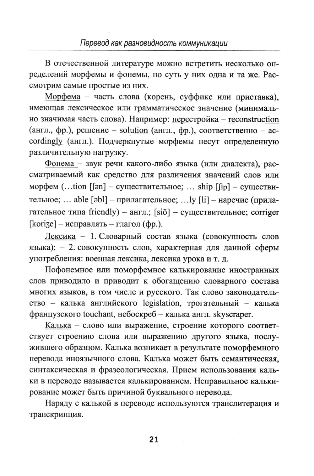 В пособии изложены основные положения из лингвистической теории перевода, необходимые для теоретической подготовки начинающего переводчика: перевод как разновидность межъязыковой и межкультурной коммуникации, двуязычие, многоязычие и основы перевода, что такое перевод, адекватность перевода, явление интерференции в переводе, буквальный и свободный перевод, основные виды перевода по содержанию, восприятию и оформлению, закономерные соответствия в переводе, грамматические трудности при переводе, трансформации, используемые при переводе, работа со словарем, реферирование и аннотирование иностранной специальной литературы, основы редактирования перевода. В пособии 8 глав. Каждая глава заканчивается контрольными вопросами и примечаниями. В конце пособия приводится список использованной литературы. Книга предназначена для студентов, изучающих теорию перевода в вузе по программе дополнительной квалификации «Переводчик в сфере профессиональной коммуникации», для начинающих переводчиков, а также для тех, кто хочет изучить теорию перевода самостоятельно.| Издательство | ЛЕНАНД |