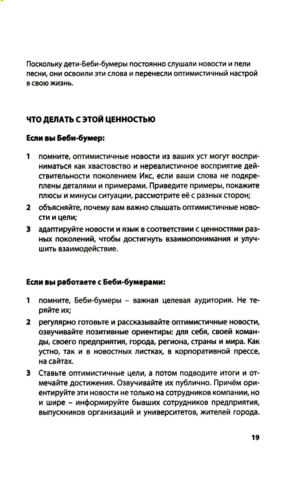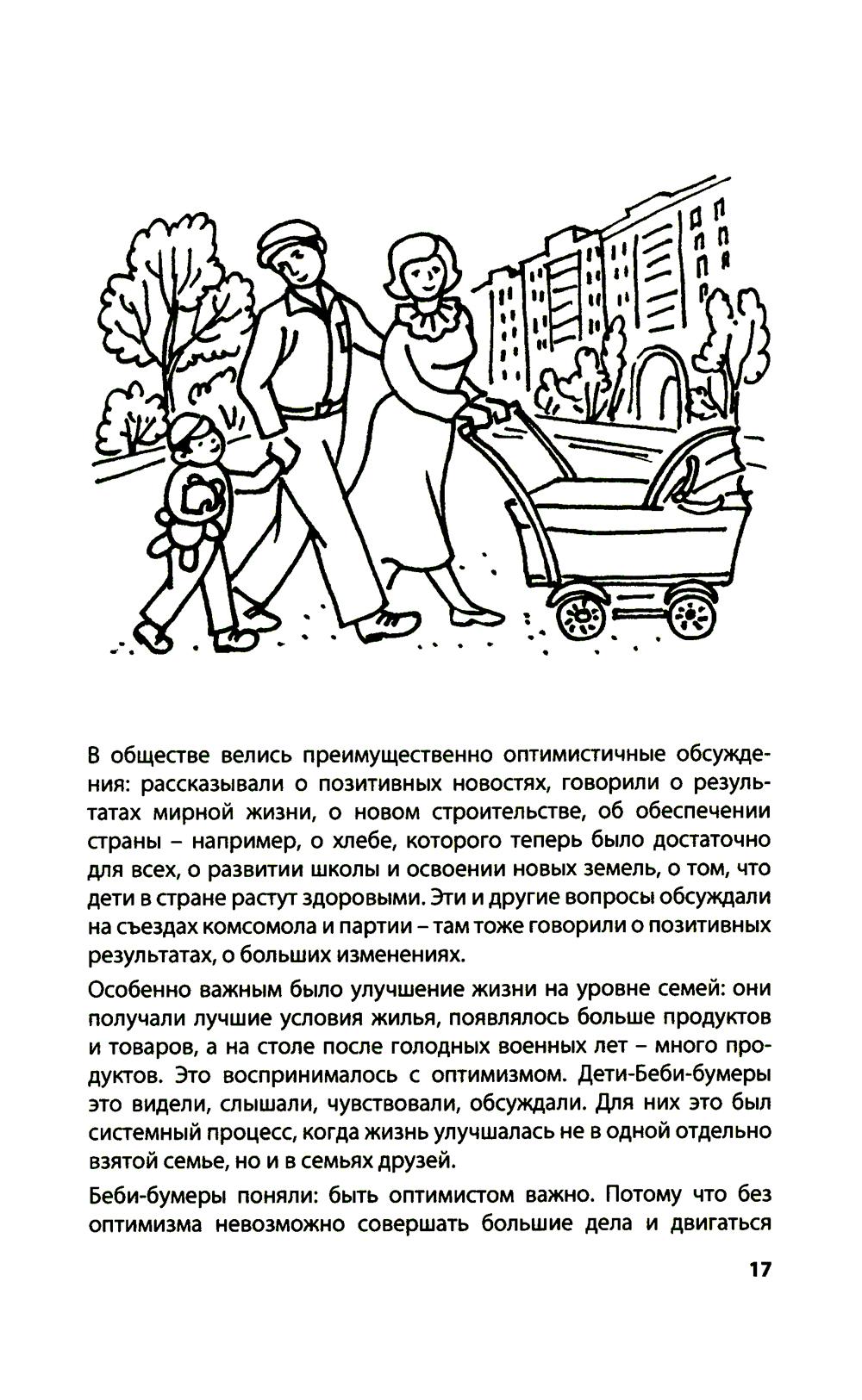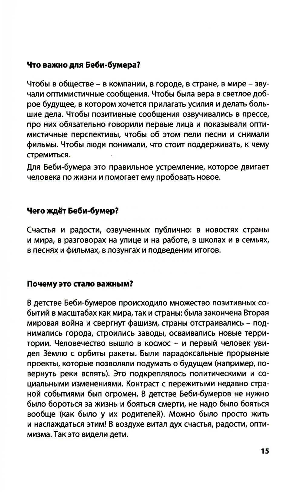 Эта книга о поколении Беби-бумеров - людях, родившихся в 1944-1963 годах, в период послевоенного всплеска рождаемости. Число Беби-бумеров увеличивается, их уже около 30 % от всего экономически активного населения России. Несмотря на зрелый возраст, они и сегодня - ваши руководители, коллеги или клиенты. Занимают ключевые посты в управлении крупными компаниями, отраслями и даже государствами, являются крупнейшей группой потребителей товаров и услуг. Оптимистичны, умеют создавать команды и достигать трудные цели. Конкурентоспособны во всем, чем занимаются. Вы узнаете, как эффективно взаимодействовать с Беби-бумерами, поймете логику их действий, ожидания, приоритеты. Разберетесь, чего делать нельзя. Представители поколения Беби-бумеров смогут осознать себя и свои действия как на работе, так и в личной жизни. Книга полезна профессионалам, работающим с людьми в разных сферах, - управлении, маркетинге, продажах, рекламе, коммуникациях, образовании, стратегическом планировании.| Издательство | ИД Синергия |