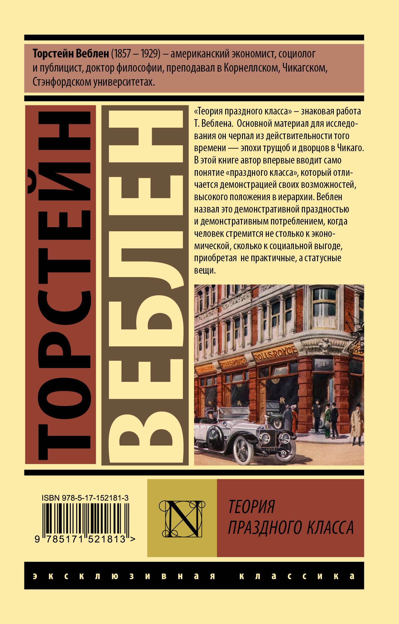 Торстейн Веблен (1857 - 1929) - американский экономист, социолог и публицист, доктор философии, преподавал в Корнеллском, Чикагском, Стэнфордском университетах. "Теория праздного класса" - знаковая работа Т. Веблена. Основной материал для исследования он черпал из действительности того времени - эпохи трущоб и дворцов в Чикаго. В этой книге автор впервые вводит само понятие "праздного класса", который отличается демонстрацией своих возможностей, высокого положения в иерархии. Веблен назвал это демонстративной праздностью и демонстративным потреблением, когда человек стремится не столько к экономической, сколько к социальной выгоде, приобретая не практичные, а статусные вещи.| Издательство | ИЗДАТЕЛЬСТВО "АСТ" |