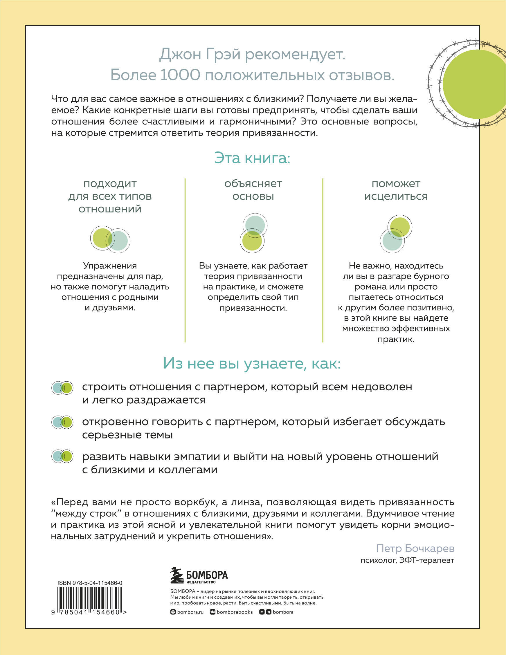 Что для вас самое важное в отношениях с близкими? Получаете ли вы желаемое? Какие конкретные шаги вы готовы предпринять, чтобы сделать ваши отношения более счастливыми и гармоничными? Это основные вопросы, на которые стремится ответить теория привязанности. По завершении работы с книгой - будете ли вы делать это в одиночку или с любимым человеком - вы начнете лучше понимать себя и своих близких. Делитесь полученными знаниями с друзьями и родственниками, чтобы открыть мир более здоровых и крепких отношений. А это именно то, что всем нам необходимо. Из этой книги вы узнаете: - Принципы теории привязанности и то, что они значат для вас. - Как определить свой тип привязанности. - Поймете, как ваш тип привязанности влияет на отношения с близкими людьми. - Как можно наладить испорченные отношения при помощи простых упражнений и доступных анкет. - Как изменить свой тип привязанности, чтобы новые отношения были более крепкими.| Издательство | ООО "Издательство "Эксмо" |