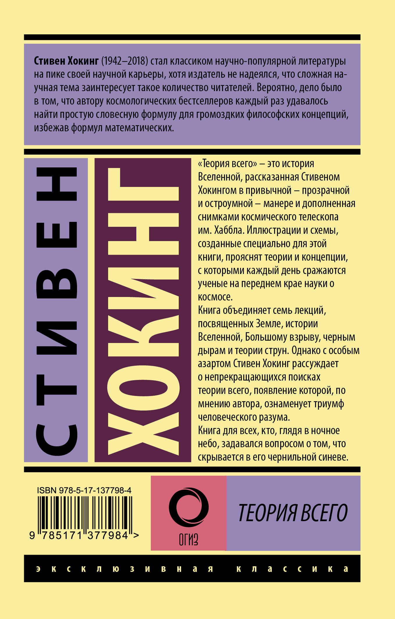 Облегчення версия Краткой истории времени, magnum opus Стивена Хокинга. Еще меньше сложных построений, больше отвлеченных иллюстраций, больше прозрачных параллелей.| Издательство | ИЗДАТЕЛЬСТВО "АСТ" |