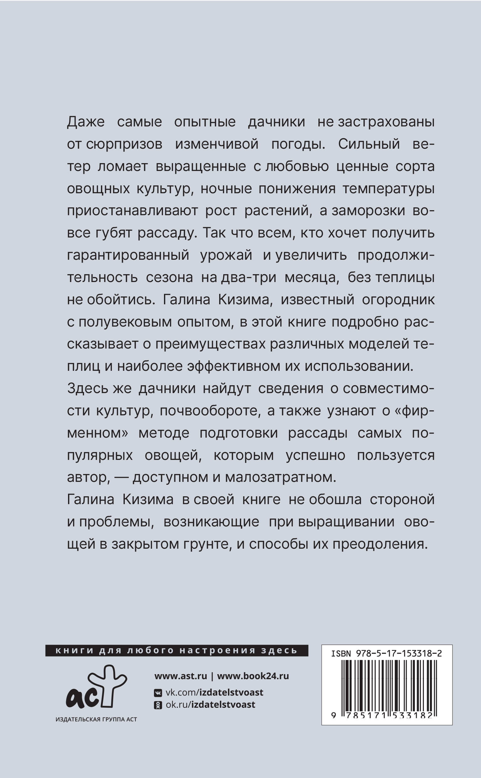 Даже самые опытные дачники не застрахованы от сюрпризов изменчивой погоды. Сильный ветер ломает выращенные с любовью ценные сорта овощных культур, ночные понижения температуры приостанавливают рост растений, а заморозки вовсе губят рассаду. Так что всем, кто хочет получить гарантированный урожай и увеличить продолжительность сезона на два-три месяца, без теплицы не обойтись. Галина Кизима, известный огородник с полувековым опытом, в этой книге подробно рассказывает о преимуществах различных моделей теплиц и наиболее эффективном их использовании. Здесь же дачники найдут сведения о совместимости культур, почвообороте, а также узнают о "фирменном" методе подготовки рассады самых популярных овощей, которым успешно пользуется автор, - доступном и малозатратном. Галина Кизима в своей книге не обошла стороной и проблемы, возникающие при выращивании овощей в закрытом грунте, и способы их преодоления.| Издательство | ИЗДАТЕЛЬСТВО "АСТ" |