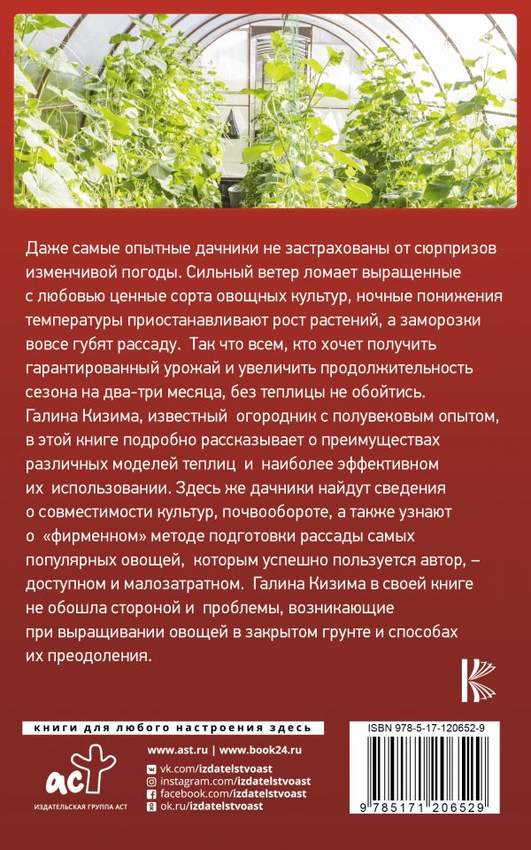 Даже самые опытные дачники не застрахованы от сюрпризов изменчивой погоды. Сильный ветер ломает выращенные с любовью ценные сорта овощных культур, ночные понижения температуры приостанавливают рост растений, а заморозки вовсе губят рассаду. Так что всем, кто хочет получить гарантированный урожай и увеличить продолжительность сезона на два-три месяца, без теплицы не обойтись. Галина Кизима, известный огородник с полувековым опытом, в этой книге подробно рассказывает о преимуществах различных моделей теплиц и наиболее эффективном их использовании. Здесь же дачники найдут сведения о совместимости культур, почвообороте, а также узнают о «фирменном» методе подготовки рассады самых популярных овощей, которым успешно пользуется автор, - доступном и малозатратном. Галина Кизима в своей книге не обошла стороной и проблемы, возникающие при выращивании овощей в закрытом грунте и способах их преодоления.