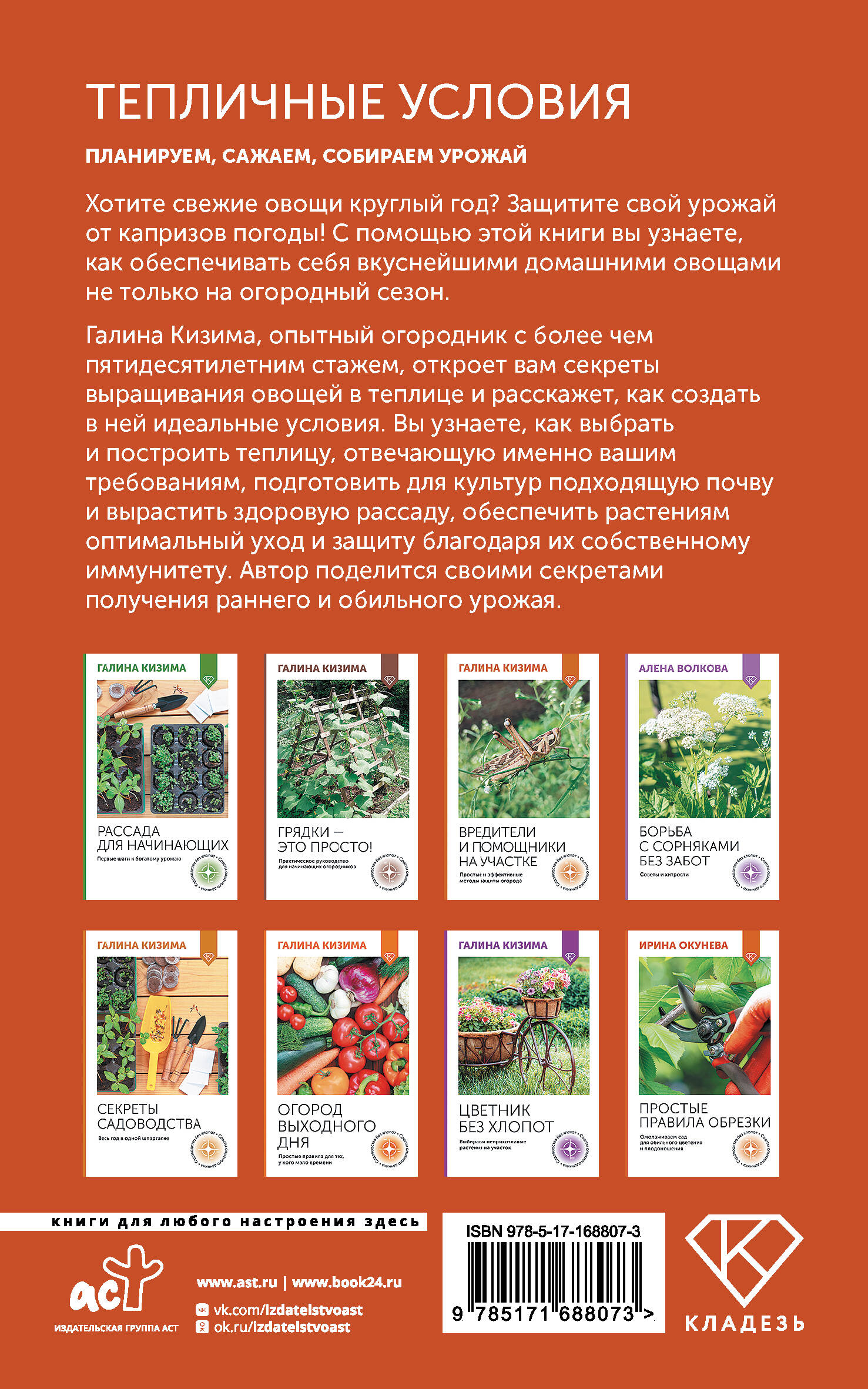 Хотите свежие овощи круглый год? Защитите свой урожай от капризов погоды! С помощью этой книги вы узнаете, как обеспечивать себя вкуснейшими домашними овощами не только на огородный сезон. Галина Кизима, опытный огородник с более чем пятидесятилетним стажем, откроет вам секреты выращивания овощей в теплице и расскажет, как создать в ней идеальные условия. Вы узнаете, как выбрать и построить теплицу, отвечающую именно вашим требованиям, подготовить для культур подходящую почву и вырастить здоровую рассаду, обеспечить растениям оптимальный уход и защиту благодаря их собственному иммунитету. Автор поделится своими проверенными методами борьбы с вредителями и болезнями, а также расскажет о секретах получения раннего и обильного урожая. Эта книга - ваш путеводитель к вкусным и свежим овощам в любое время года! Независимо от вашего опыта, вы сможете вырастить все, что пожелаете!| Издательство | Издательство "АСТ" |