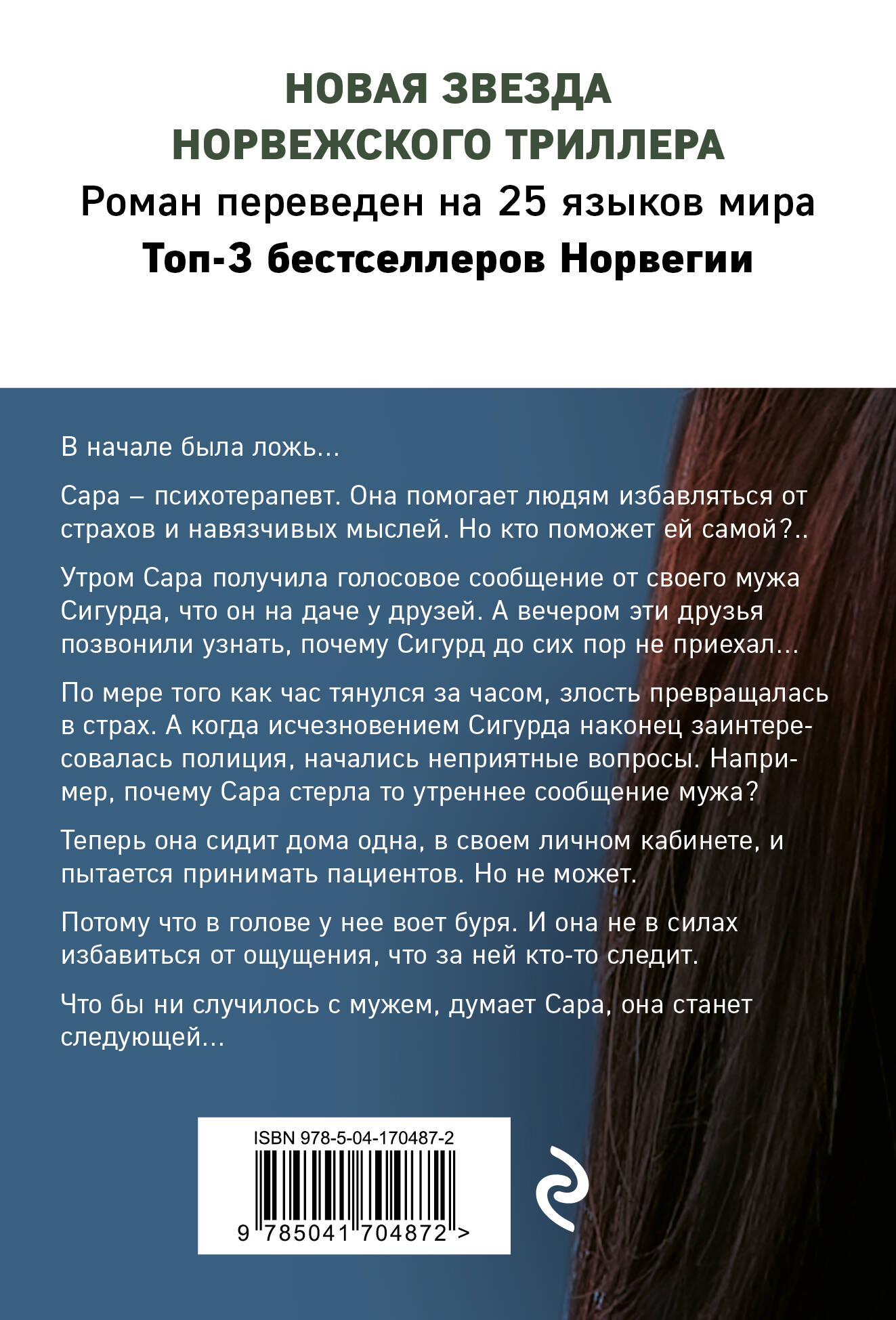 НОВАЯ ЗВЕЗДА НОРВЕЖСКОГО ТРИЛЛЕРА. Роман переведен на 25 языков мира. Топ-3 бестселлеров Норвегии. Редактор Ю Несбё в издательстве «Aschehoug» Нора Кэмпбелл так отозвалась об этом романе: «Книга Хелене, на которую я наткнулась в ворохе рукописей, приходящих в издательство, стала для меня чем-то вроде великолепного подарка. Захватывающая с первой же страницы, она просто сбила меня с ног. Умная, тонкая история в обрамлении блестящего сюжета. Этот роман - поистине редкая находка…» В начале была ложь… Сара - психотерапевт. Она помогает людям избавляться от страхов и навязчивых мыслей. Но кто поможет ей самой?.. Утром Сара получила голосовое сообщение от своего мужа Сигурда, что он на даче у друзей. А вечером эти друзья позвонили узнать, почему Сигурд до сих пор не приехал… По мере того, как час тянулся за часом, злость превращалась в страх. А когда исчезновением Сигурда наконец заинтересовалась полиция, начались неприятные вопросы. Например, почему Сара стерла то утреннее сообщение мужа? Теперь она сидит дома одна, в своем личном кабинете, и пытается принимать пациентов. Но не может. Потому что в голове у нее воет буря. И она не в силах избавиться от ощущения, что за ней кто-то следит. Что бы ни случилось с мужем, думает Сара, она станет следующей… «Это новый норвежский автор, ворвавшийся в самую высшую литературную лигу». - Fædrelandsvennen «Совершенно выдающаяся триллер-терапия». - Bok 365 «В дебютном романе Хелене Флод все сделано абсолютно правильно». - Dagbladet «Невозможно оторваться… один из лучших триллеров года». - Stavanger Aftenblad| Издательство | ООО "Издательство "Эксмо" |