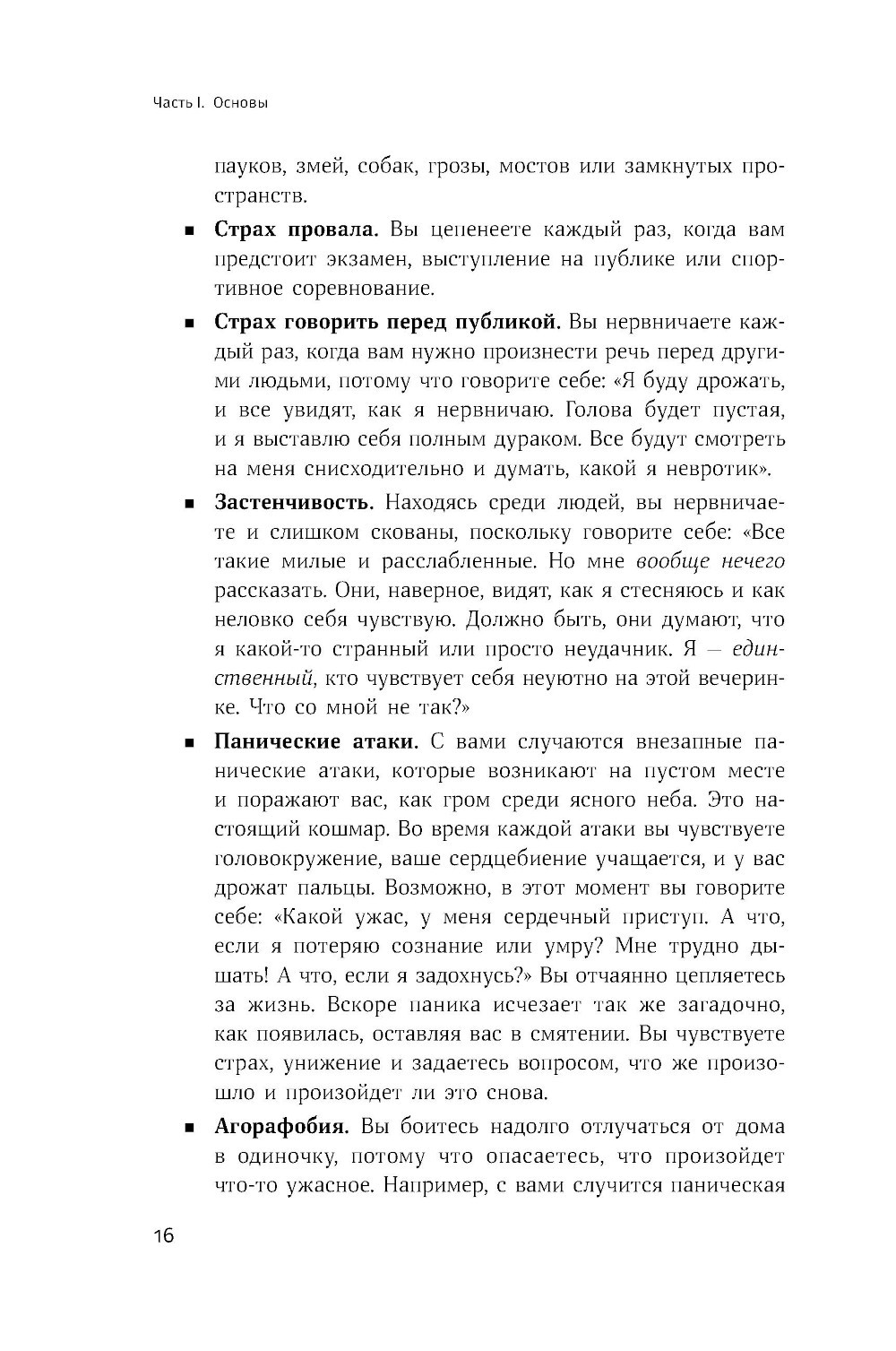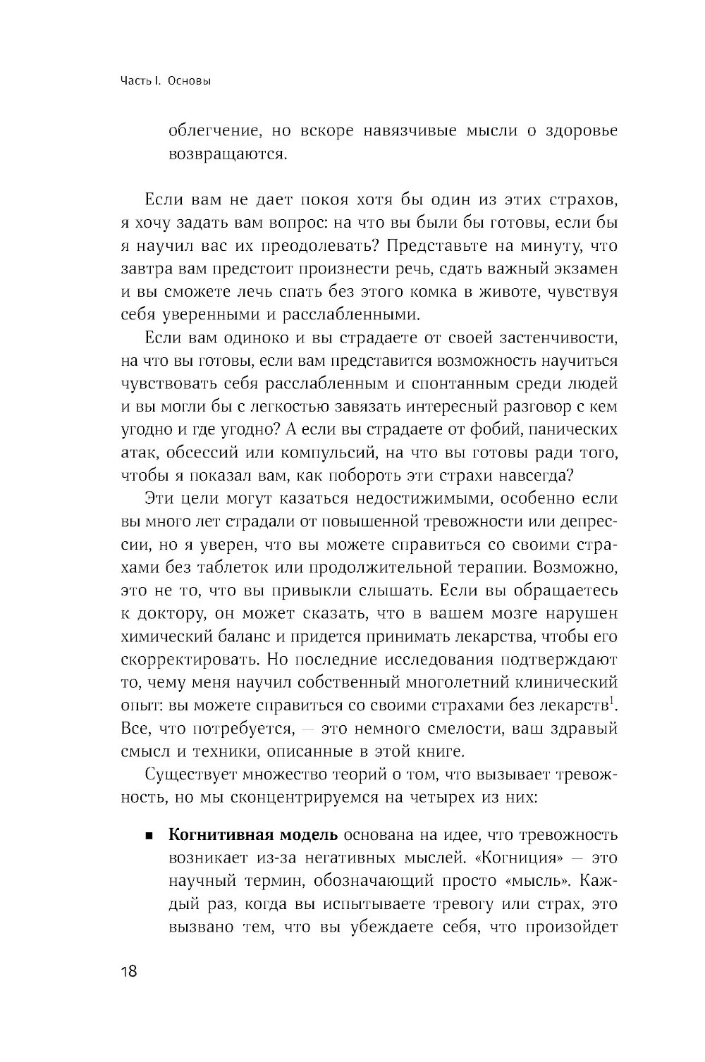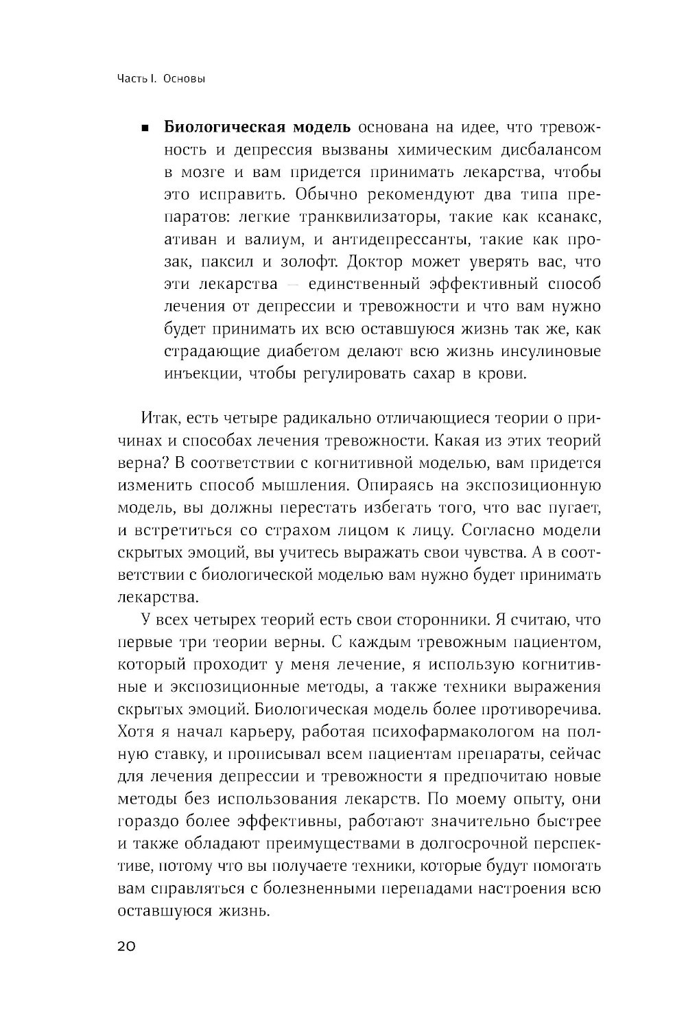 Вы переживаете, что излишне застенчивы или постоянно во всем сомневаетесь? Вы не можете нормально спать, беспокоясь о своей работе, здоровье или отношениях? Вас мучает страх высоты или начинается паническая атака, когда садитесь за руль автомобиля? Дело в том, что в основе тревожных состояний лежат иррациональные убеждения, которые делают вас уязвимым и способны привести к депрессии, утверждает психотерапевт Дэвид Бернс, автор международного бестселлера «Терапия настроения» и один из основоположников когнитивно-поведенческой терапии. В своей новой книге он предлагает 40 простых и эффективных техник, которые помогут вам разобраться в причинах ваших тревог, справиться с негативными мыслями и преодолеть свои страхи. Доктор Бернс также делится результатами исследований лекарств, обычно назначаемых при депрессии, и объясняет, почему они иногда могут принести больше вреда, чем пользы.| Издательство | Альпина Паблишер |