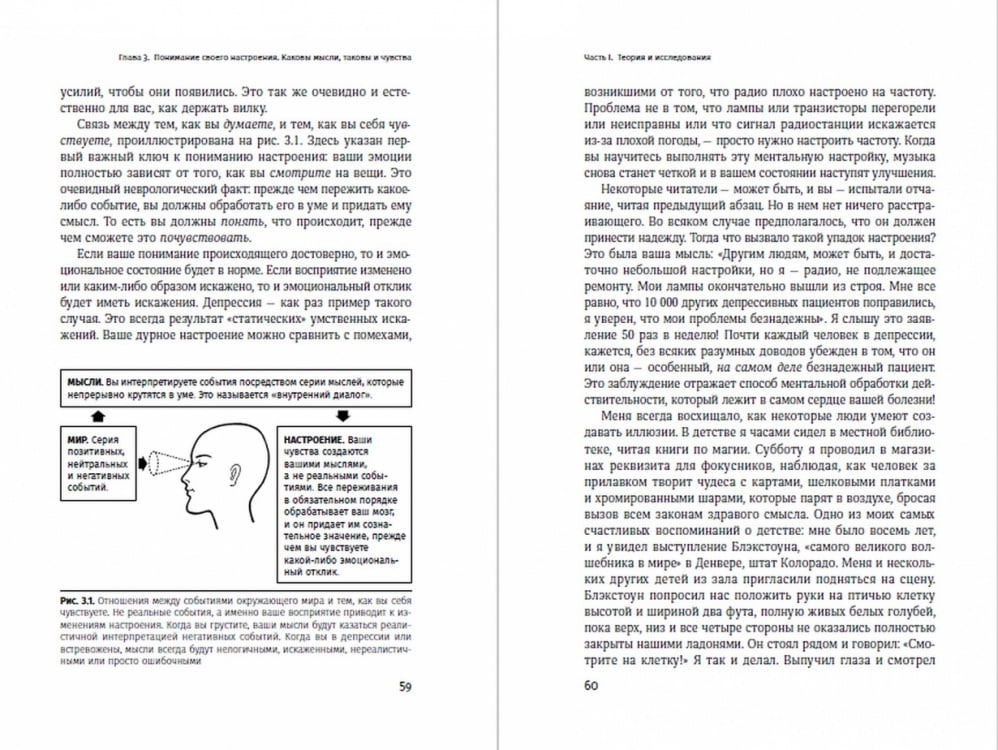 Книга поможет разобраться в себе, выявить первые симптомы депрессии и победить негативные мысли. Автор не призывает отказаться от антидепрессантов. Наоборот, он говорит, что в зависимости от степени депрессии в некоторых случаях без консультации врача и назначения медикаментов не обойтись. Разработанный доктором Бернсом опросник для измерения настроения поможет определить наличие депрессивного состояния и оценить степень его тяжести, а также понять, нужна ли вам профессиональная помощь.