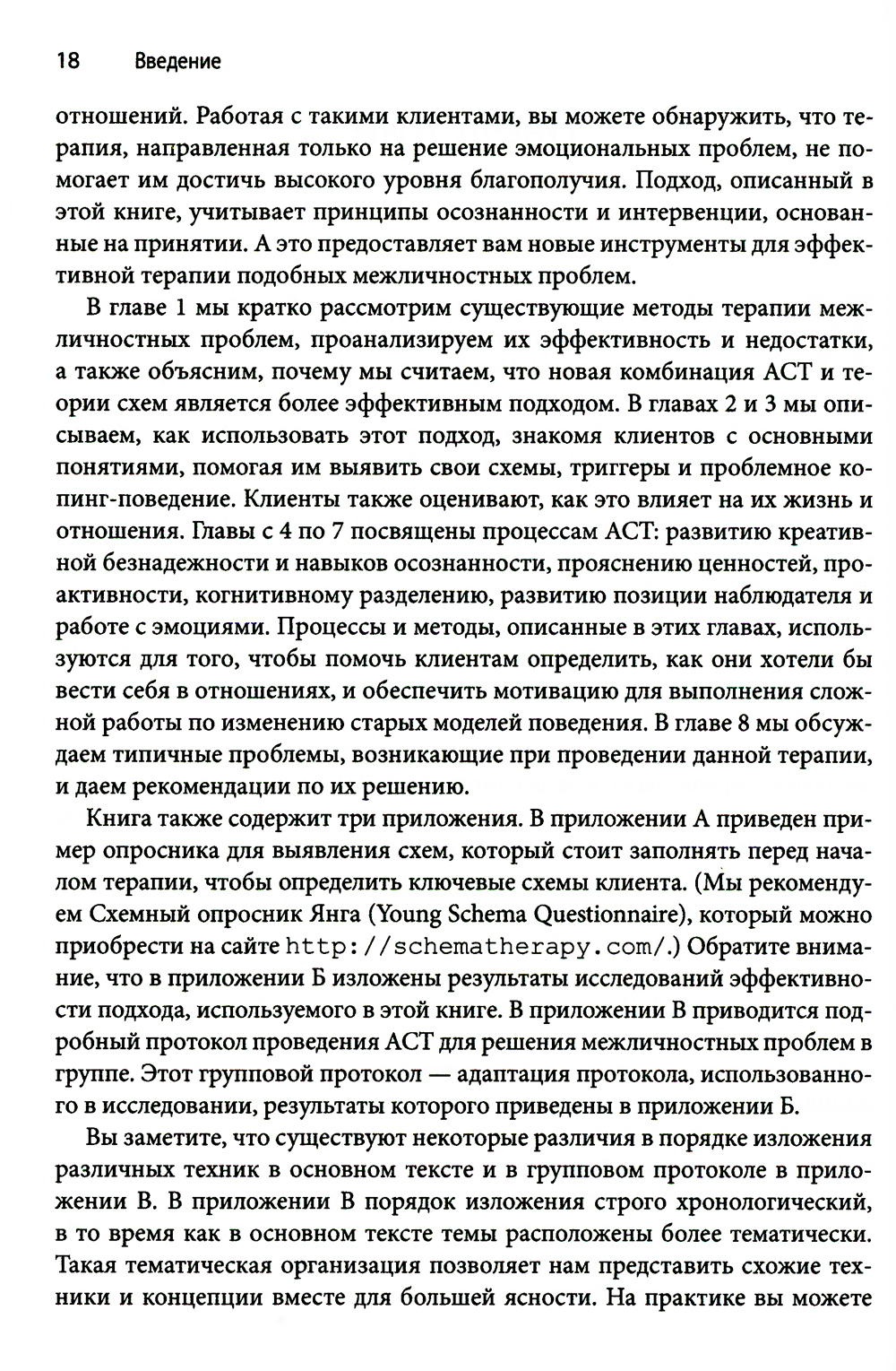 В книге представлены три приложения: пример опросника для выявления схем, результаты исследования эффективности подхода и подробный протокол проведения АСТ для решения межличностных проблем.