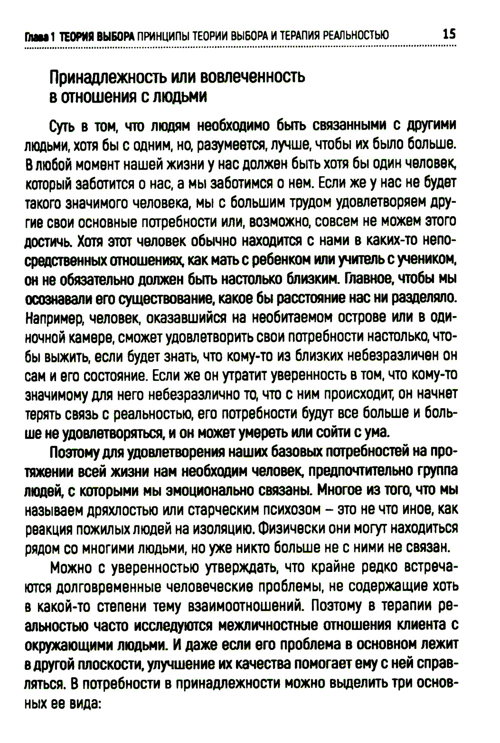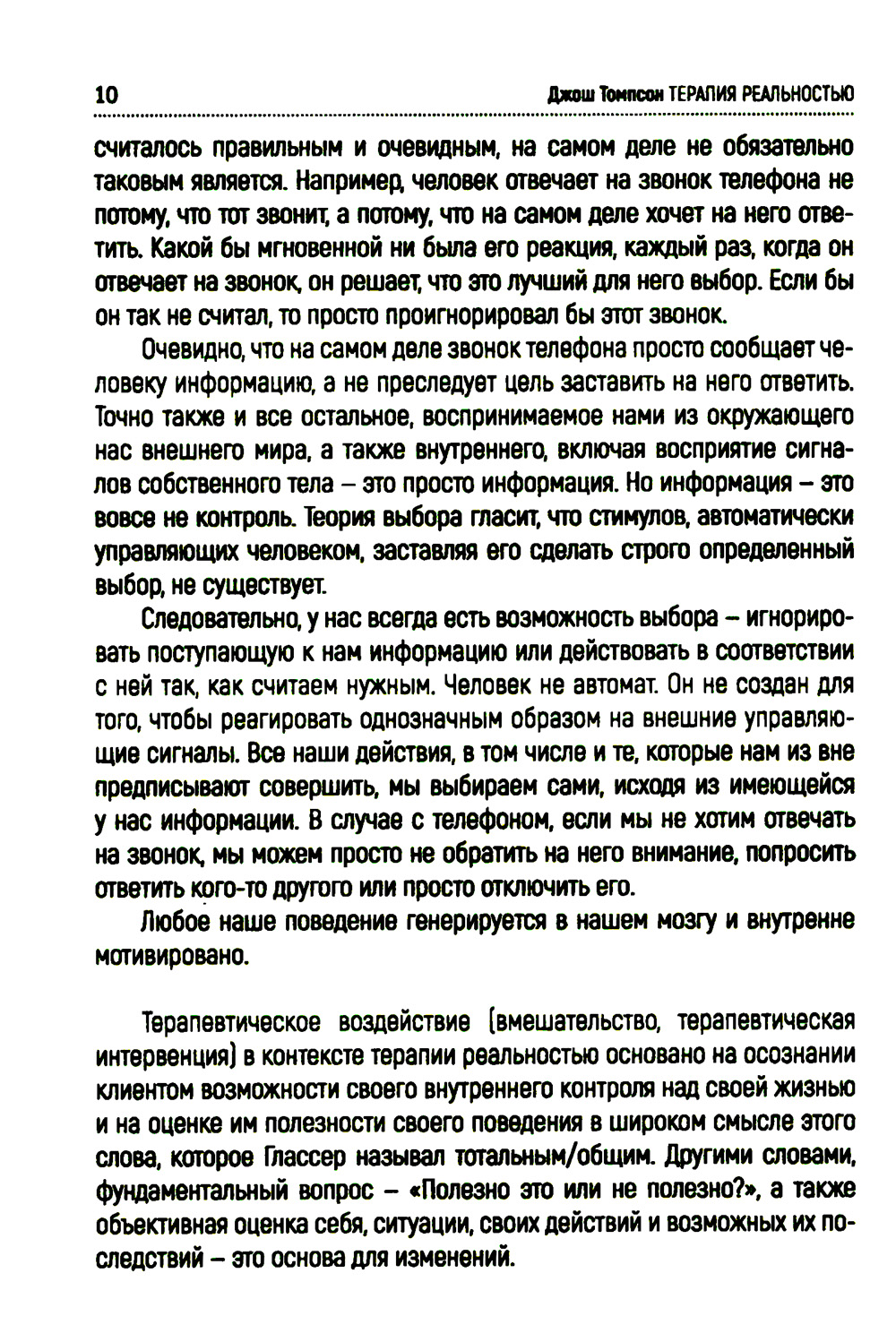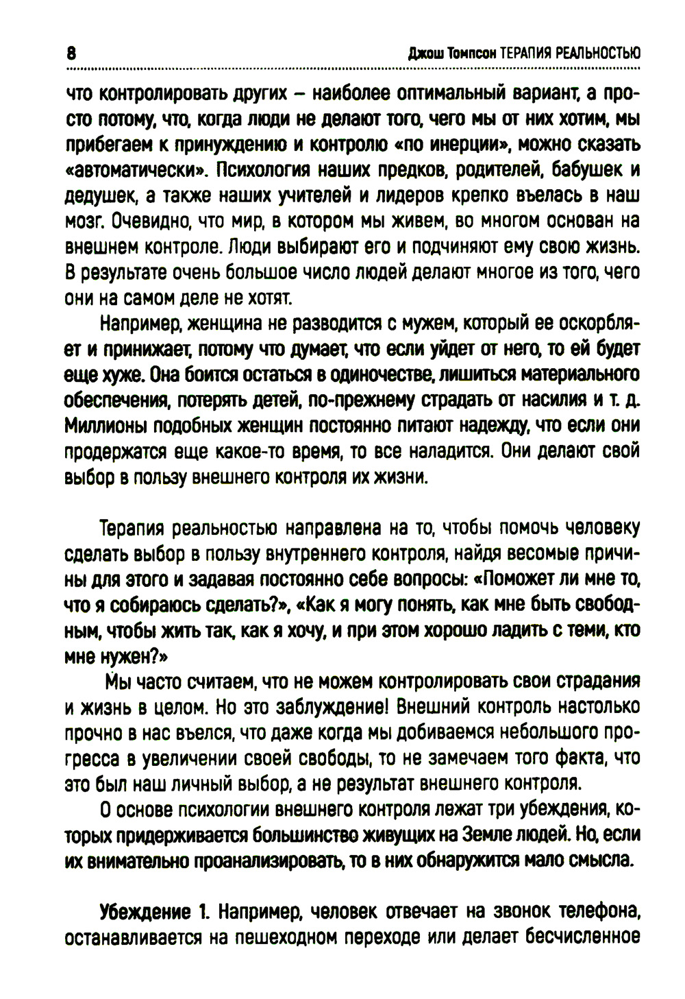 Терапия реальностью основана на теории выбора Уильяма Глассера. Основной акцент в ней делается на том, что человек способен контролировать, т. е. на его действиях и мыслях. В результате это приводит к позитивным изменениям в его эмоциях и чувствах, а также во взаимоотношениях с другими людьми. В книге приводится много примеров конкретных диалогов, иллюстрирующих взаимодействие между специалистом и клиентом и разнообразные терапевтические интервенции (воздействия). Книга написана для консультантов, терапевтов и других представителей помогающих профессий. Она практична и будет полезна консультантам и психотерапевтам, работающим в различных направлениях, а также тем людям, которые самостоятельно ищут способы справиться с неудовлетворяющими их отношениями и личными проблемами.| Издательство | Изд.Базенков И.Л. |