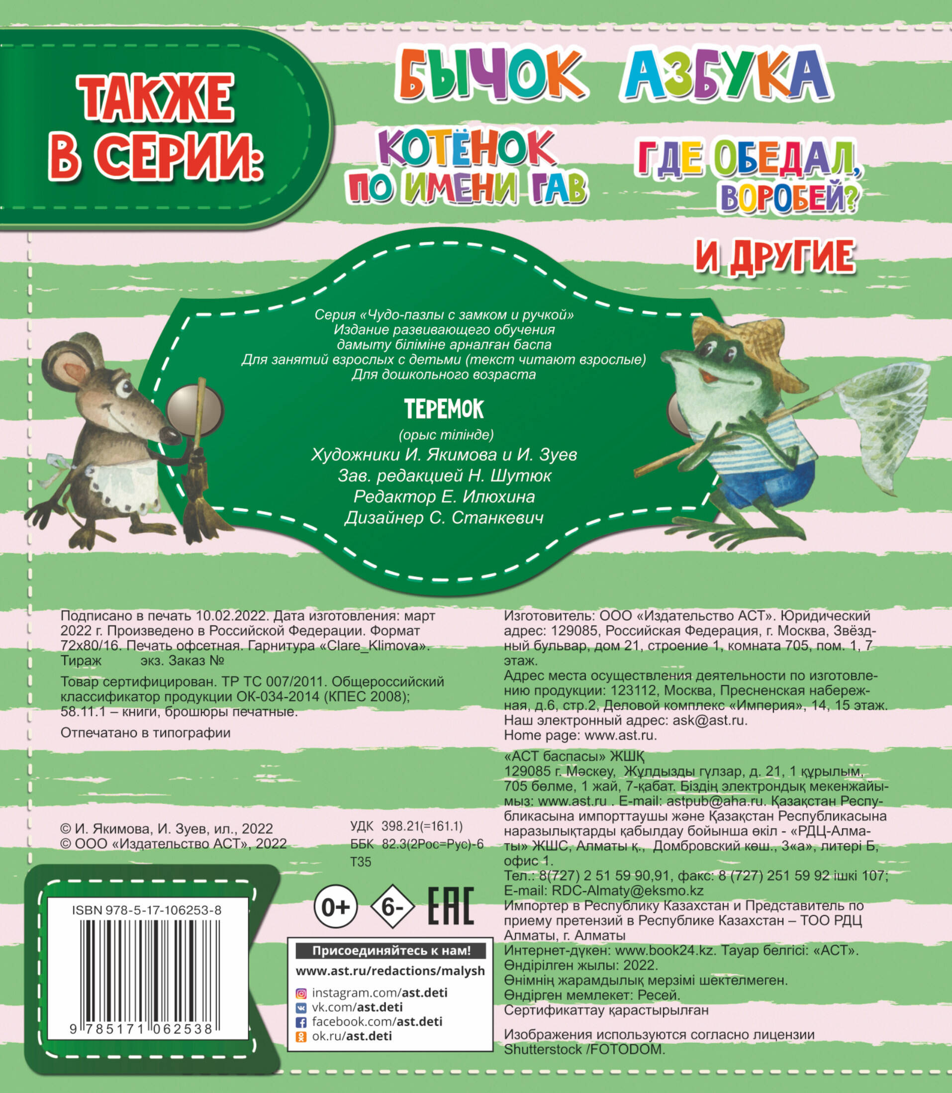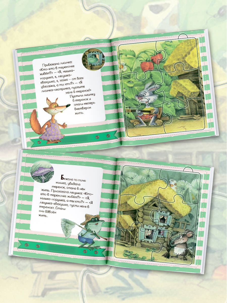 Встречайте любимую сказку малышей в новом формате! «Теремок» стал не просто детской книжкой - теперь это активити-бук в виде яркого чемоданчика с ручкой! Сама сказка на месте, в виде небольших текстовых фрагментов на каждом развороте. К ней добавились картинки-пазлы из шести элементов с удобными выемками для детских пальчиков. Малыш может собирать их где угодно - книгу легко взять с собой в поездку или на прогулку. И не беспокойтесь, ни одна деталь не пропадет, ведь чемоданчик закрывается на симпатичный пластиковый замочек, который идет в комплекте! Это возможность не только прочитать ребенку сказку, но и погрузить его глубже в сюжет, развить наблюдательность, фантазию и мелкую моторику. Подарите малышу классическую сказку в оригинальной подаче - пусть книга принесет еще больше пользы!| Издательство | АСТ |