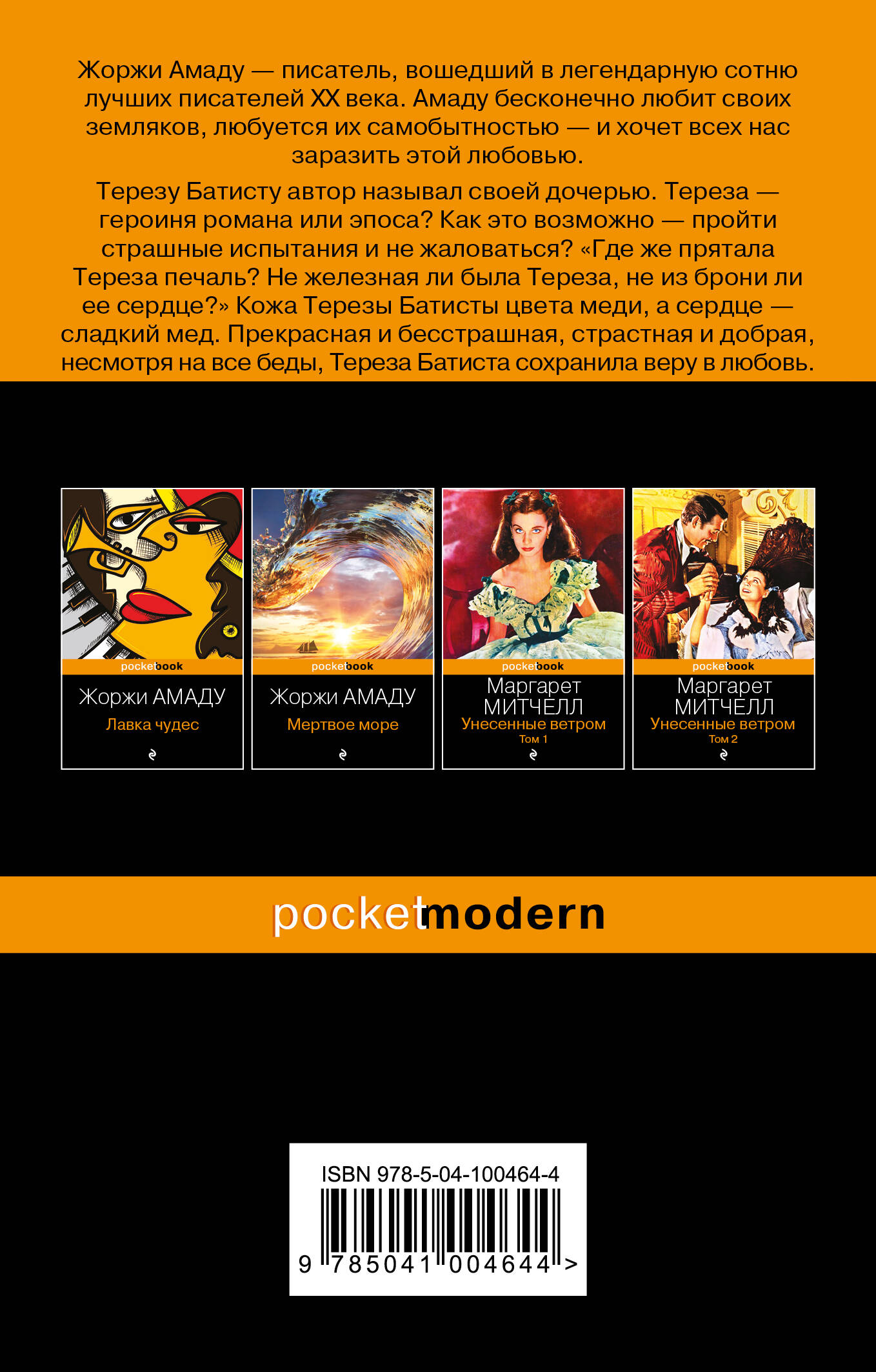 Праздник кипит на улицах, площадях, пляжах. Люди стекаются сами и объединяются в согласованном ритме. «Баия, добрая земля Баия». И этому удивительному и красочному уголку повезло, что в семье владельца небольшой плантации какао родился Жоржи Амаду, кому в будущем суждено было дать окружающему его гулкому миру жизнь в искусстве, сделать его достоянием мировой культуры. История Терезы Батисты - очень трагичная и печальная. Вместо радостей детских лет - унижение и насилие. История Терезы Батисты - история мужественной женщины, с невероятной силой воли и с золотым сердцем, готовым прийти на помощь. История Терезы Батисты - история любви, ведь она была рождена для любви. Несмотря на все беды, которые выпали ей в жизни, она сохранила веру в любовь. «В ее улыбке рассвет и солнце». Вот она, бразильская душа - жизнелюбивая, веселая, приветливая и стойкая.| Издательство | ООО "Издательство "Эксмо" |