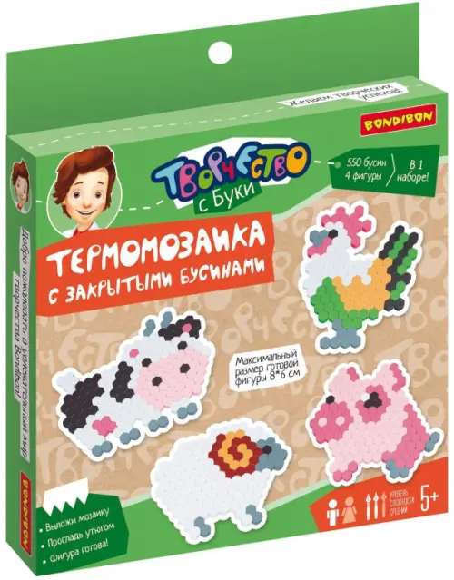 В комплекте - 550 термобусин с закрытым верхом, форма-планшет, калька, пинцет, 4 схемы сборки - поросенок, корова, петушок и барашек. Необходимо гладить на низких температурах и только под присмотром взрослых. Максимальный размер фигуры 8х6 см.