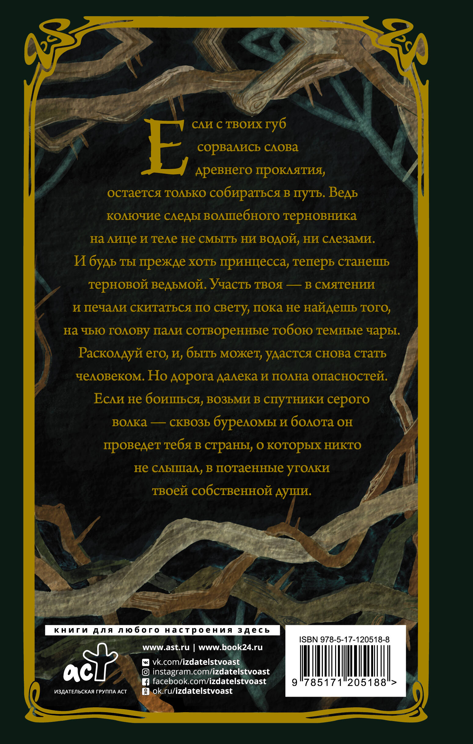 Если с твоих губ сорвались слова древнего проклятия, остается только собираться в путь. Ведь колючие следы волшебного терновника на лице и теле не смыть ни водой, ни слезами. И будь ты прежде хоть принцесса, теперь станешь терновой ведьмой. Участь твоя - в смятении и печали скитаться по свету, пока не найдешь того, на чью голову пали сотворенные тобою темные чары. Расколдуй его, и, быть может, удастся снова стать человеком. Но дорога далека и полна опасностей. Если не боишься, возьми в спутники серого волка - сквозь буреломы и болота он проведет тебя в страны, о которых никто не слышал, в потаенные уголки твоей собственной души.| Издательство | ИЗДАТЕЛЬСТВО "АСТ" |