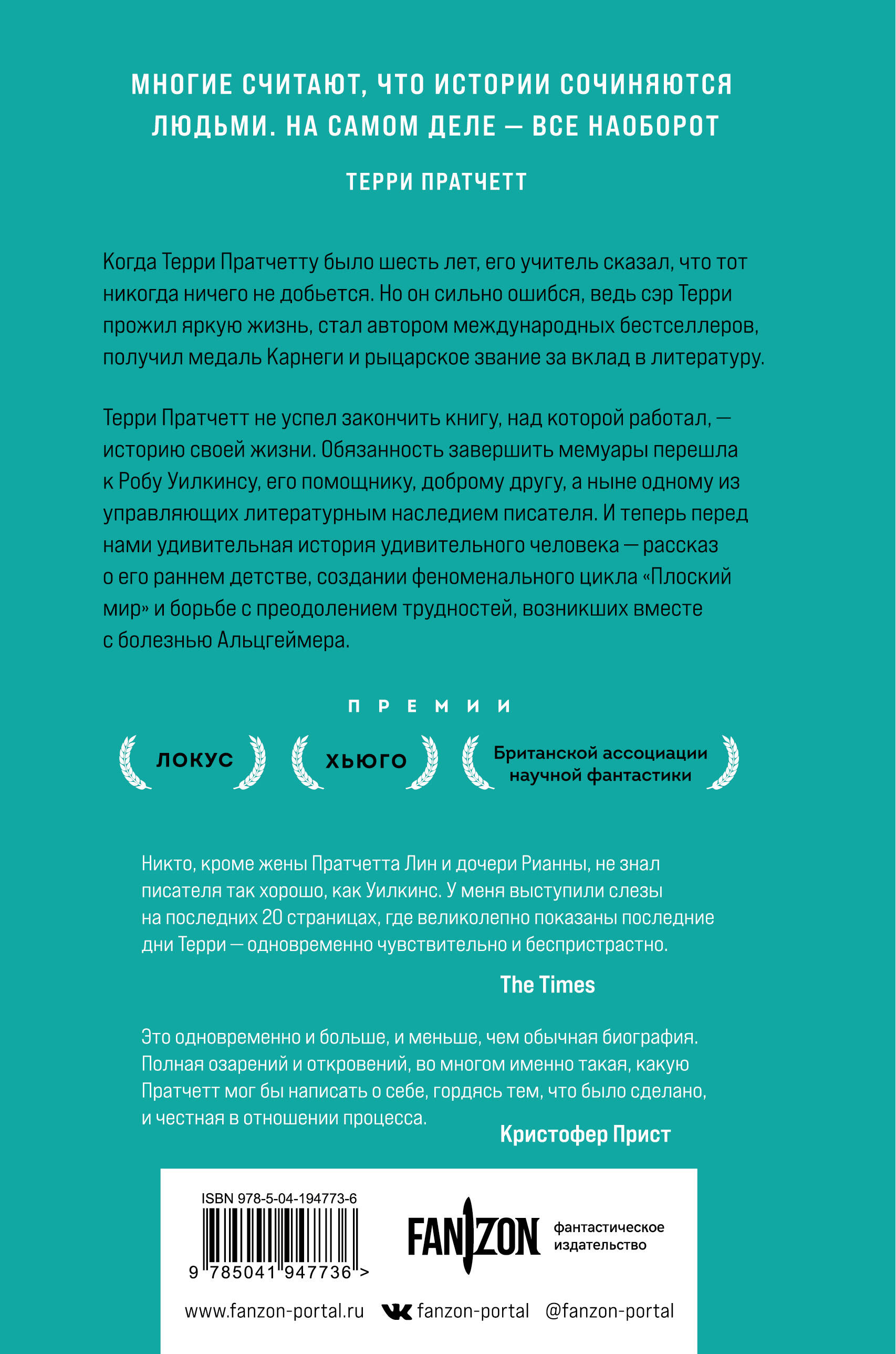 Лаурет премий «Локус», «Хьюго» и премии Британской Ассоциации Научной фантастики. Финалист Британской премии фэнтези. Терри Пратчетт - писатель с международной славой, создатель феноменального цикла «Плоский мир», романа «Благие Знамения» и ряда других книг. Перед своей смертью Терри писал мемуары: историю шестилетнего мальчика, которому учитель предсказал отсутствие успехов, но тот решил доказать обратное. В итоге Пратчетт прожил жизнь, полную удивительных достижений: он стал одним из самых популярных и любимых писателей Великобритании, получил престижную медаль Карнеги и был удостоен рыцарского звания за литературные заслуги. Мемуары, которые Терри, к сожалению, не смог закончить, дописал Роб Уилкинс, его помощник, друг, а ныне управляющий литературным наследием Пратчетта наравне вместе с его дочерью Рианной. Опираясь на собственную память, воспоминания семьи, друзей и коллег писателя, Роб раскрывает полную картину жизни Терри - от детства до заката его потрясающей писательской карьеры, а также рассказывает о том, как он встретил известие о болезни Альцгеймера и начал с ней отчаянную борьбу. Перед вами единственная официальная биография одного из величайших авторов современности - глубоко трогательный и личный портрет удивительной жизни, запечатленный с непревзойденной проницательностью и наполненный забавными историями из жизни. «Из всех умерших авторов в мире Терри Пратчетт - самый живой». - Джон Ллойд «Легко читаемая, поучительная и честная книга. Она заставила меня скучать по настоящему Терри». - Нил Гейман «Иногда весело, иногда болезненно и сокровенно… замечательно увидеть такую картину рабочей жизни писателя крупным планом». - Фрэнк Коттрелл-Бойс «Из обыденности создается волшебство - в точности так, как это делал сам Пратчетт». - Telegraph «Такая же откровенная, смешная и лишенная сентиментальности история, как и все те, что писал сам Терри». - Mail on Sunday «Никто, кроме жены Пратчетта, Лин, и дочери, Рианны, не знал писателя так хорошо, как Уилкинс. У меня выступили слезы на последних 20 страницах, где великолепно показаны последние дни Терри - одновременно чувствительно и беспристрастно». - The Times «Милая, забавная и передающая идеальное ощущение того, как Пратчетт сумел взять воспоминания своего детства в рабочем классе 1950-х годов… и превратить их во вселенную, безгранично богатую и изобретательную». - Mail on Sunday «Дружба и привязанность между этими людьми чувствуется на каждой странице. Конечно, поклонники Пратчетта будут в восторге от этой книги… и даже случайные читатели получат удовольствие от рассказов про его уникальные пристрастия». - Independent «Биография, почти такая же забавная и проницательная, как любой из романов Терри. Богатый, очень трогательный портрет уникальной личности. Приятно видеть, как этот автор возвращается к жизни, хоть и в техническом плане, в этом увлекательном и очень трогательном произведении». - Daily Express «Трогательный и остроумный рассказ о волшебном уме Пратчетта и его болезни Альцгеймера, написанный человеком, который знал его лучше всех». - The Sunday Times «Уилкинс имеет большое преимущество перед другими биографами: он не только хорошо знал своего подопечного, но и делал заметки для предполагаемых мемуаров еще при его жизни. В результате рассказ порой напоминает выступление чревовещателя, но пр