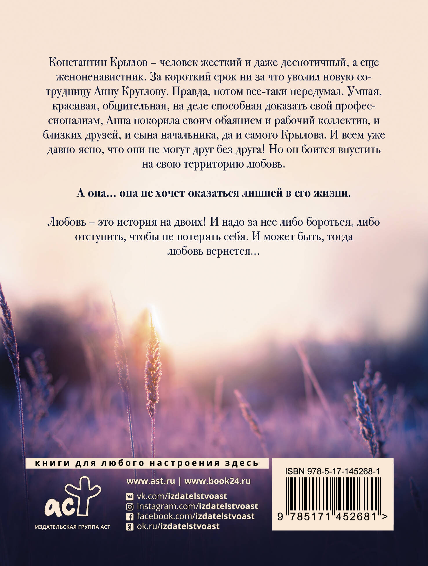 Константин Крылов - человек жесткий и даже деспотичный, а еще женоненавистник. За короткий срок ни за что уволил новую сотрудницу Анну Круглову. Правда, потом все-таки передумал. Умная, красивая, общительная, на деле способная доказать свой профессионализм, Анна покорила своим обаянием и рабочий коллектив, и близких друзей, и сына начальника, да и самого Крылова. И всем уже давно ясно, что они не могут друг без друга! Но он боится впустить на свою территорию любовь. А она... она не хочет оказаться лишней в его жизни. Любовь - это история на двоих! И надо за нее либо бороться, либо отступить, чтобы не потерять себя. И может быть, тогда любовь вернется...| Издательство | АСТ |