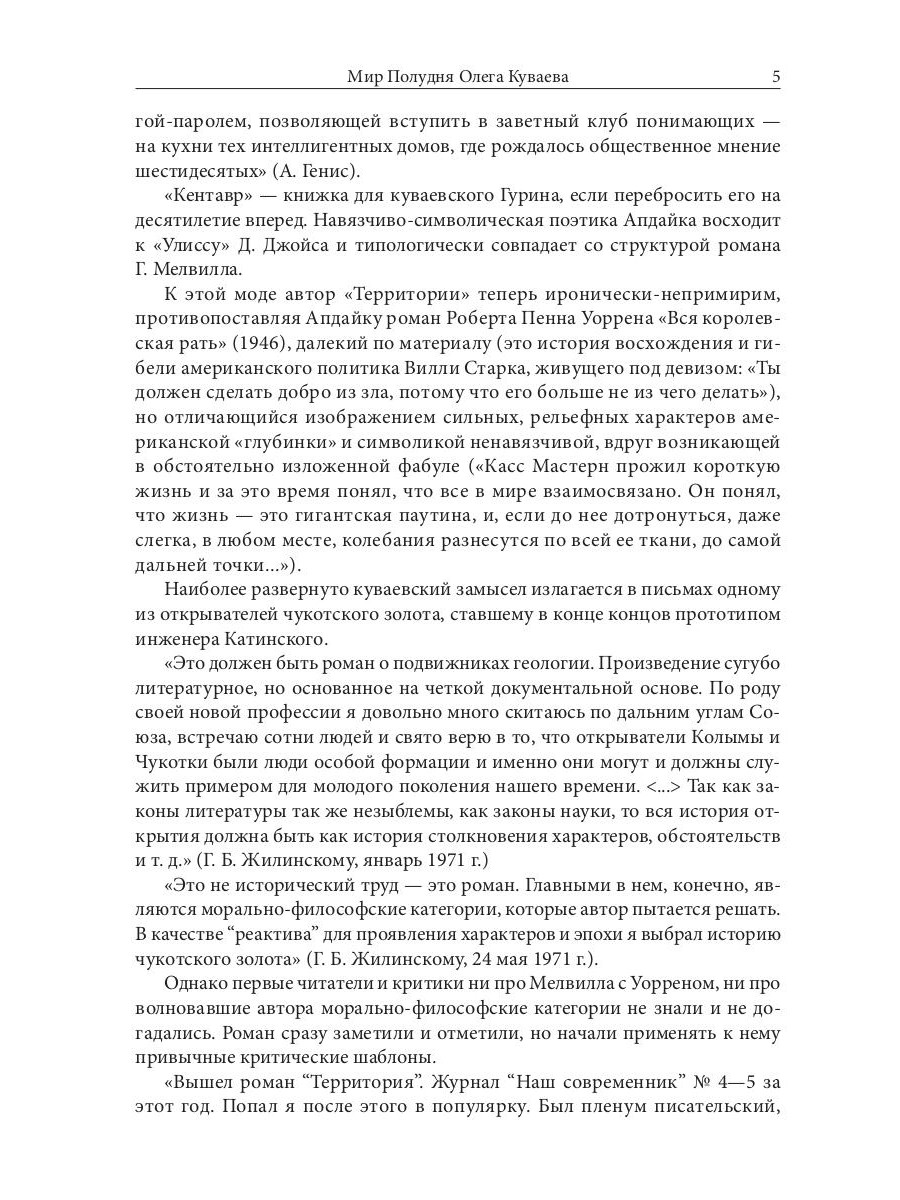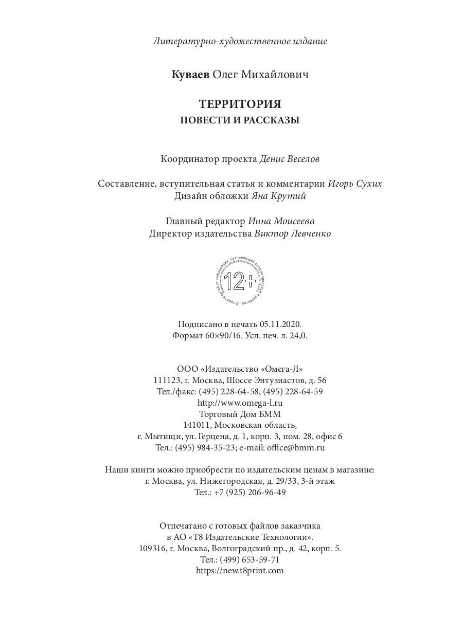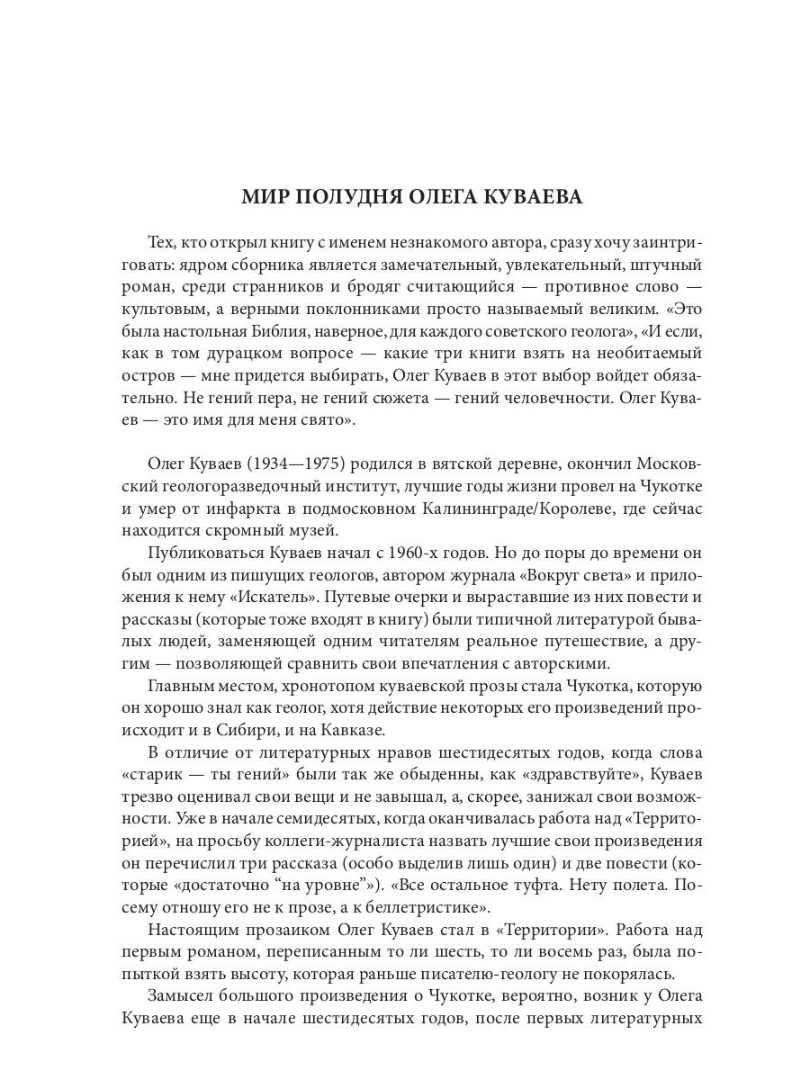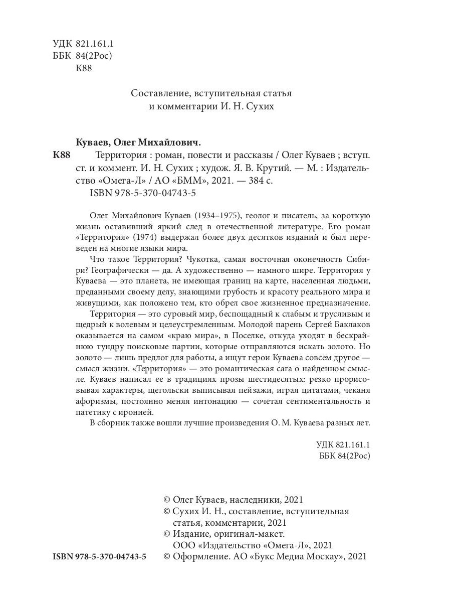 Олег Михайлович Куваев (1934-1975), геолог и писатель, за короткую жизнь оставивший яркий след в отечественной литературе. Его роман «Территория» (1974) выдержал более двух десятков изданий и был переведен на многие языки мира. Что такое Территория? Чукотка, самая восточная оконечность Сибири? Географически - да. А художественно - намного шире. Территория у Куваева - это планета, не имеющая границ на карте, населенная людьми, преданными своему делу, знающими грубость и красоту реального мира и живущими, как положено тем, кто обрел свое жизненное предназначение. Территория - это суровый мир, беспощадный к слабым и трусливым и щедрый к волевым и целеустремленным. Молодой парень Сергей Баклаков оказывается на самом «краю мира», в Поселке, откуда уходят в бескрайнюю тундру поисковые партии, которые отправляются искать золото. Но золото - лишь предлог для работы, а ищут герои Куваева совсем другое - смысл жизни. «Территория» - это романтическая сага о найденном смысле. Куваев написал ее в традициях прозы шестидесятых: резко прорисовывая характеры, щегольски выписывая пейзажи, играя цитатами, чеканя афоризмы, постоянно меняя интонацию - сочетая сентиментальность и патетику с иронией. В сборник также вошли лучшие произведения О.М. Куваева разных лет.| Издательство | Омега-Л |