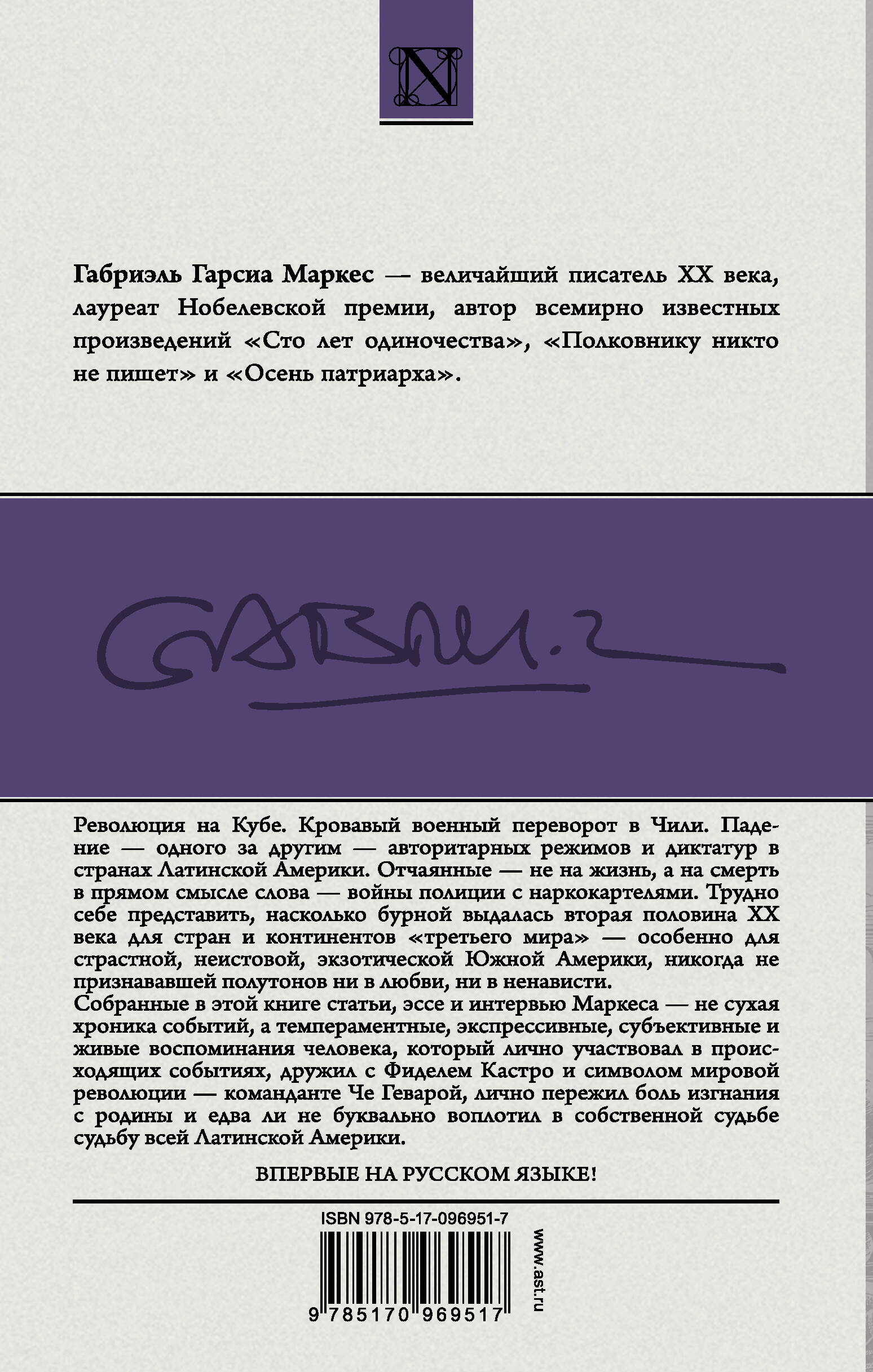 Революция на Кубе. Кровавый военный переворот в Чили. Падение - одного за другим - авторитарных режимов и диктатур в странах Латинской Америки. Отчаянные - не на жизнь, а на смерть в прямом смысле слова - войны полиции с наркокартелями. Трудно себе представить, насколько бурной выдалась вторая половина XX века для стран и континентов "третьего мира" - особенно для страстной, неистовой, экзотической Южной Америки, никогда не признававшей полутонов ни в любви, ни в ненависти. Собранные в этой книге статьи, эссе и интервью Маркеса - не сухая хроника событий, а темпераментные, экспрессивные, субъективные и живые воспоминания человека, который лично участвовал в происходящих событиях, дружил с Фиделем Кастро и символом мировой революции - команданте Че Геварой, лично пережил боль изгнания с родины и едва ли не буквально воплотил в собственной судьбе судьбу всей Латинской Америки.| Издательство | ИЗДАТЕЛЬСТВО "АСТ" |