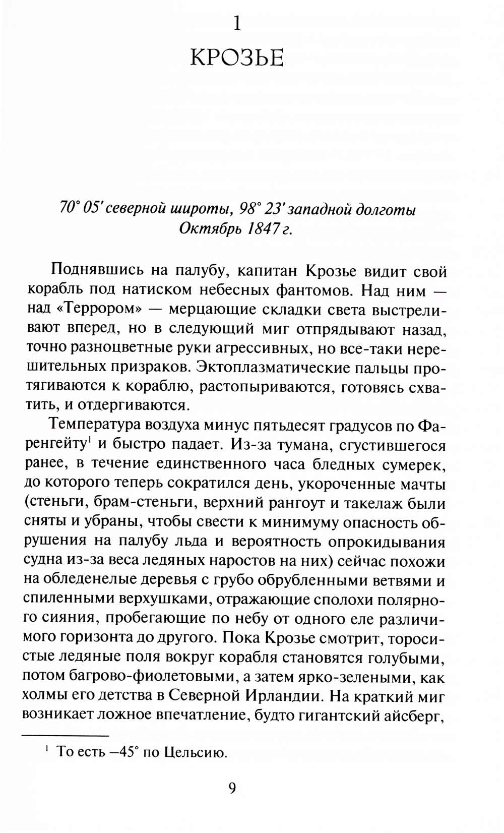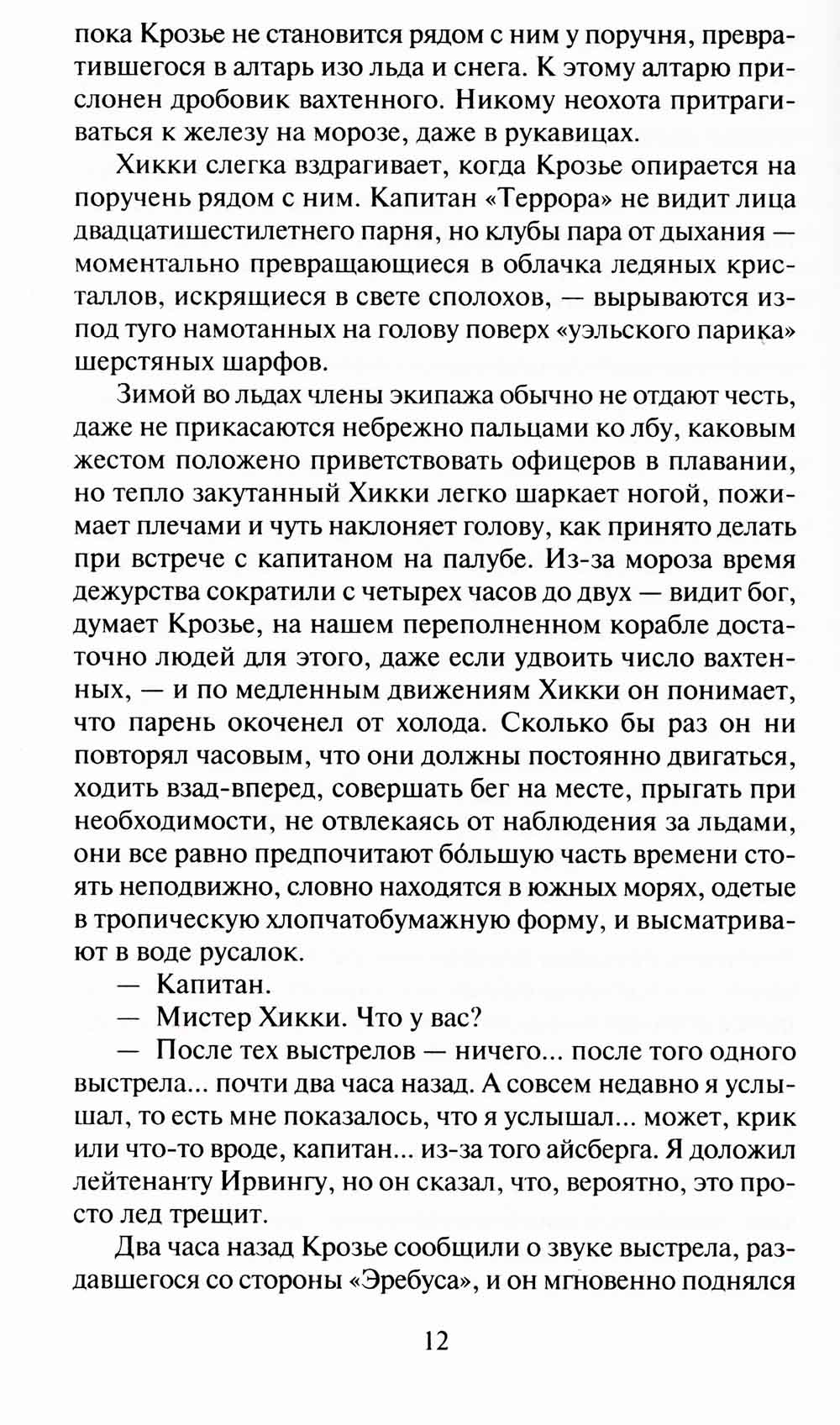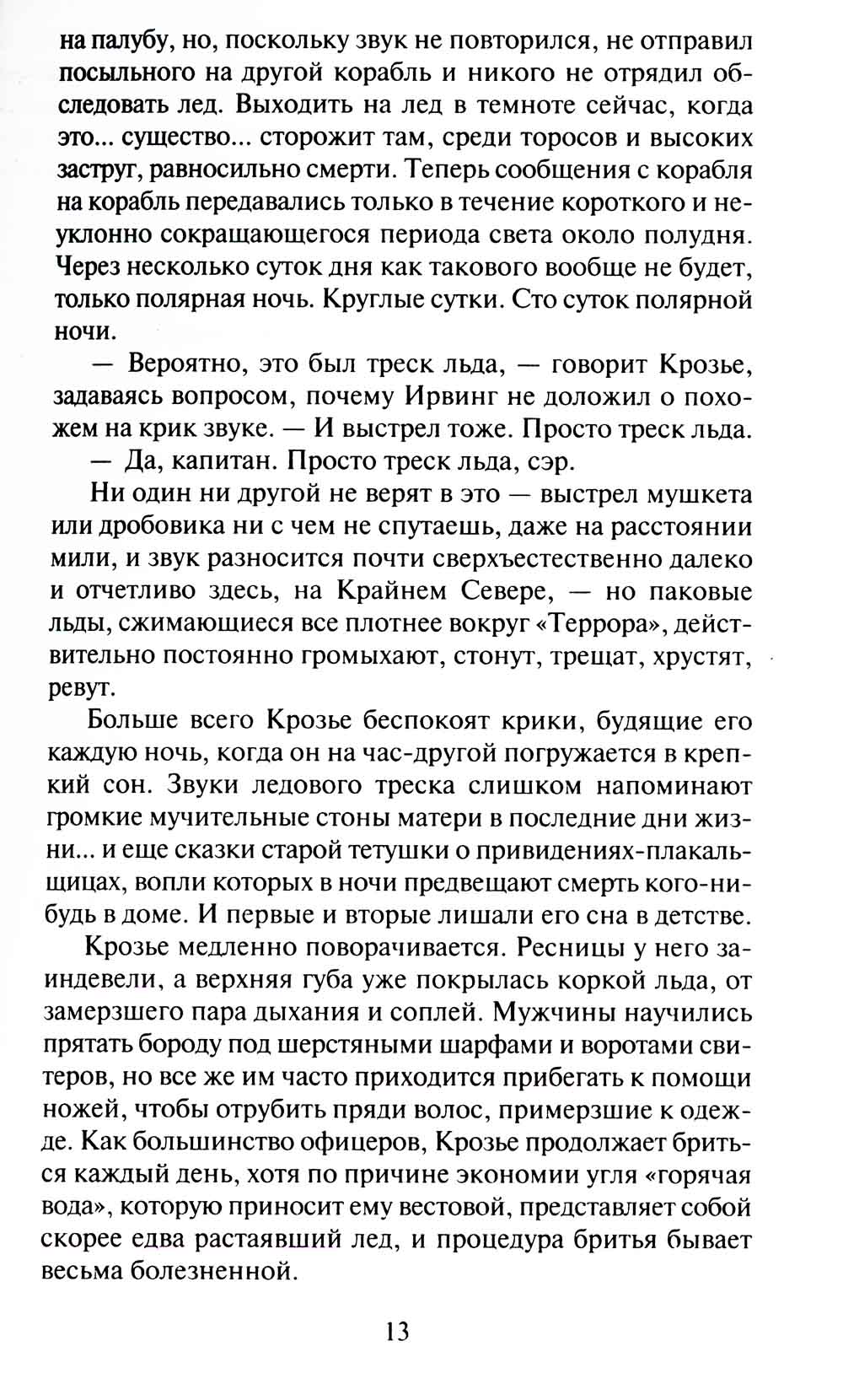 В 1845 году экспедиция под командованием опытного полярного исследователя сэра Джона Франклина отправляется на судах «Террор» и «Эребус» к северному побережью Канады на поиск Северо-Западного прохода из Атлантического океана в Тихий - и бесследно исчезает. Поиски ее затянулись на несколько десятилетий, сведения о ее судьбе собирались буквально по крупицам, и до сих пор картина происшедшего пестрит белыми пятнами - хотя осенью 2014 года грянула сенсация: после более чем полутора веков поисков «Эребус» был наконец обнаружен, и ученые уже готовятся приступить к изучению останков корабля, идеально сохранившихся в полярных водах. Но еще за несколько лет до этого поразительного открытия Дэн Симмонс, знаменитый автор «Гипериона» и «Эндимиона», «Илиона» и «Олимпа», «Песни Кали» и «Темной игры смерти», предложил свою версию событий: главную угрозу для экспедиции составляли не сокрушительные объятия льда, не стужа с вьюгой и не испорченные консервы - а неведомое исполинское чудовище, будто сотканное из снега и полярного мрака.| Издательство | Азбука |