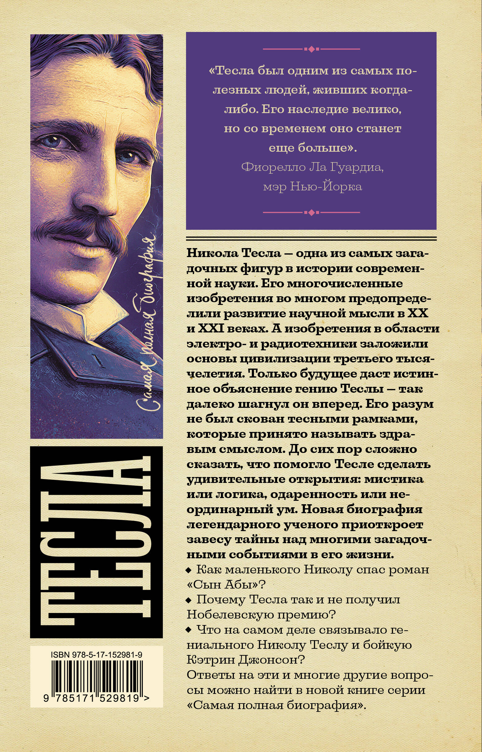 Никола Тесла - один из самых известных и загадочных ученых современности. Всей своей жизнью и трудом он заложил основы новой цивилизации третьего тысячелетия и только будущее даст истинное объяснение явлению Теслы, ибо он шагнул далеко вперед. Его разум не был скован тесными рамками, которые принято называть здравым смыслом. До сих пор сложно сказать, что помогло ему сделать свои величайшие открытия в мире: мистика или логика, одаренность или неординарный ум. Вся биография изобретателя овеяны легендами. Как маленького Николу спас роман "Сын Абы"? Почему Тесла так и не получил Нобелевскую премию? Что на самом деле связывало гениального Николу Тесла и бойкую Кэтрин Джонсон? Ответы на эти и многие другие вопросы можно найти в новой книге серии "Самая полная биография".| Издательство | ИЗДАТЕЛЬСТВО "АСТ" |
