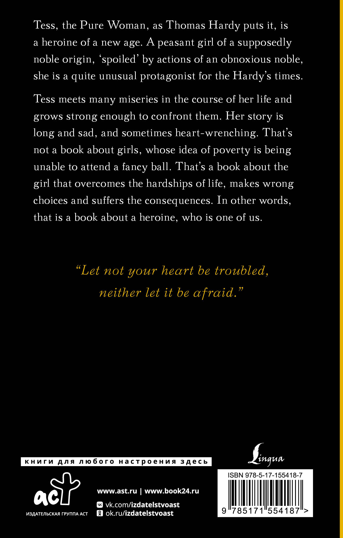 Устали от драмы вокруг? Найдите убежище в классической английской драме! Томас Гарди - английский писатель-романист XIX-XX вв. Его романы "Тэсс из рода д'Эрбервиллей", "Вдали от обезумевшей толпы", "Джуд Незаметный" и многие другие снискали давнее признание и обрели множество экранизаций. "Тэсс" рассказывает о трагической судьбе крестьянской девушки, принадлежавшей к древнему рыцарскому роду. Но вместе с благородным происхождением Тесс обрела и много бед. Книга издана в неадаптированной версии. Наслаждайтесь изысканным английским языком Томаса Гарди в оригинале!| Издательство | ИЗДАТЕЛЬСТВО "АСТ" |