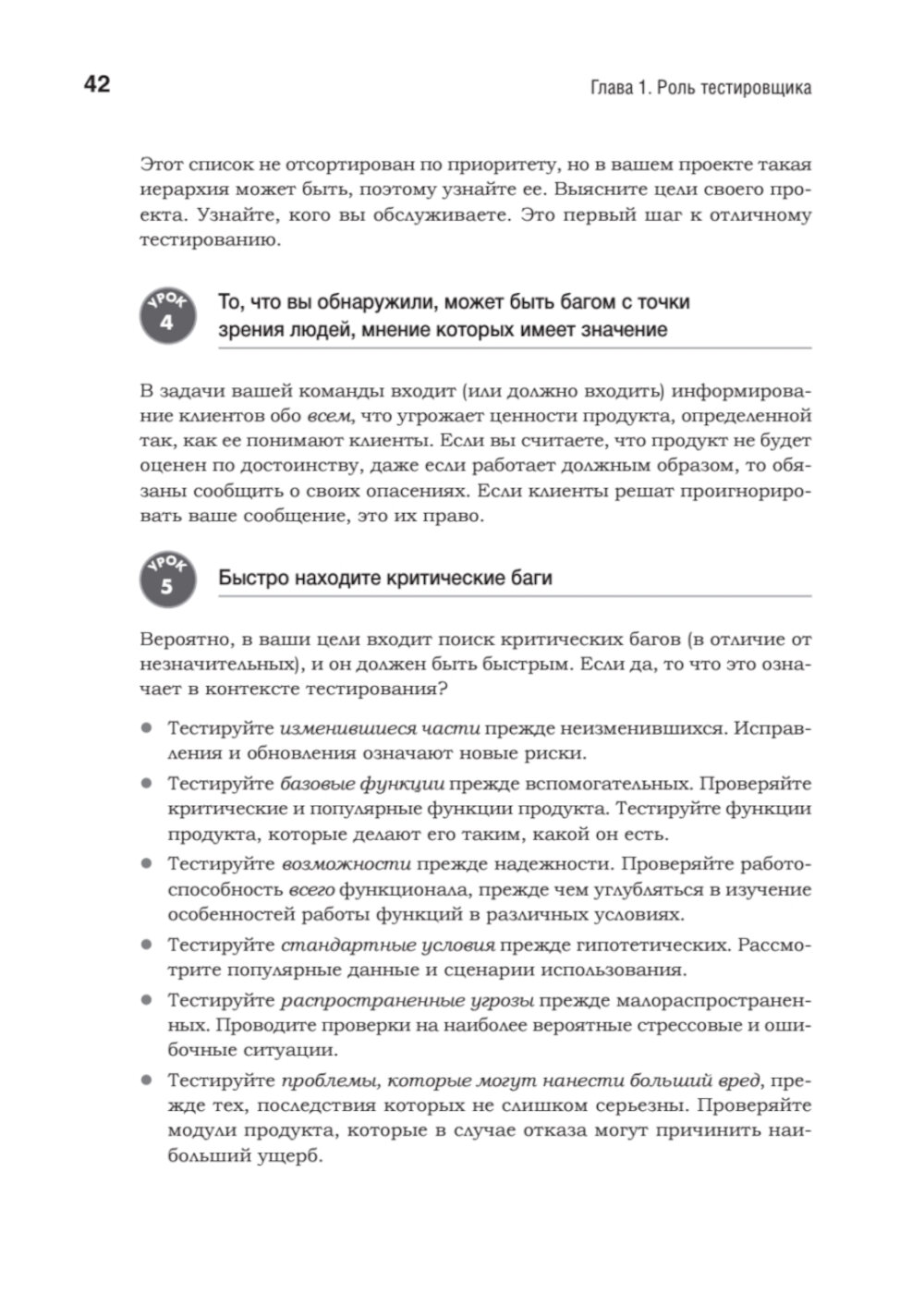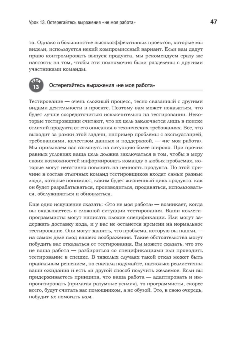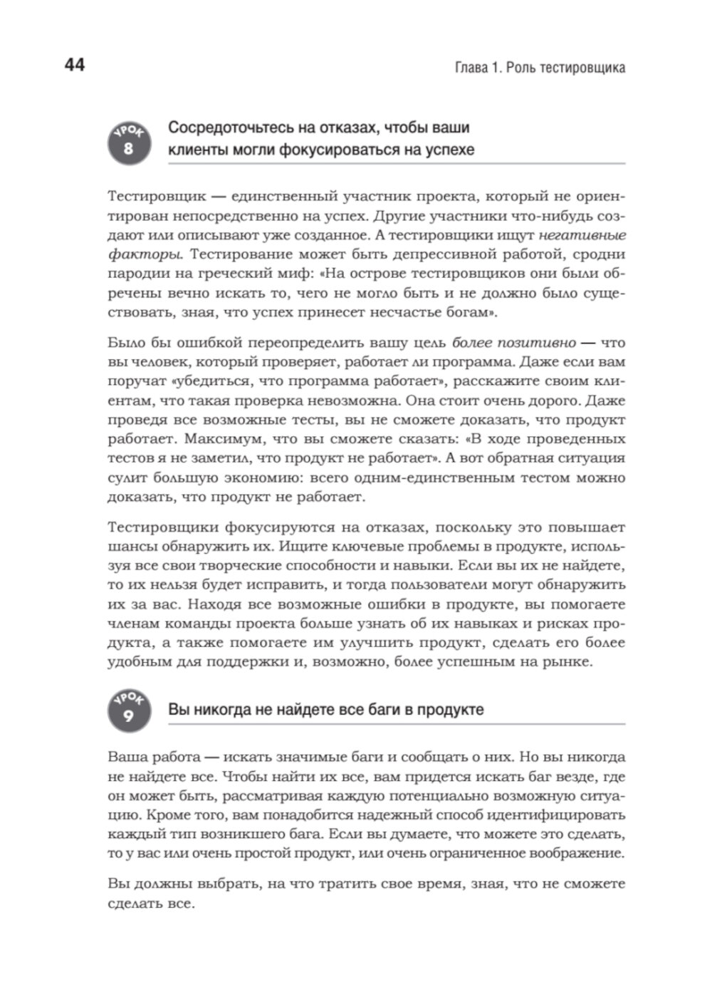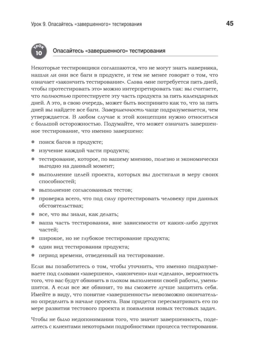 Хорошими тестировщиками не рождаются - ими становятся благодаря упорному труду и постоянному общению. На этом пути таится множество ловушек, способных сорвать самые смелые планы и привести к отставанию проектов от графика. Кем Кейнер, Джеймс Бах и Брет Петтикорд очень хорошо об этом знают. За их плечами более 50 лет опыта, и они понимают, что необходимо для достижения успеха в тестировании. Они собрали 293 проверенных совета, которые вы можете использовать в своих проектах. Каждый урок начинается с утверждения, относящегося к тестированию программного обеспечения, за которым следует объяснение или пример, показывающий, как, когда и почему применяется этот урок.| Издательство | Питер |