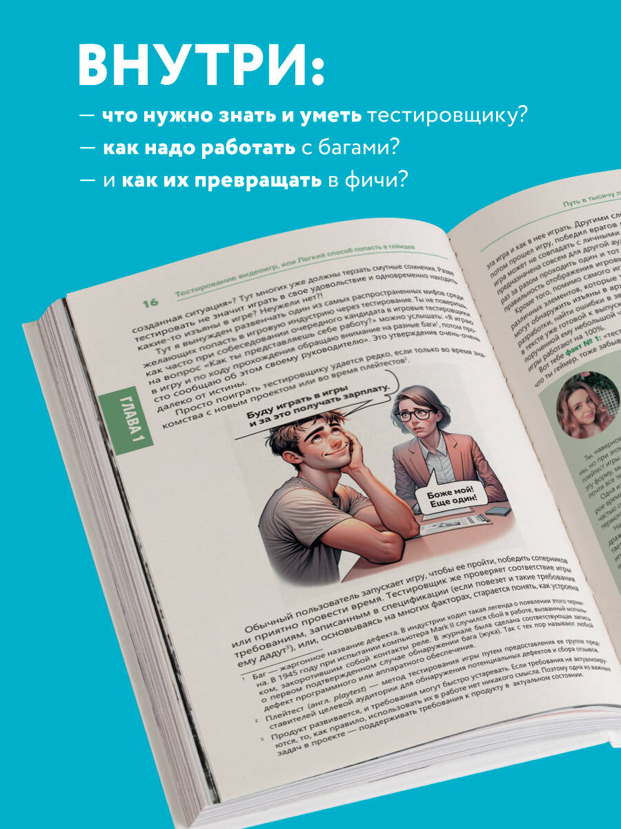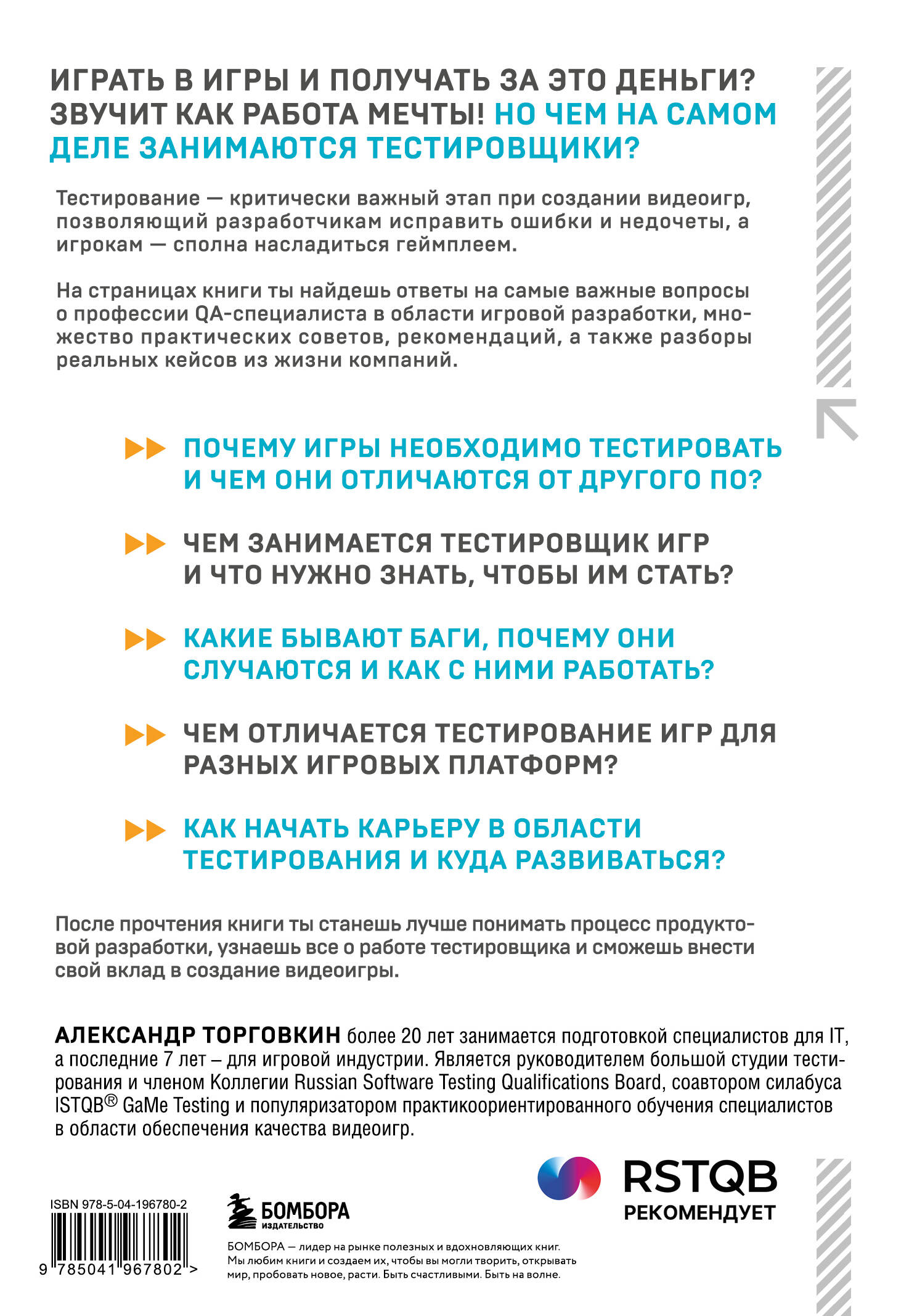 Играть в игры и получать за это деньги? Звучит как работа мечты! Но чем на самом деле занимаются тестировщики? Тестирование - критически важный этап при создании видеоигр, позволяющий разработчикам исправить ошибки и недочеты, а игрокам - сполна насладиться геймплеем. На страницах книги ты найдешь ответы на самые важные вопросы о профессии QA-специалиста в области игровой разработки, множество практических советов, рекомендаций, а также разборы реальных кейсов из жизни компаний. • Почему игры необходимо тестировать и чем они отличаются от другого ПО? • Чем занимается тестировщик игр и что нужно знать, чтобы им стать? • Какие бывают баги, почему они случаются и как с ними работать? • Чем отличается тестирование игр для разных игровых платформ? • Как начать карьеру в области тестирования и куда развиваться? После прочтения книги ты станешь лучше понимать процесс продуктовой разработки, узнаешь все о работе тестировщика и сможешь внести свой вклад в создание видеоигры. Об авторе Александр Торговкин более 20 лет занимается подготовкой специалистов для IT, а последние 7 лет - для игровой индустрии. Является руководителем большой студии тестирования и членом Коллегии Russian Software Testing Qulifications Board, соавтором силабуса ISTQB® GaMe Testing и популяризатором практикоориентированного обучения специалистов в области обеспечения качества видеоигр.| Издательство | ООО "Издательство "Эксмо" |