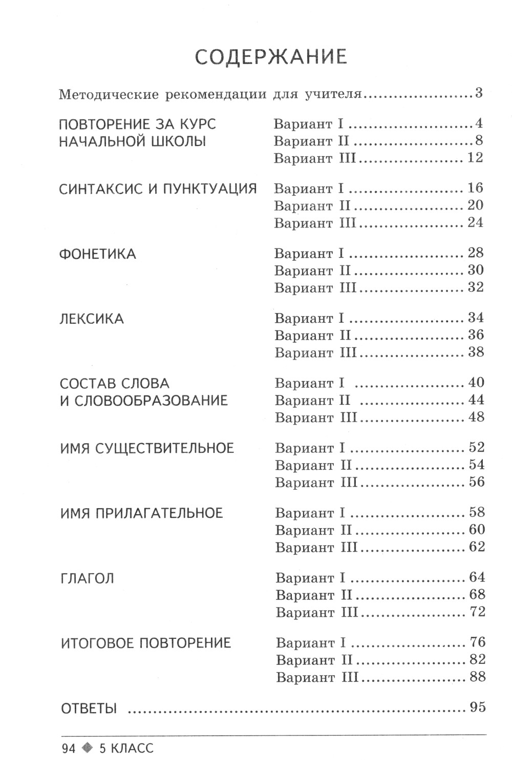 Тестовые задания, составленные на основе стабильного учебника русского языка для 5-го класса (авторы Т.А. Ладыженская и др.), предназначены для итогового контроля знаний учащихся по всем темам программы. В пособии учитывается разный уровень знаний, умений и навыков учащихся: I и II варианты тестовых заданий соответствуют базовому уровню, III вариант - повышенной трудности. Тестовые задания проверены в практике обучения.| Издательство | Творческий центр Сфера |