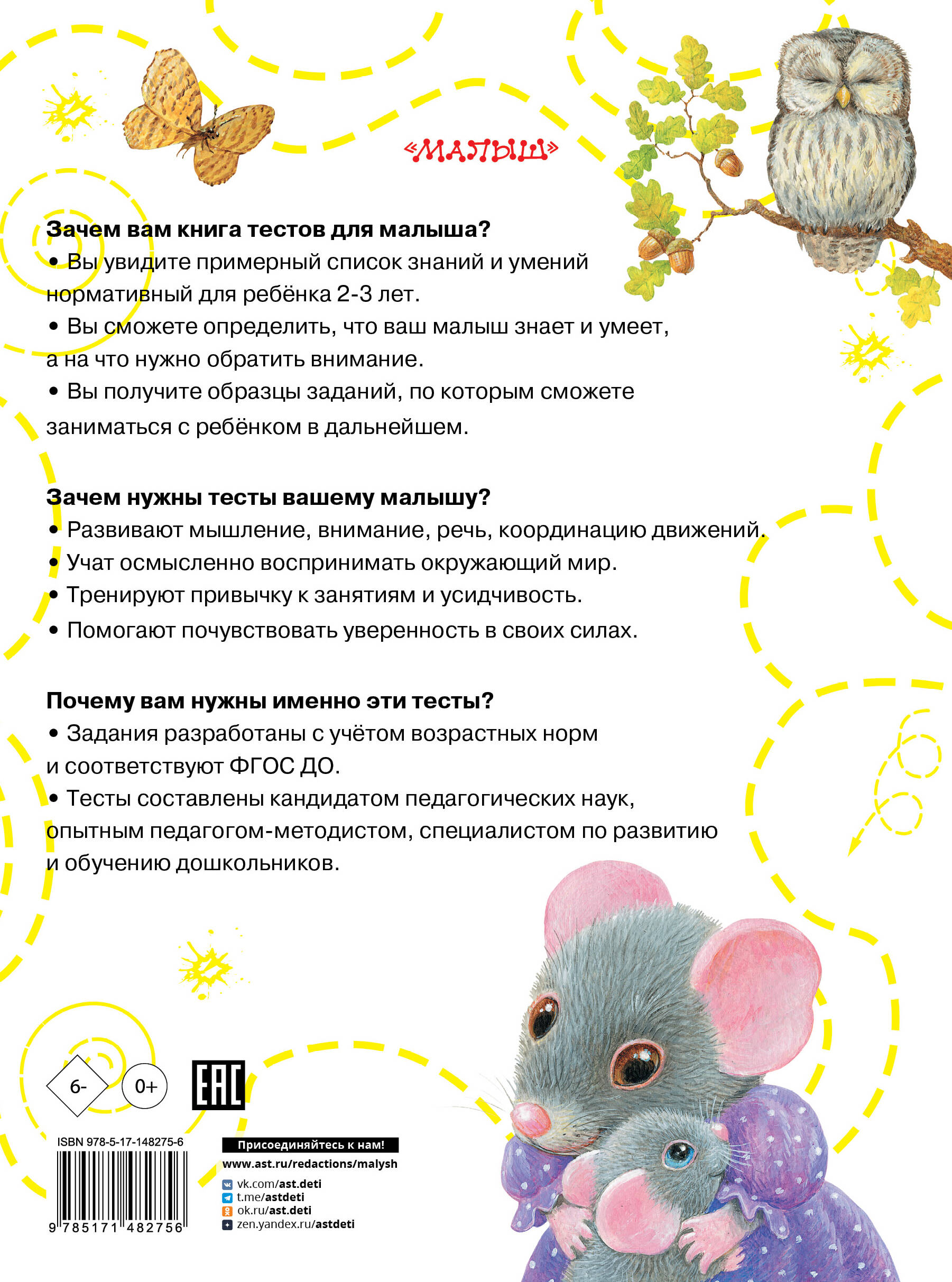 Зачем вам книга тестов для малыша? • Вы увидите примерный список знаний и умений нормативный для ребёнка 2-3 лет. • Вы сможете определить, что ваш малыш знает и умеет, а на что нужно обратить внимание. • Вы получите образцы заданий, по которым сможете заниматься с ребёнком в дальнейшем. Зачем нужны тесты вашему малышу? • Развивают мышление, внимание, речь, координацию движений. • Учат осмысленно воспринимать окружающий мир. • Тренируют привычку к занятиям и усидчивость. • Помогают почувствовать уверенность в своих силах. Почему вам нужны именно эти тесты? • Задания разработаны с учётом возрастных норм и соответствуют ФГОС ДО. • Тесты составлены кандидатом педагогических наук, опытным педагогом-методистом, специалистом по развитию и обучению дошкольников.| Издательство | АСТ |