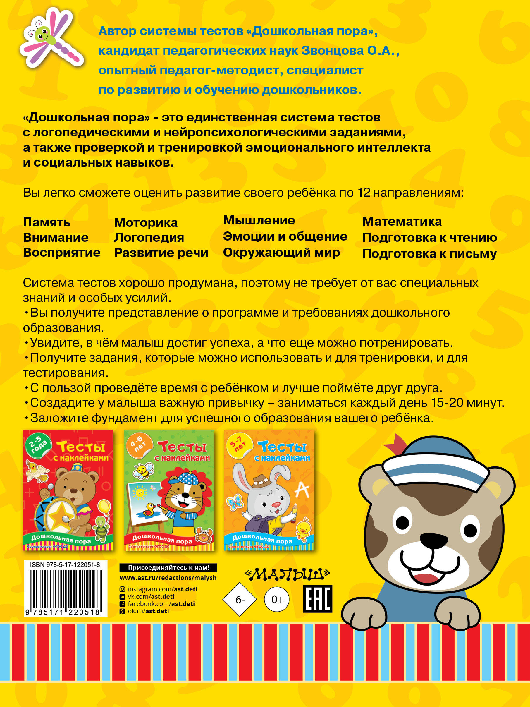 "Дошкольная пора" - система тестов, по которой любой родитель может проверить, что его ребёнку хорошо удается, а над чем ещё можно поработать. Автор книг-тестов - кандидат педагогических наук Звонцова О. А., опытный педагог и специалист по развивающему обучению. В книгах тестов увлекательные вопросы и творческие задания объединены с логопедическими и нейропсихологическими упражнениями, а также проверкой и тренировкой эмоционального интеллекта и социальных навыков. Наклейки увлекают и мотивируют ребёнка к занятиям. В конце книги есть специальный сертификат, который можно подписать и вручить ребенку, как официальную награду за хорошо проделанную работу. Для дошкольного возраста.