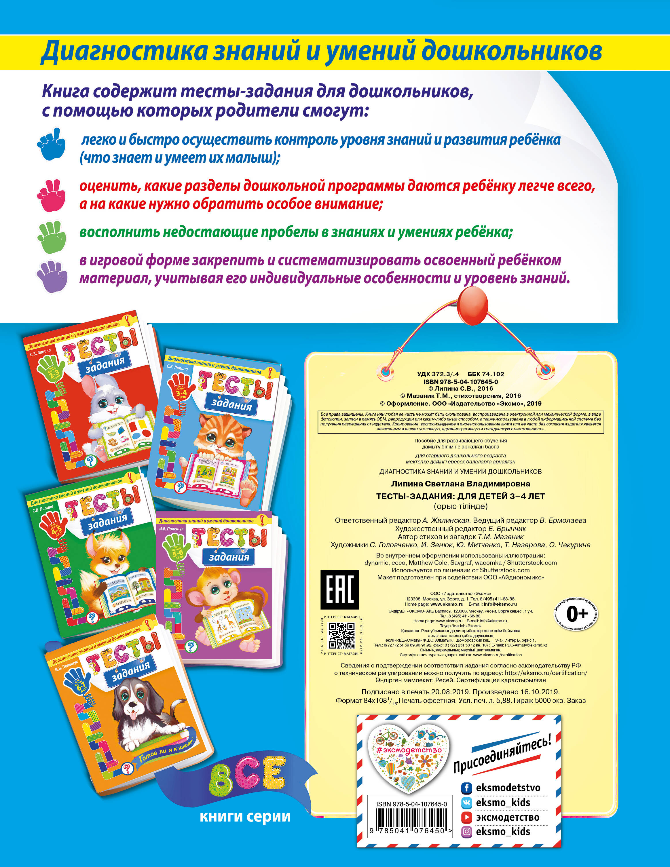 Пособие представляет собой тестовые задания для диагностики знаний и умений ребенка 3 - 4 лет с интересными интерактивными упражнениями, направленными на его интеллектуальное развитие. Солнышко и тучка подскажут, насколько успешно ребенок справился с заданием, а полезные советы в конце книги помогут понять, чем еще можно и нужно с ним заниматься. Игровые задания и яркие красочные картинки понравятся ребенку, он будет с удовольствием играть, а заодно развивать интеллект, внимание, память, речь, воображение, мышление и мелкую моторику.| Издательство | Эксмо |