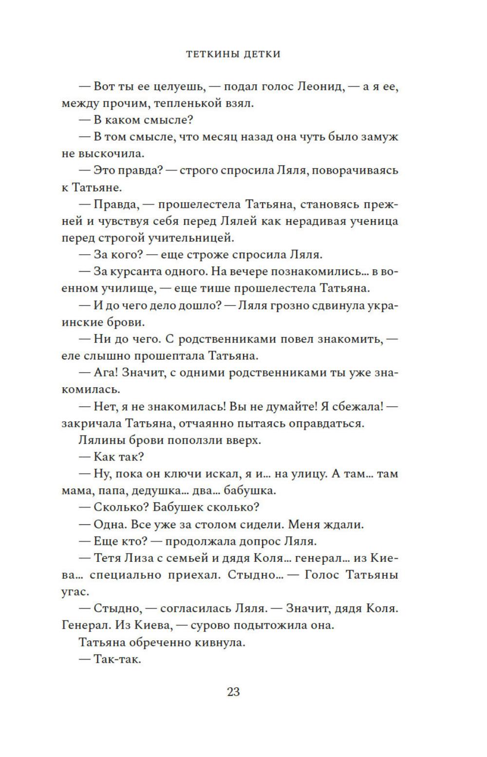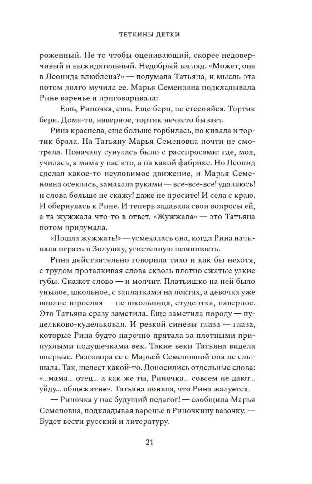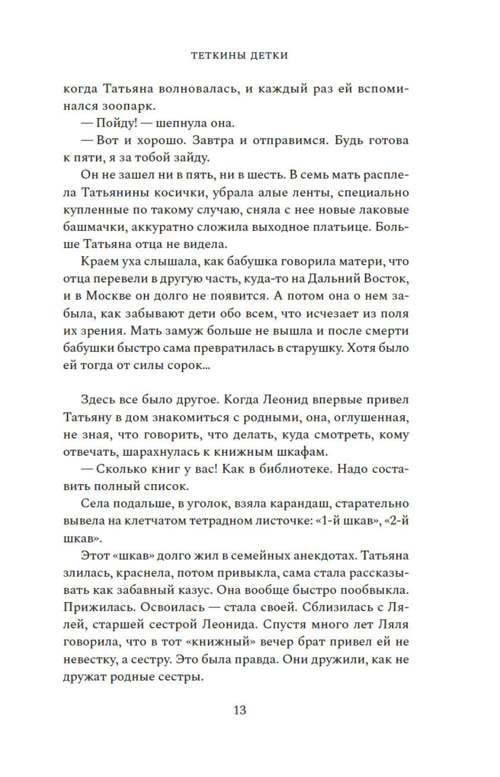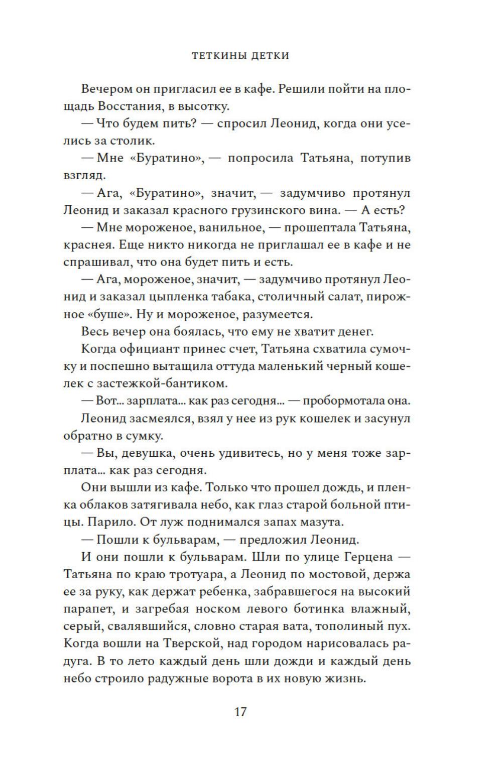 «Теткины детки» - роман, идеально вписывающийся в жанр семейной истории. Причем семья, о которой идет речь, не похожа ни на одну другую, - как тут не вспомнить Толстого, с его одинаково счастливыми и несчастливыми по-своему семьями! Татьяна, главная героиня книги, выйдя замуж, оказывается в большой, шумной, пестрой семье. Это семейство ей не сразу понятно - жизнь здесь совсем непохожа на их с мамой тихое размеренное существование вдвоем. Но вскоре она начинает понимать, что в жизни большого клана, где все словно играют раз и навсегда отведенные роли, есть определенные законы и наблюдать за ними по крайней мере интересно. С годами она становится частью этого клана, где ссорятся, мирятся, даже сплетничают и возводят напраслину. Но никогда не оставляют без поддержки и тепла.| Издательство | Азбука |
