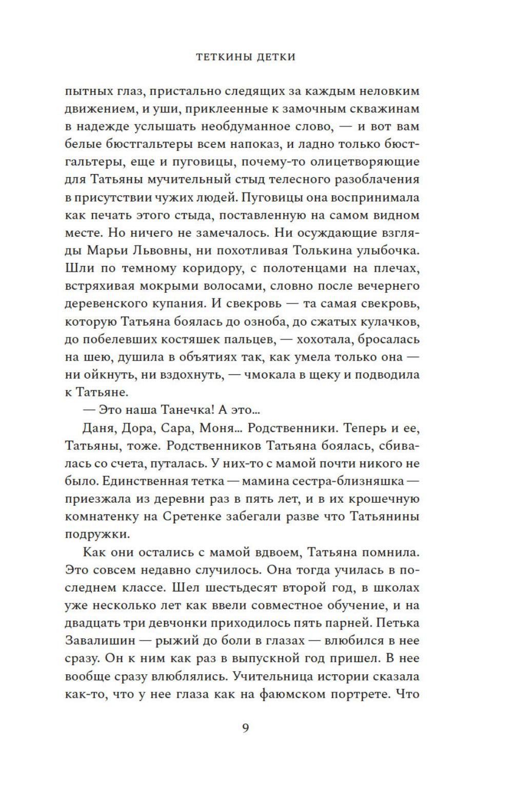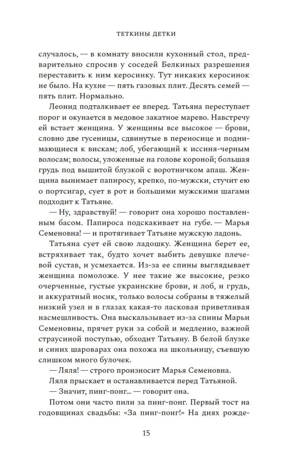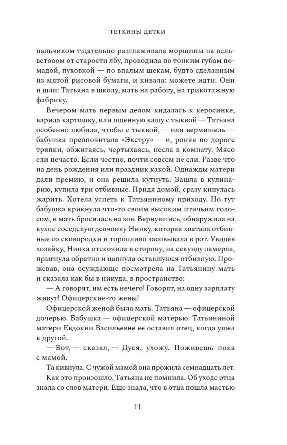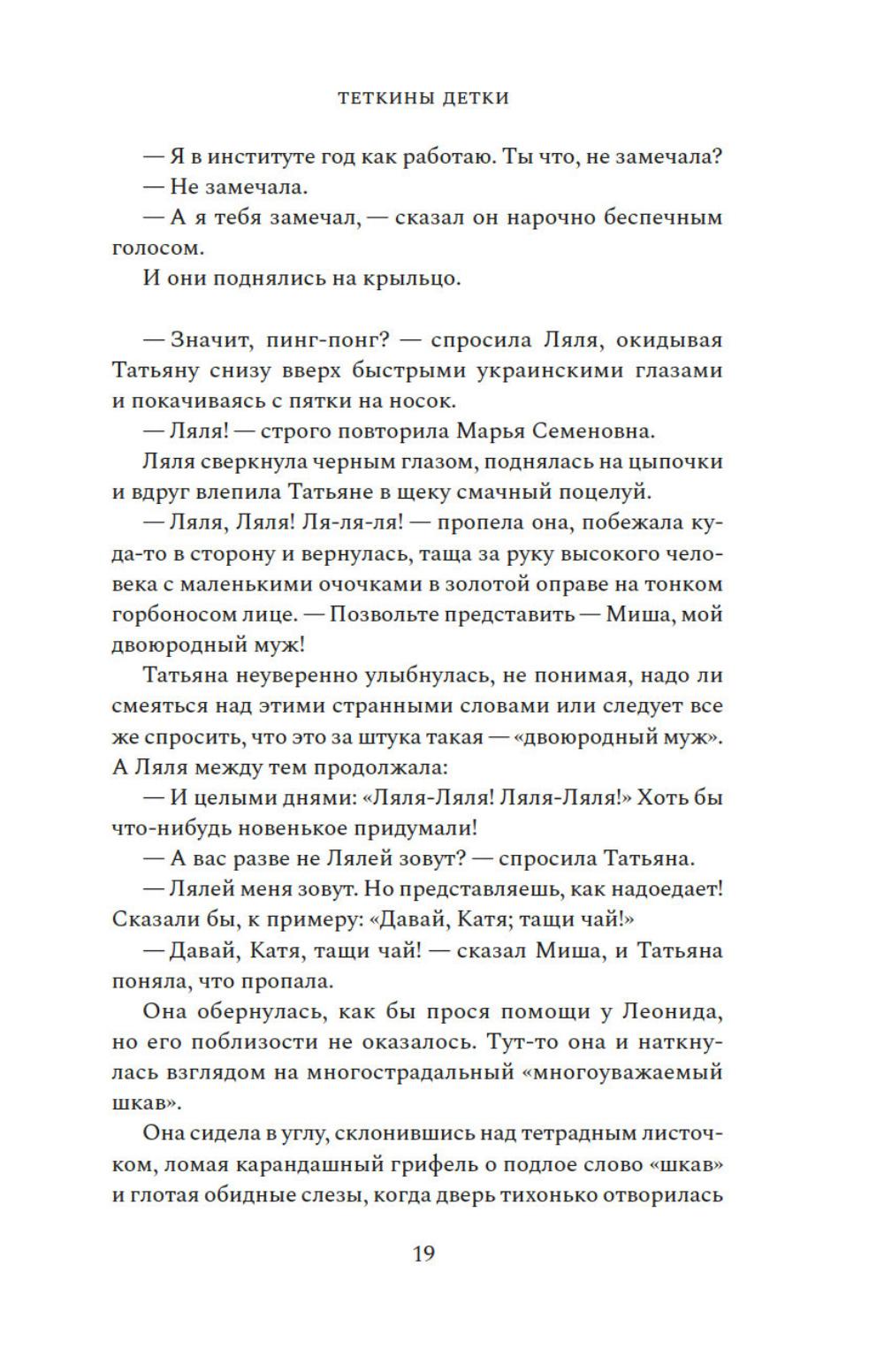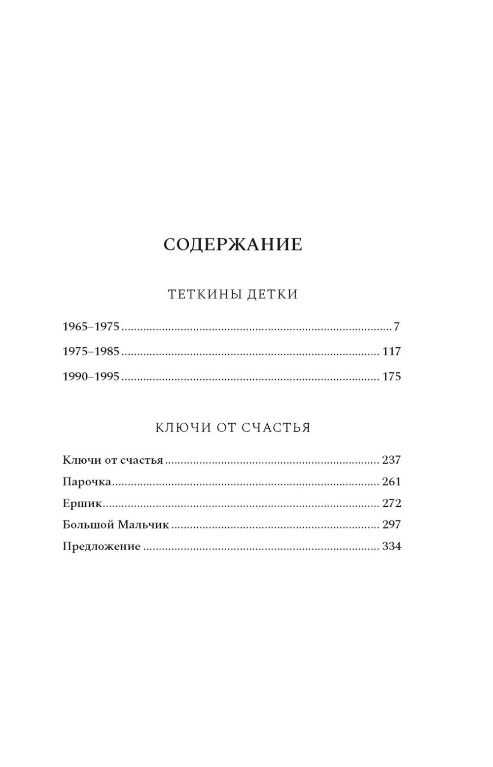 «Теткины детки» - роман, идеально вписывающийся в жанр семейной истории. Причем семья, о которой идет речь, не похожа ни на одну другую, - как тут не вспомнить Толстого, с его одинаково счастливыми и несчастливыми по-своему семьями! Татьяна, главная героиня книги, выйдя замуж, оказывается в большой, шумной, пестрой семье. Это семейство ей не сразу понятно - жизнь здесь совсем непохожа на их с мамой тихое размеренное существование вдвоем. Но вскоре она начинает понимать, что в жизни большого клана, где все словно играют раз и навсегда отведенные роли, есть определенные законы и наблюдать за ними по крайней мере интересно. С годами она становится частью этого клана, где ссорятся, мирятся, даже сплетничают и возводят напраслину. Но никогда не оставляют без поддержки и тепла.| Издательство | Азбука |