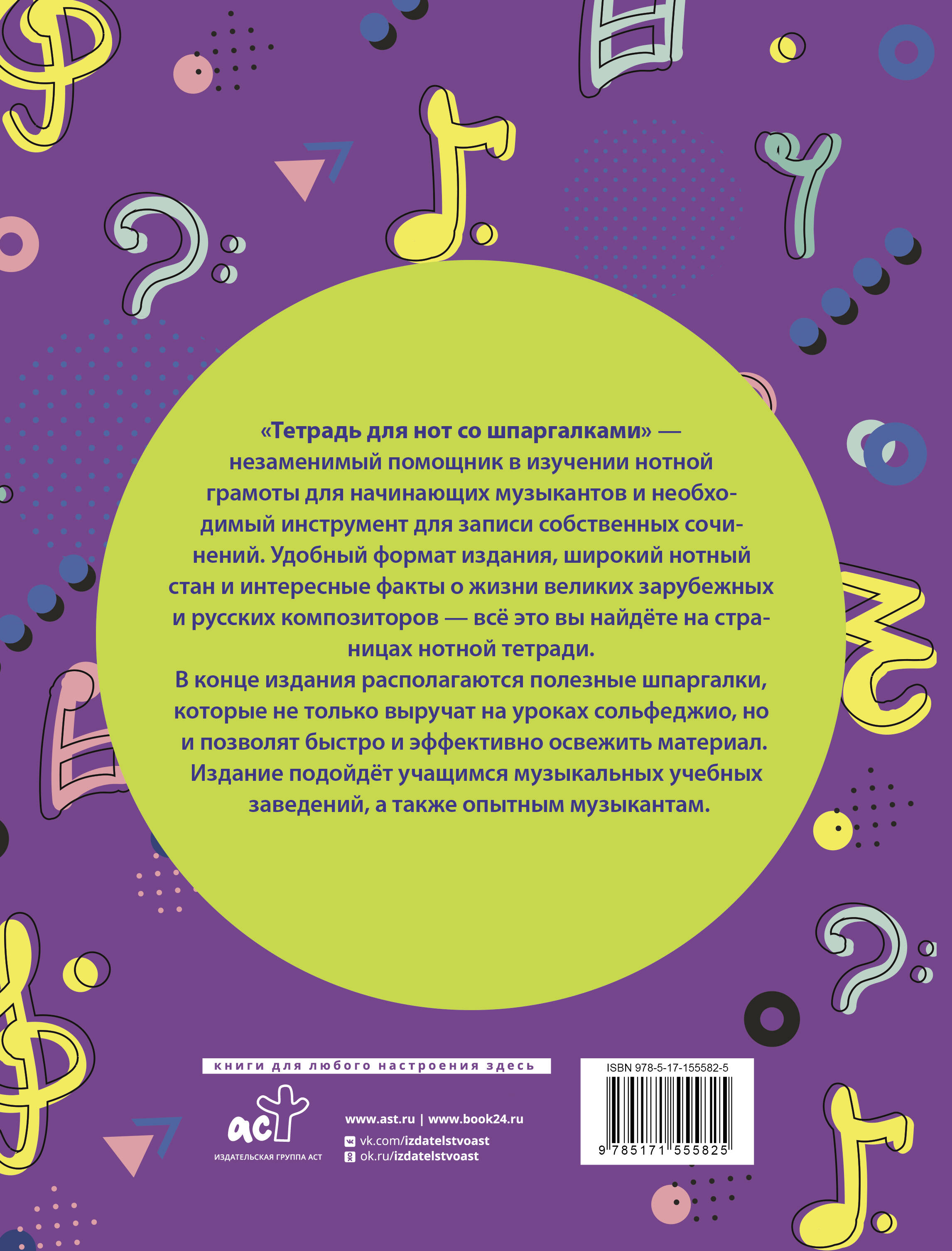 Что может быть общего у писателя и музыканта? Им нужна тетрадь, чтобы сохранить свои идеи, не потерять их! Но как же быть: тетради, которыми пользуются писатели, не подходят музыкантам. "Тетрадь для нот со шпаргалками" - незаменимый помощник в изучении нотной грамоты для начинающих музыкантов и необходимый инструмент для записи собственных сочинений. Удобный формат издания, широкий стан и факты о жизни великих зарубежных и русских композиторов на каждом развороте делают его универсальным. В конце нотной тетради располагаются полезные шпаргалки, которые не только выручат на уроках сольфеджио, но и позволят быстро и эффективно освежить материал. Издание подойдёт учащимся музыкальных учебных заведений, а также опытным музыкантам.| Издательство | ИЗДАТЕЛЬСТВО "АСТ" |