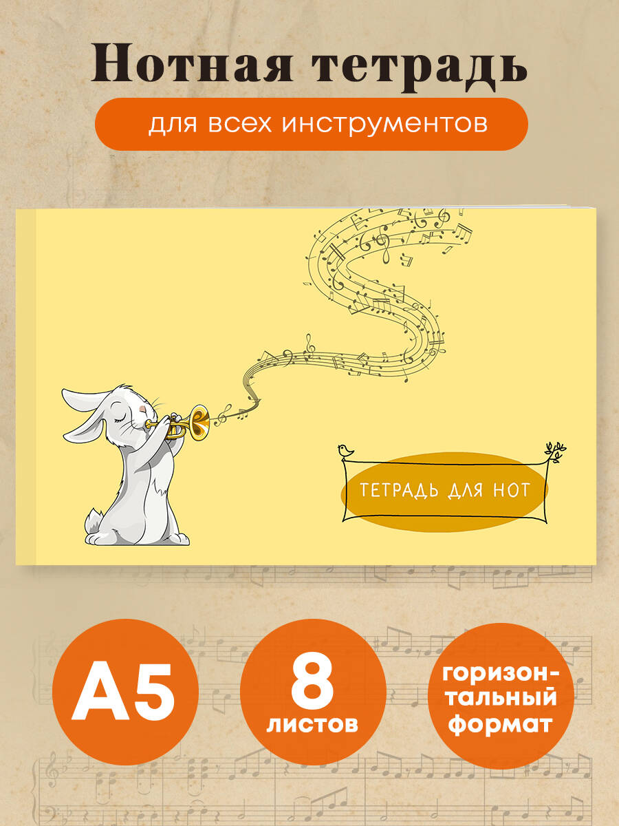 Тетрадь для нот. Зайчик (8 л., А5, горизонтальная, скрепка)