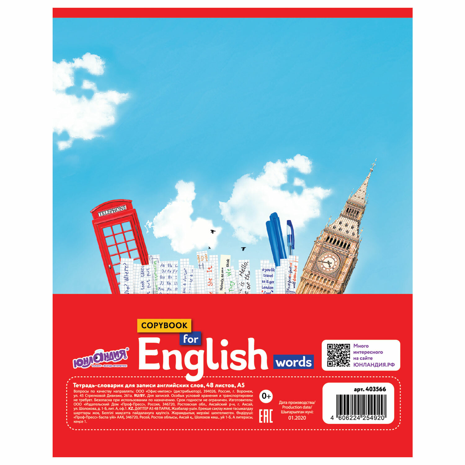 Тетрадь-словарь для записи английских слов. Юнландия, А5, 48 листов, клетки