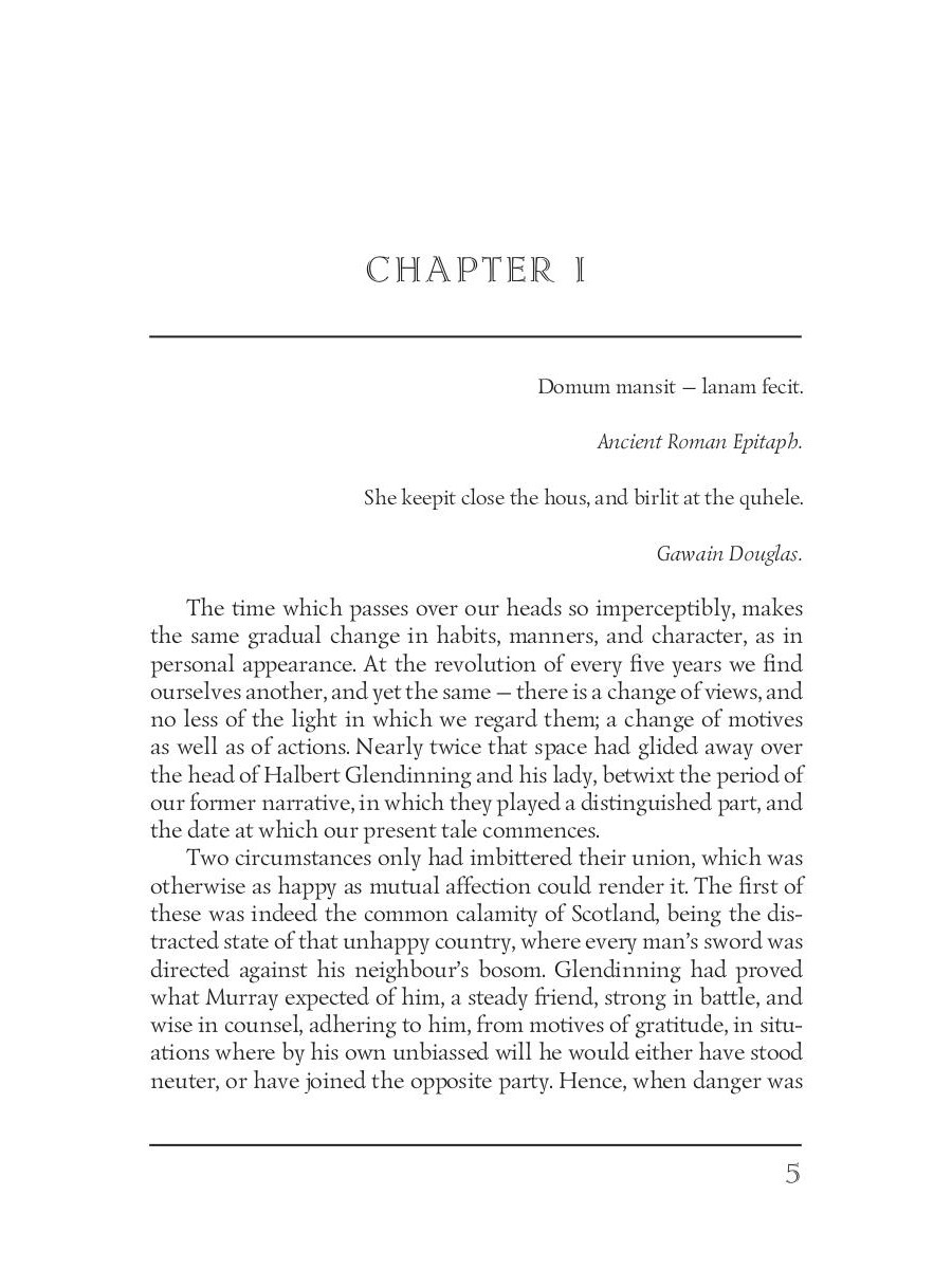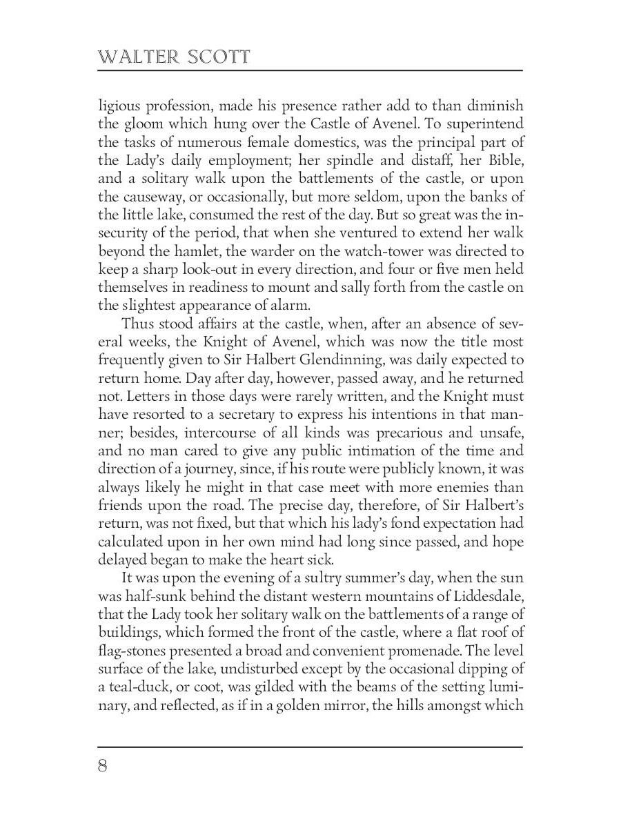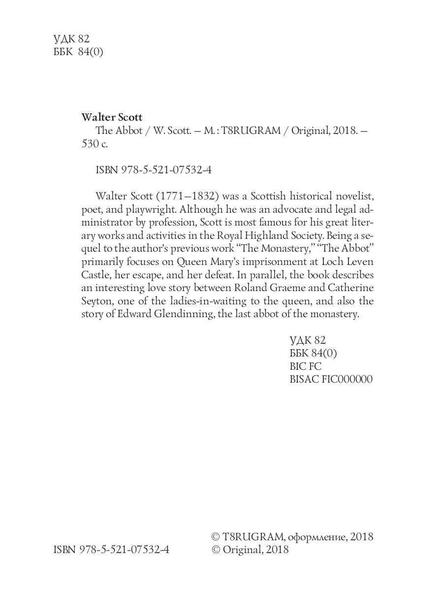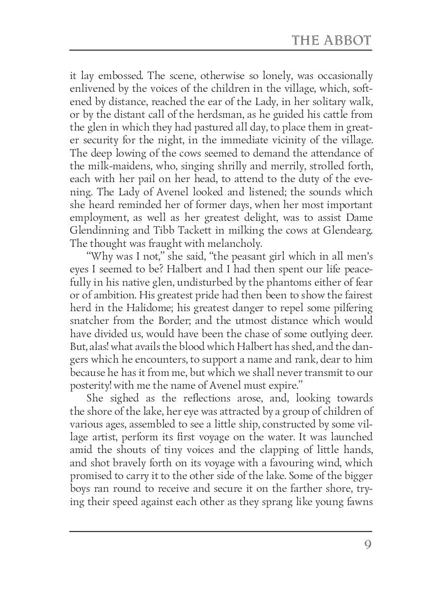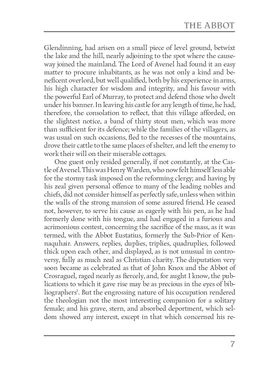 Walter Scott (1771-1832) was a Scottish historical novelist, poet, and playwright. Although he was an advocate and legal administrator by profession, Scott is most famous for his great literary works and activities in the Royal Highland Society. Being a sequel to the author's previous work "The Monastery", "The Abbot" primarily focuses on Queen Mary's imprisonment at Loch Leven Castle, her escape, and her defeat. In parallel, the book describes an interesting love story between Roland Graeme and Catherine Seyton, one of the ladies-in-waiting to the queen, and also the story of Edward Glendinning, the last abbot of the monastery.