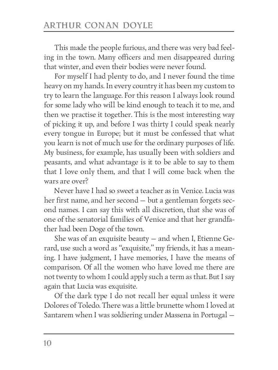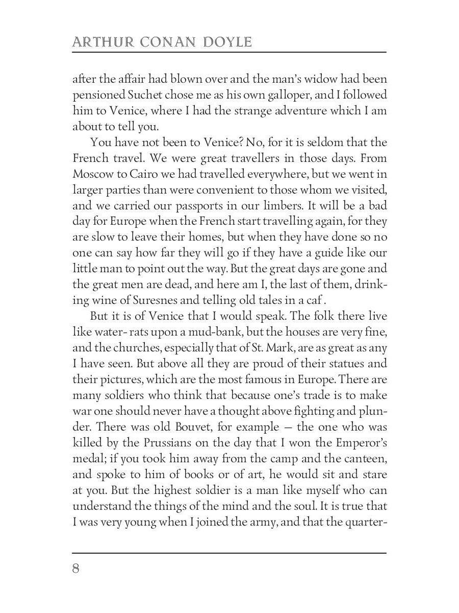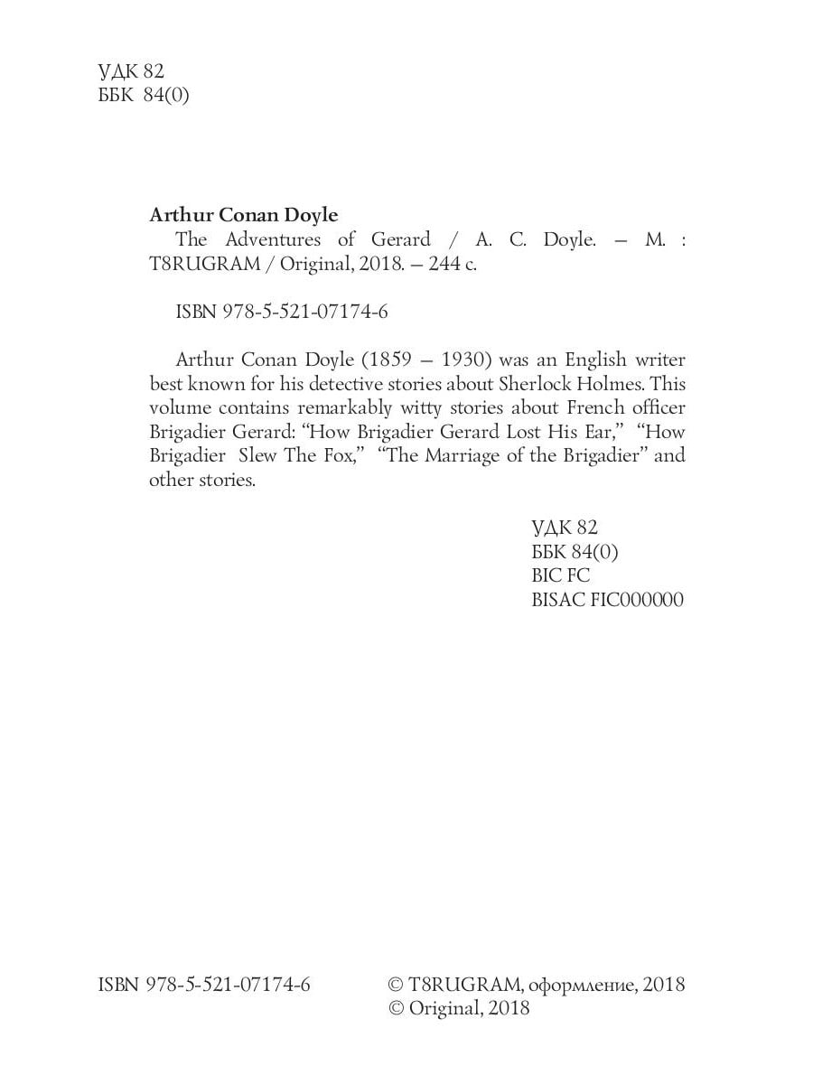 Arthur Conan Doyle (1859 - 1930) was an English writer best known for his detective stories about Sherlock Holmes. This volume contains remarkably witty stories about French officer Brigadier Gerard: "How Brigadier Gerard Lost His Ear," "How Brigadier Slew The Fox," "The Marriage of the Brigadier" and other stories.| Издательство | Т8 RUGRAM |