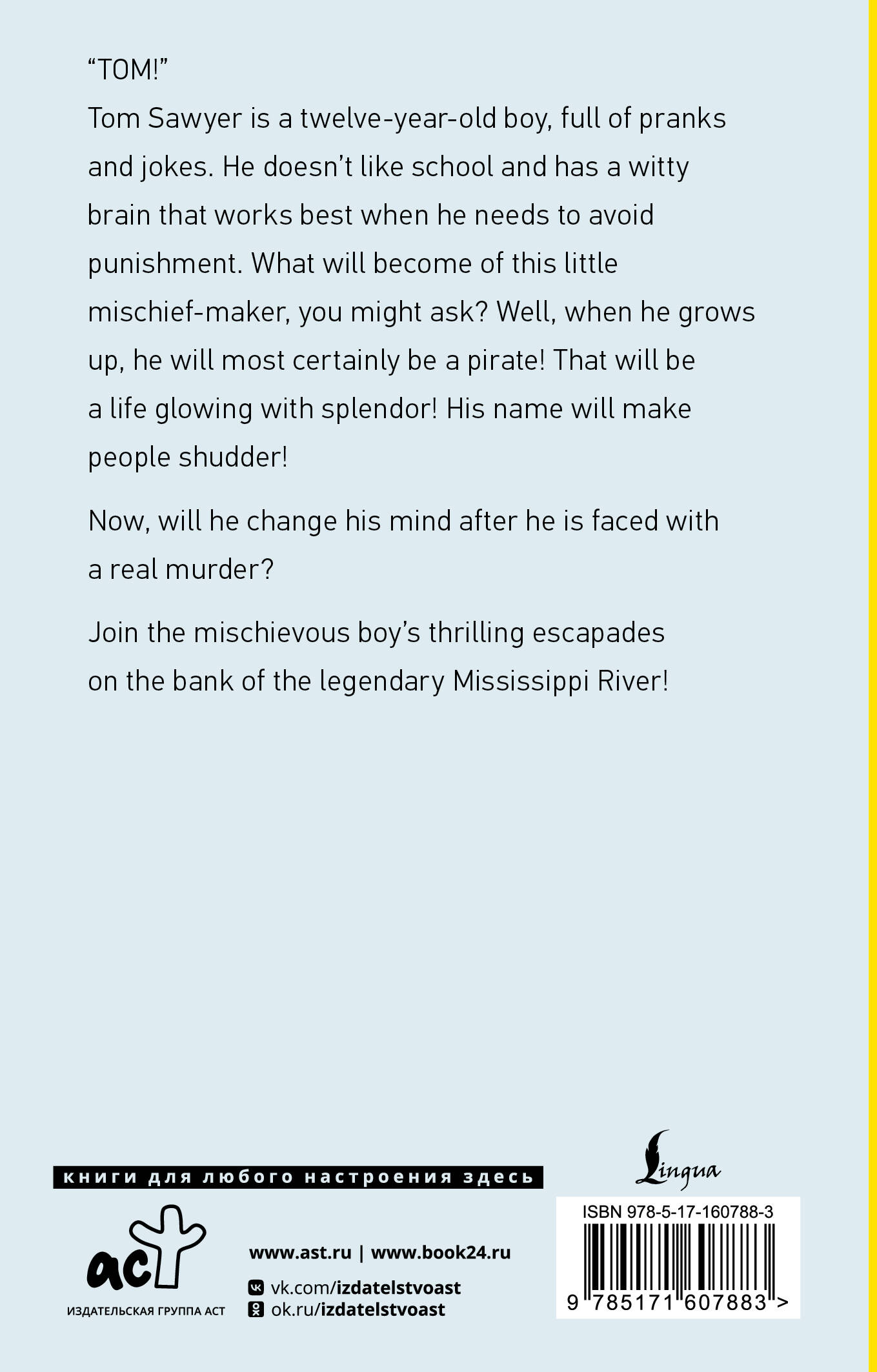 Тому Сойеру двенадцать, и он страстно любит жизнь, игры и шалости - а не школу и не правила, ведь ни в правилах, ни в школе нет жизни. А еще у него острый ум, который особенно пригождается, когда нужно избежать наказания или подшутить над друзьями. Что же из него выйдет, спросите вы? О, когда он вырастет, Том определенно станет пиратом! Вот в чем настоящее величие и слава! Трепещите - у штурвала Том Соейр, гроза морей! Но вот у него на глазах убивают человека, и шалопай Том встаёт перед выбором, который испугал бы любого взрослого. Следите за приключениями Тома Сойера и его лучшего друга Гекльберри Финна в книге, полюбившейся многим поколениям читателей по всему миру! Насладитесь богатым и красочным языком Марка Твена без адаптации и сокращений!| Издательство | Издательство "АСТ" |