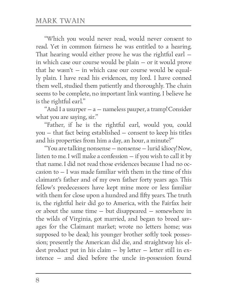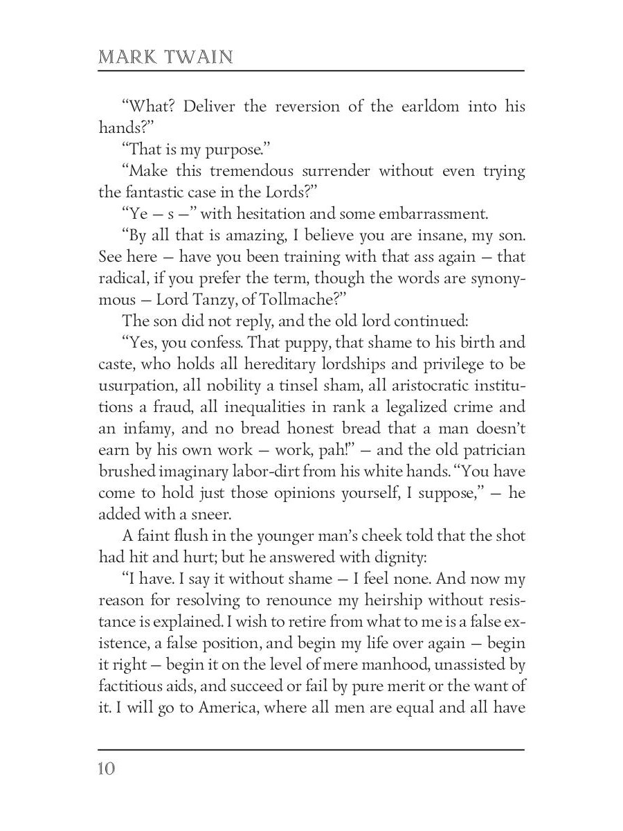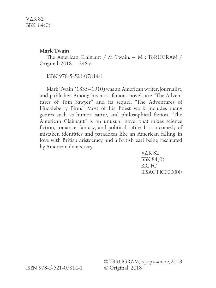 Mark Twain (1835-1910) was an American writer, journalist, and publisher. Among his most famous novels are "The Adventures of Tom Sawyer" and its sequel, "The Adventures of Huckleberry Finn." Most of his finest work includes many genres such as humor, satire, and philosophical fiction. "The American Claimant" is an unusual novel that mixes science fiction, romance, fantasy, and political satire. It is a comedy of mistaken identities and paradoxes like an American falling in love with British aristocracy and a British earl being fascinated by American democracy.| Издательство | Т8 RUGRAM |
