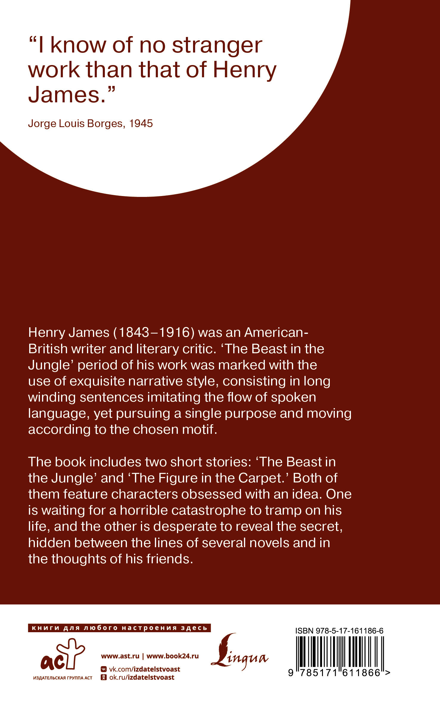 Генри Джеймс (1843 -1916) - американский писатель и литературный критик. Поздний период его творчества - к которому относятся в том числе заглавные рассказы этого сборника - характеризуется замысловатым и неординарным стилем повествования. Длинные витиеватые предложения имитируют течение устной речи, по спирали единого мотива уводя читателя к центру смыслового водоворота. Сборник включает два рассказа Генри Джеймса: "The Beast in the Jungle" и "The Figure in the Carpet". В центре каждого из них находится персонаж, одержимый идеей: один живет в предчувствии катастрофы, которая должна разрушить его жизнь; второй ищет разгадку тайны, спрятанную между строк романов. Рассказы публикуются на английском языке без адаптации и сокращений.| Издательство | Издательство "АСТ" |