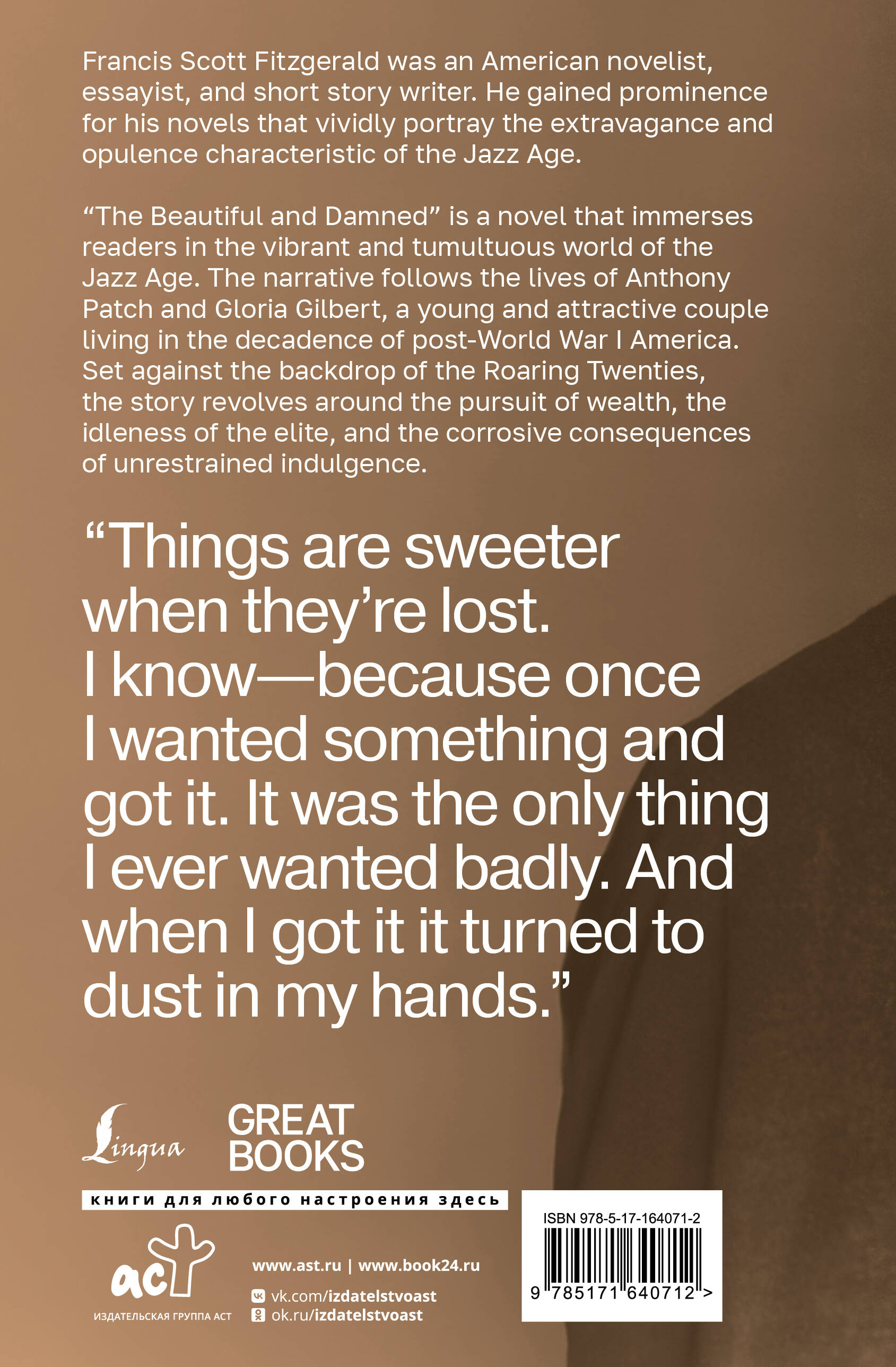 Фрэнсис Скотт Фицджеральд - талантливый американский писатель ХХ века. Он является ярким представителем "потерянного поколения" в литературе. "Прекрасные и проклятые" - роман Фицджеральда, который был опубликован в 1922 году. В нём писатель описывает век джаза и дух того времени. Автор задается вопросами о ценностях и стремлениях людей, а также исследует не только пустоту и тленность быстрого достижения благосостояния, но и борется с моральными дилеммами своих персонажей. История повествует о жизни Энтони Пэтча и Глории Гилберт. Главные герои стремятся к беспечной жизни, полагаясь на своё социальное положение, но сталкиваются лицом к лицу с вызовами судьбы и собственной нравственной деградацией. Роман представлен в оригинале. Насладитесь историей прекрасных, но проклятых Энтони и Глории без адаптации и сокращений!| Издательство | Издательство "АСТ" |